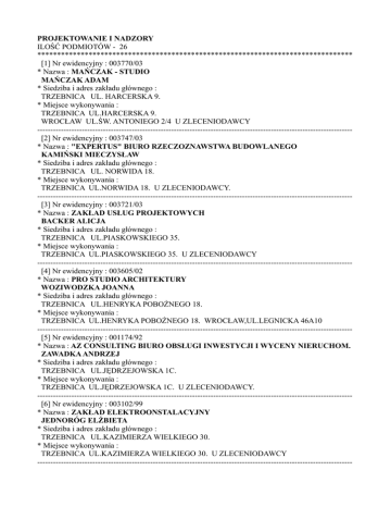 PROJEKTOWANIE I NADZORY ILOŚĆ PODMIOTÓW - 26 ******************************************************************************** [1] Nr ewidencyjny : 003770/03 * Nazwa : MAŃCZAK - STUDIO MAŃCZAK ADAM * Siedziba i adres zakładu głównego : TRZEBNICA UL. HARCERSKA 9. * Miejsce wykonywania : TRZEBNICA UL.HARCERSKA 9. WROCŁAW UL.ŚW. ANTONIEGO 2/4 U ZLECENIODAWCY -----------------------------------------------------------------------------------------------------------------------[2] Nr ewidencyjny : 003747/03 * Nazwa : "EXPERTUS" BIURO RZECZOZNAWSTWA BUDOWLANEGO KAMIŃSKI MIECZYSŁAW * Siedziba i adres zakładu głównego : TRZEBNICA UL. NORWIDA 18. * Miejsce wykonywania : TRZEBNICA UL.NORWIDA 18. U ZLECENIODAWCY. -----------------------------------------------------------------------------------------------------------------------[3] Nr ewidencyjny : 003721/03 * Nazwa : ZAKŁAD USŁUG PROJEKTOWYCH BACKER ALICJA * Siedziba i adres zakładu głównego : TRZEBNICA UL.PIASKOWSKIEGO 35. * Miejsce wykonywania : TRZEBNICA UL.PIASKOWSKIEGO 35. U ZLECENIODAWCY -----------------------------------------------------------------------------------------------------------------------[4] Nr ewidencyjny : 003605/02 * Nazwa : PRO STUDIO ARCHITEKTURY WOZIWODZKA JOANNA * Siedziba i adres zakładu głównego : TRZEBNICA UL.HENRYKA POBOŻNEGO 18. * Miejsce wykonywania : TRZEBNICA UL.HENRYKA POBOŻNEGO 18. WROCŁAW,UL.LEGNICKA 46A10 -----------------------------------------------------------------------------------------------------------------------[5] Nr ewidencyjny : 001174/92 * Nazwa : AZ CONSULTING BIURO OBSŁUGI INWESTYCJI I WYCENY NIERUCHOM. ZAWADKA ANDRZEJ * Siedziba i adres zakładu głównego : TRZEBNICA UL.JĘDRZEJOWSKA 1C. * Miejsce wykonywania : TRZEBNICA UL.JĘDRZEJOWSKA 1C. U ZLECENIODAWCY. -----------------------------------------------------------------------------------------------------------------------[6] Nr ewidencyjny : 003102/99 * Nazwa : ZAKŁAD ELEKTROONSTALACYJNY JEDNORÓG ELŻBIETA * Siedziba i adres zakładu głównego : TRZEBNICA UL.KAZIMIERZA WIELKIEGO 30. * Miejsce wykonywania : TRZEBNICA UL.KAZIMIERZA WIELKIEGO 30. U ZLECENIODAWCY ------------------------------------------------------------------------------------------------------------------------ [7] Nr ewidencyjny : 003101/99 * Nazwa : ZAKŁAD ELEKTROINSTALACYJNY JEDNORÓG STANISŁAW * Siedziba i adres zakładu głównego : TRZEBNICA UL.KAZIMIERZA WIELKIEGO 30. * Miejsce wykonywania : TRZEBNICA UL.KAZIMIERZA WIELKIEGO 30. U ZLECENIODAWCY -----------------------------------------------------------------------------------------------------------------------[8] Nr ewidencyjny : 002561/98 * Nazwa : USŁUGI PROJEKTOWE SIELICKA RENATA * Siedziba i adres zakładu głównego : TRZEBNICA UL.WOJSKA POLSKIEGO 2A * Miejsce wykonywania : TRZEBNICA UL.WOJSKA POLSKIEGO 2A U ZLECENIODWACY -----------------------------------------------------------------------------------------------------------------------[9] Nr ewidencyjny : 002458/98 * Nazwa : ZAKŁAD USŁUGOWO-HANDLOWY "RR" JÓŹWIK RYSZARD * Siedziba i adres zakładu głównego : TRZEBNICA UL.TEATRALNA 2A. * Miejsce wykonywania : TRZEBNICA UL.TEATRALNA 2A. U ZLECENIODAWCY. -----------------------------------------------------------------------------------------------------------------------[10] Nr ewidencyjny : 002394/98 * Nazwa : BIURO KONSTRUKCJI MECHANICZNYCH I PRZEMYSŁOWYCH "CADMECH" WIECZORKIEWICZ GRZEGORZ * Siedziba i adres zakładu głównego : TRZEBNICA SKARSZYN 44C/4 . * Miejsce wykonywania : TRZEBNICA SKARSZYN 44C/4,TEREN KRAJU. U ZLECENIODAWCY -----------------------------------------------------------------------------------------------------------------------[11] Nr ewidencyjny : 002248/97 * Nazwa : USŁUGI PROJEKTOWE,BUDOWLANE,NADZORY BUDOWLANE GRZEGOREK WIESŁAW * Siedziba i adres zakładu głównego : TRZEBNICA UL. KOŚCIELNA 53/1. * Miejsce wykonywania : TRZEBNICA UL. KOŚCIELNA 53/1. U ZLECENIODAWCY. -----------------------------------------------------------------------------------------------------------------------[12] Nr ewidencyjny : 002118/96 * Nazwa : BIURO USŁUG PROJEKTOWYCH ,OBSŁUGI INWESTYCYJNEJ I WYKONAWSTWA "BUDWOD" JANICKI WŁADYSŁAW * Siedziba i adres zakładu głównego : TRZEBNICA UL.HARCERSKA 7. * Miejsce wykonywania : TRZEBNICA UL.HARCERSKA 7 -----------------------------------------------------------------------------------------------------------------------[13] Nr ewidencyjny : 001990/96 * Nazwa : PRZEDSIĘBIORSTWO PROJEKTOWO-BUDOWLANE ZARZECZNY ZBIGNIEW * Siedziba i adres zakładu głównego : TRZEBNICA UL.B.CHROBREGO 87 * Miejsce wykonywania : TRZEBNICA UL.B.CHROBREGO 87 U ZLECENIODAWCY. -----------------------------------------------------------------------------------------------------------------------[14] Nr ewidencyjny : 001836/95 * Nazwa : SIECI SANITARNE NOWICKI MARIAN * Siedziba i adres zakładu głównego : TRZEBNICA UL.NOWA 4. * Miejsce wykonywania : TRZEBNICA UL.NOWA 4. U ZLECENIODAWCY -----------------------------------------------------------------------------------------------------------------------[15] Nr ewidencyjny : 001688/94 * Nazwa : "PRO-WO" LECHOWSKI WOJCIECH * Siedziba i adres zakładu głównego : TRZEBNICA UL. REYMONTA 7. * Miejsce wykonywania : TRZEBNICA UL.REYMONTA 7. U ZLECENIODAWCY. -----------------------------------------------------------------------------------------------------------------------[16] Nr ewidencyjny : 001262/92 * Nazwa : SKI-PRO SEREDYŃSKA DARIA * Siedziba i adres zakładu głównego : TRZEBNICA UL.REYMONTA 34. * Miejsce wykonywania : TRZEBNICA UL.REYMONTA 34. POZNAŃ UL.LECHICKA 101 ŚWINOUJŚCIE UL.UZDROWISKOWA 11 KRAKÓW UL.CONRADA 35 WROCŁAW AL.M.KROMERA 16 ŚWINOUJŚCIE UL. CIESZKOWSKIEGO 5 KATOWICE UL. SZYBOWCOWA 1-1A TRZEBNICA UL. KS. BOCHENKA 71 -----------------------------------------------------------------------------------------------------------------------[17] Nr ewidencyj