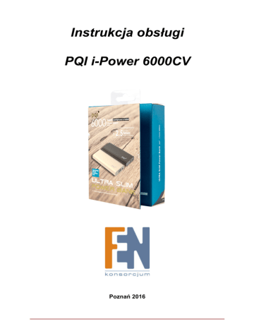 Instrukcja obsługi PQI i-Power 6000CV Poznań 2016 O wartości powerbanka nie świadczy tylko jego pojemność, ale także szereg cech, które sprawiają, że korzystanie z niego jest: łatwiejsze, bardziej wydajne, przyjemniejsze i bezpieczne. Ładny i poręczny PQI 6000cv łatwo się nosi: waży tylko 160g, jest niezwykle cienki i mały. Z łatwością zmieści się w kieszeni lub niewielkiej damskiej torebce. Wykonany został z aluminium co sprawia, że jest elegancki oraz wytrzymały. Aluminium pokryto specjalną powłoką o teksturze skóry, która odróżnia go od wielu innych zimnych w dotyku metalowych wykończeń. Przyjemnie się z niego korzysta. Nowoczesny i wydajny Do jego budowy wykorzystano najnowocześniejsze ogniwa litowopolimerowe przystosowania od ładowania urządzeń mobilnych. Szybko się ładuje, a wyjście o natężeniu max 2,1 A pozwala na ładowanie zarówno telefonów jak i tabletów wszelkich marek. Pojemność ogniw 6000mAh pozwala na naładowanie iPhone 6 dwa i pół raza do pełna. To wystarczy aby zapewnić nam naładowany telefon podczas weekendowego wypadu za miasto. Bezpieczny PQI 6000cv jest bezpieczny w użyciu oraz zapewnia bezpieczeństwo ładowanym urządzeniom. Wyposażono go w 6 zabezpieczeń – przed: zwarciem, przeładowaniem, zbyt dużym rozładowaniem, przegrzaniem oraz przed podawaniem zbyt dużego napięcia lub natężenia do podłączonego urządzenia. Gdyby wszystkie te systemy zawiodły – do powerbanka PQI 6000cv dołączono polisę na 10 milionów dolarów, która chroni przed jego ewentualnym wadliwym działaniem podłączone do niego urządzenia. Importer i dystrybutor: Konsorcjum FEN Sp. z o.o., ul. Dąbrowskiego 273A, 60-406 Poznań e-mail: [email protected]; www.fen.pl Strona2 Główne funkcje: • 4 diody LED informują o stanie naładowania z podziałem co 25% Specyfikacja : Obudowa: aluminium Ogniwa: litowo-polimerowe Pojemność ogniw: 6000mAh Wejście: microUSB 5V 1,5A Wyjście: 1 x USB 5V 2,1A Wymiary: 13,5 x 51,3 x 120 mm. Waga: 161 g. Zawartość opakowania: akumulator Power Bank, Przewód USBmicroUSB. Importer i dystrybutor: Konsorcjum FEN Sp. z o.o., ul. Dąbrowskiego 273A, 60-406 Poznań e-mail: [email protected]; www.fen.pl Strona3 Ładowanie i-Power Ładowanie urządzenia za pomocą zasilacza, przedstawia Diagram 1. Ładowanie urządzenia za pomocą komputera, przedstawia Diagram 2. Podczas ładowania diody LED będą wskazywały poziom naładowania. W momencie kiedy wszystkie cztery diody zgasną, urządzenie będzie naładowane w 100%. Jeżeli i-Power przełączy się w tryb awaryjny z powodu rozładowania, proszę ładować przez 5 min i ponownie uruchomić urządzenie. Diody LED wskażą poziom aktualnego stanu baterii. Proszę nie ładować innych urządzeń kiedy i-Power jest w trakcie ładowania. Proszę upewnić się że podczas ładowania, natężenie prądu wejściowego jest odpowiednie (patrz specyfikacja produktu) wydłuży to znacznie żywotność baterii w urządzeniu. Jak korzystać z i-Power Końcówkę przewodu USB podłącz do wyjścia USB (USB Output) w iPower, drugą końcówkę MicroUSB podłącz do urządzenia przenośnego. Rozpocznie się ładowanie (urządzenie pracuje normalnie). Patrz Diagram 3 Importer i dystrybutor: Konsorcjum FEN Sp. z o.o., ul. Dąbrowskiego 273A, 60-406 Poznań e-mail: [email protected]; www.fen.pl Strona4 Ładowanie urządzenia docelowego (tablet/smartfon) rozpocznie się automatycznie, bez potrzeby przeprowadzania dodatkowych kroków. Podczas ładowania urządzenia docelowego, wskaźniki LED na baterii iPower będą aktywne. Gdy urządzenie docelowe będzie naładowane w 100%, i-Power wyłączy się automatycznie. Jeżeli urządzenie przenośne nie posiada portu MicroUSB, do ładowania wykorzystaj przewód USB dołączony do urządzenia przenośnego Dla użytkowników sprzętu z innym złączem niż MicroUSB, użyj oryginalnego przewodu. Importer i dystrybutor: Konsorcjum FEN Sp. z o.o., ul. Dąbrowskiego 273A, 60-406 Poznań e-mail: [email protected]; www.fen.pl Strona5 Gwarancja: Konsorcjum FEN Sp. z o.o. prowadzi serwis gwarancyjny produktów oferowanych w serwisie dealerskim www.fen.pl. Procedury dotyczące przyjmowania urządzeń do serwisu są odwrotne do kanału sprzedaży tzn.: w przypadku uszkodzenia urządzenia przez klienta końcowego, musi on dostarczyć produkt do miejsca jego zakupu. Skrócone zasady reklamacji sprzętu: Reklamowany sprzęt powinien być dostarczony w stanie kompletnym, w oryginalnym opakowaniu zabezpieczającym lub w opakowaniu zastępczym zapewniającym bezpieczne warunki transportu i przechowywania analogicznie do warunków zapewnianych przez opakowanie fabryczne. Szczegółowe informacje dotyczące serwisu można znaleźć pod adresem www.fen.pl/serwis Konsorcjum FEN współpracuje z Europejską Platformą Recyklingu ERP w sprawie zbiórki zużytego sprzętu elektrycznego i elektronicznego. Lista punktów, w których można zostawiać niepotrzebne produkty znajduje się pod adresem www.fen.pl/download/ListaZSEIE.pdf Informacja o przepisach dotyczących ochrony środowiska Dyrektywa Europejska 2002/96/EC wymaga, aby sprzęt oznaczony symbolem znajdującym się na produkcie i/lub jego opakowaniu ("przekreślony śmietnik") nie był wyrzucany razem z innymi niesortowanymi odpadami komunalnymi. Symbol ten wskazuje, że produkt nie powinien być usuwany razem ze zwykłymi odpadami z gospodarstw domowych. Na Państwu spoczywa obowiązek wyrzucania tego i innych urządzeń elektrycznych oraz elektronicznych w wyznaczonych punktach odbioru. Pozbywanie się sprzętu we właściwy sposób i jego recykling pomogą zapobiec potencjalnie negatywnym konsekwencjom dla środowiska i zdrowia ludzkiego. W celu uzyskania szczegółowych informacji o usuwaniu starego sprzętu prosimy się zwrócić do lokalnych władz, służb oczyszczania miasta lub sklepu, w którym produkt został nabyty. Powyższa instrukcja jest własnością Konsorcjum FEN Sp. z 