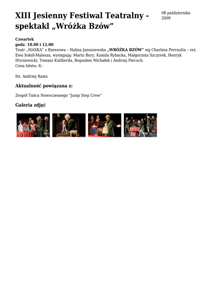 XIII Jesienny Festiwal Teatralny spektakl „Wróżka Bzów” 08 października 2009 Czwartek godz. 10.00 i 12.00 Teatr „MASKA” z Rzeszowa – Halina Januszewska „WRÓŻKA BZÓW” wg Charlesa Perraulta – reż. Ewa Sokół-Malesza, występują: Marta Bury, Kamila Rybacka, Małgorzata Szczyrek, Henryk Hryniewicki, Tomasz Kuliberda, Bogusław Michałek i Andrzej Piecuch. Cena biletu: 8,fot. Andrzej Rams Aktualność powiązana z: Zespół Tańca Nowoczesnego "Jump Step Crew" Galeria zdjęć