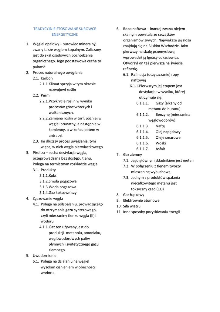 TRADYCYJNIE STOSOWANE SUROWCE ENERGETYCZNE 1. Węgiel opałowy – surowiec mineralny, zwany także węglem kopalnym. Zaliczany jest do skał osadowych pochodzenia organicznego. Jego podstawowa cecha to palnośd 2. Proces naturalnego uwęglania 2.1. Karbon 2.1.1.Klimat sprzyja w tym okresie rozwojowi roślin 2.2. Perm 2.2.1.Przykrycie roślin w wyniku procesów górotwórczych i wulkanicznych. 2.2.2.Zamiana roślin w torf, później w węgiel brunatny, a następnie w kamienny, a w koocu potem w antracyt 2.3. Im dłuższy proces uwęglania, tym więcej w nich węgla pierwiastkowego 3. Piroliza – sucha destylacja węgla, przeprowadzana bez dostępu tlenu. Polega na termicznym rozkładzie węgla 3.1. Produkty 3.1.1.Koks 3.1.2.Smoła pogazowa 3.1.3.Woda pogazowa 3.1.4.Gaz koksowniczy 4. Zgazowanie węgla 4.1. Polega na półspalaniu, prowadzącego do otrzymania gazu syntezowego, czyli mieszaniny tlenku węgla (II) i wodoru 4.1.1.Gaz ten używany jest do produkcji metanolu, amoniaku, węglowodorowych paliw płynnych i syntetycznego gazu ziemnego. 5. Uwodornienie 5.1. Polega na działaniu na węgiel wysokim ciśnieniem w obecności wodoru. 6. Ropa naftowa – inaczej zwana olejem skalnym powstała ze szczątków organizmów żywych. Największe jej złoża znajdują się na Bliskim Wschodzie. Jako pierwszy na skalę przemysłową wprowadził ją Ignacy Łukasiewicz. Otworzył on też pierwszą na świecie rafinerię. 6.1. Rafinacja (oczyszczanie) ropy naftowej 6.1.1.Pierwszym jej etapem jest destylacja; w wyniku, której otrzymuje się: 6.1.1.1. Gazy (alkany od metanu do butanu) 6.1.1.2. Benzynę (mieszanina węglowodorów) 6.1.1.3. Naftę 6.1.1.4. Olej napędowy 6.1.1.5. Oleje smarowe 6.1.1.6. Woski 6.1.1.7. Asfalt 7. Gaz ziemny 7.1. Jego głównym składnikiem jest metan 7.2. W połączeniu z tlenem tworzy mieszaninę wybuchową 7.3. Jednym z produktów spalania niecałkowitego metanu jest toksyczny czad (CO) 8. Gaz łupkowy 9. Elektrownie atomowe 10. Siła wiatru 11. Inne sposoby pozyskiwania energii