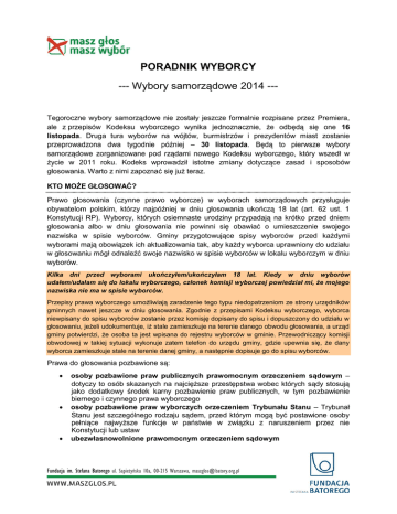 PORADNIK WYBORCY --- Wybory samorządowe 2014 --Tegoroczne wybory samorządowe nie zostały jeszcze formalnie rozpisane przez Premiera, ale z przepisów Kodeksu wyborczego wynika jednoznacznie, że odbędą się one 16 listopada. Druga tura wyborów na wójtów, burmistrzów i prezydentów miast zostanie przeprowadzona dwa tygodnie później – 30 listopada. Będą to pierwsze wybory samorządowe zorganizowane pod rządami nowego Kodeksu wyborczego, który wszedł w życie w 2011 roku. Kodeks wprowadził istotne zmiany dotyczące zasad i sposobów głosowania. Warto z nimi zapoznać się już teraz. KTO MOŻE GŁOSOWAĆ? Prawo głosowania (czynne prawo wyborcze) w wyborach samorządowych przysługuje obywatelom polskim, którzy najpóźniej w dniu głosowania ukończą 18 lat (art. 62 ust. 1 Konstytucji RP). Wyborcy, których osiemnaste urodziny przypadają na krótko przed dniem głosowania albo w dniu głosowania nie powinni się obawiać o umieszczenie swojego nazwiska w spisie wyborców. Gminy przygotowujące spisy wyborców przed każdymi wyborami mają obowiązek ich aktualizowania tak, aby każdy wyborca uprawniony do udziału w głosowaniu mógł odnaleźć swoje nazwisko w spisie wyborców w lokalu wyborczym w dniu wyborów. Kilka dni przed wyborami ukończyłem/ukończyłam 18 lat. Kiedy w dniu wyborów udałem/udałam się do lokalu wyborczego, członek komisji wyborczej powiedział mi, że mojego nazwiska nie ma w spisie wyborców. Przepisy prawa wyborczego umożliwiają zaradzenie tego typu niedopatrzeniom ze strony urzędników gminnych nawet jeszcze w dniu głosowania. Zgodnie z przepisami Kodeksu wyborczego, wyborca niewpisany do spisu wyborców zostanie przez komisję dopisany do spisu i dopuszczony do udziału w głosowaniu, jeżeli udokumentuje, iż stale zamieszkuje na terenie danego obwodu głosowania, a urząd gminy potwierdzi, że osoba ta jest wpisana do rejestru wyborców w gminie. Przewodniczący komisji obwodowej w takiej sytuacji wykonuje zatem telefon do urzędu gminy, gdzie upewnia się, że dany wyborca zamieszkuje stale na terenie danej gminy, a następnie dopisuje go do spisu wyborców. Prawa do głosowania pozbawione są: osoby pozbawione praw publicznych prawomocnym orzeczeniem sądowym – dotyczy to osób skazanych na najcięższe przestępstwa wobec których sądy stosują jako dodatkowy środek karny pozbawienie praw publicznych, w tym pozbawienie biernego i czynnego prawa wyborczego osoby pozbawione praw wyborczych orzeczeniem Trybunału Stanu – Trybunał Stanu jest szczególnego rodzaju sądem, przed którym mogą być postawione osoby pełniące najwyższe funkcje w państwie w związku z naruszeniem przez nie Konstytucji lub ustaw ubezwłasnowolnione prawomocnym orzeczeniem sądowym Fundacja im. Stefana Batorego ul. Sapieżyńska 10a, 00-215 Warszawa, [email protected] W praktyce największą grupę osób pozbawionych czynnego prawa wyborczego stanowią osoby ubezwłasnowolnione, których jest w Polsce obecnie około 60 tysięcy. Odebranie im praw wyborczych budzi od dawna poważne zastrzeżenia. Do tej pory jednak nie podjęto prac nad reformą prawa wyborczego, które przynajmniej częściowo przywróciłoby prawa wyborcze osobom ubezwłasnowolnionym. GDZIE GŁOSUJĘ? W wyborach samorządowych, inaczej niż np. w wyborach parlamentarnych, możemy głosować wyłącznie w miejscu stałego zamieszkania. Prawo wybierania swoich przedstawicieli w wyborach samorządowych jest „terytorialnie ograniczone”. Możemy głosować tylko na kandydatów z naszej gminy, powiatu czy województwa. Wyjeżdżając poza miejsce swojego stałego zamieszkania pozbawiamy się możliwości udziału w wyborach samorządowych. Nie możemy się ubiegać o wydanie zaświadczenia o prawie do głosowania, z którym moglibyśmy zagłosować gdziekolwiek w kraju czy nawet za granicą. W lokalu wyborczym w Krakowie nie będziemy mogli zagłosować na prezydenta Warszawy i odwrotnie. Tak samo, wyborca stale zamieszkały w Katowicach nie będzie mógł nie będzie mógł zagłosować na radnych miasta Poznania tylko dlatego, że będzie spędzał weekend w tym mieście. Taka sytuacja nie wynika z niedopatrzenia ustawodawcy, ale ma swoje racjonalne uzasadnienie. Otóż ustawodawca przyjął, że mieszkańcy każdej gminy, powiatu i województwa tworzą tzw. wspólnotę samorządową. To właśnie członkowie owej wspólnoty mają prawo decydować o jej władzach w drodze wyborów samorządowych. Kryterium przynależności do wspólnoty danej gminy, powiatu czy województwa jest natomiast stałe miejsce zamieszkania na obszarze wymienionych jednostek samorządu terytorialnego. Miejscem stałego zamieszkania jest miejscowość, w której dana osoba przebywa z zamiarem stałego pobytu. Każdy może mieć tylko jedno miejsce stałego zamieszkania. Miejsce zamieszkania nie musi pokrywać się z miejscem zameldowania, ale w praktyce to właśnie dane z rejestrów meldunkowych w pierwszej kolejności decydują o tym, gdzie możemy zagłosować. Na ich podstawie urzędnicy gminni sporządzają bowiem tzw. stały rejestr wyborców, w którym ujęci są wszyscy wyborcy uprawnieni do głosowania w danej gminie. Do rejestru wpisywane są z urzędu (automatycznie) wszystkie osoby stale zameldowane w danej gminie. Nie jest zatem potrzebny z naszej strony jakikolwiek wniosek o dopisanie do rejestru – trafiamy do niego z chwilą ukończenia 18. roku życia. Co jednak, jeśli zmieniliśmy nasze miejsce stałego zamieszkania, ale pozostajemy wciąż zameldowani w innej gminie? To sytuacja często spotykana, np. wśród osób, które przeniosły się do Warszawy czy innych większych miast, ale pozostają zameldowane w gminie, z której pochodzą. Wówczas, chcąc zagłosować poza miejscem zameldowania, powinniśmy złożyć wniosek o wpisanie do stałego rejestru wyborców w urzędzie gminy, w której stale zamieszkujemy. W ciągu trzech dni urzędnicy mają obowiązek wydać decyzję o 