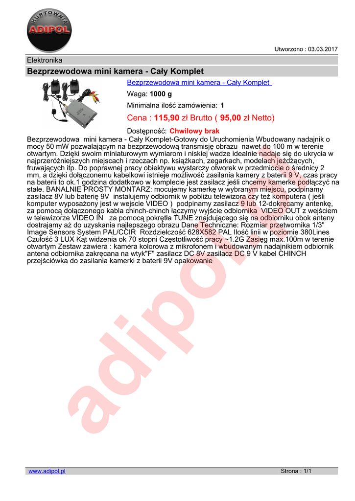 Utworzono : 03.03.2017 Elektronika Bezprzewodowa mini kamera - Cały Komplet Bezprzewodowa mini kamera - Cały Komplet Waga: 1000 g Minimalna ilość zamówienia: 1 Cena : 115,90 zł Brutto ( 95,00 zł Netto) ad ip ol .p l Dostępność: Chwilowy brak Bezprzewodowa mini kamera - Cały Komplet-Gotowy do Uruchomienia Wbudowany nadajnik o mocy 50 mW pozwalającym na bezprzewodową transmisję obrazu nawet do 100 m w terenie otwartym. Dzięki swoim miniaturowym wymiarom i niskiej wadze idealnie nadaje się do ukrycia w najprzeróżniejszych miejscach i rzeczach np. książkach, zegarkach, modelach jeżdżących, fruwających itp. Do poprawnej pracy obiektywu wystarczy otworek w przedmiocie o średnicy 2 mm, a dzięki dołączonemu kabelkowi istnieje możliwość zasilania kamery z baterii 9 V, czas pracy na baterii to ok.1 godzina dodatkowo w komplecie jest zasilacz jeśli chcemy kamerke podłączyć na stałe. BANALNIE PROSTY MONTARZ: mocujemy kamerkę w wybranym miejscu, podpinamy zasilacz 8V lub baterię 9V instalujemy odbiornik w pobliżu telewizora czy też komputera ( jeśli komputer wyposażony jest w wejscie VIDEO ) podpinamy zasilacz 9 lub 12-dokręcamy antenkę, za pomocą dołączonego kabla chinch-chinch łączymy wyjście odbiornika VIDEO OUT z wejściem w telewizorze VIDEO IN za pomocą pokrętła TUNE znajdującego się na odbiorniku obok anteny dostrajamy aż do uzyskania najlepszego obrazu Dane Techniczne: Rozmiar przetwornika 1/3" Image Sensors System PAL/CCIR Rozdzielczość 628X582 PAL Ilość linii w poziomie 380Lines Czułość 3 LUX Kąt widzenia ok 70 stopni Częstotliwość pracy ~1.2G Zasięg max.100m w terenie otwartym Zestaw zawiera : kamera kolorowa z mikrofonem i wbudowanym nadajnikiem odbiornik antena odbiornika zakręcana na wtyk"F" zasilacz DC 8V zasilacz DC 9 V kabel CHINCH przejściówka do zasilania kamerki z baterii 9V opakowanie www.adipol.pl Powered by TCPDF (www.tcpdf.org) Strona : 1/1
