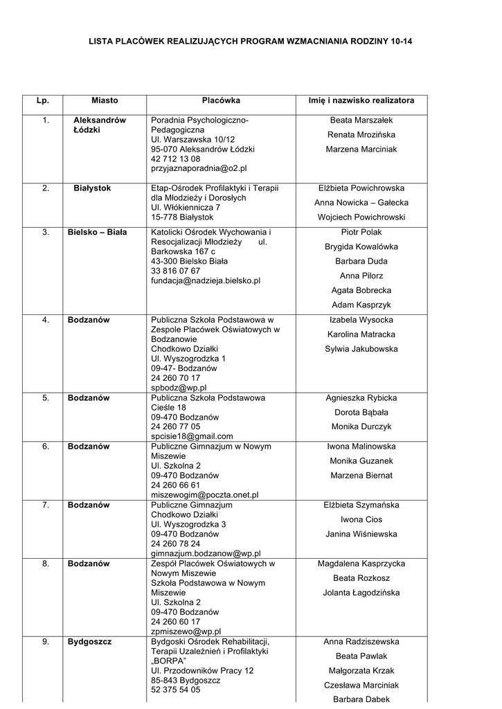 LISTA PLACÓWEK REALIZUJĄCYCH PROGRAM WZMACNIANIA RODZINY 10-14 Lp. 1. 2. 3. Miasto Aleksandrów Łódzki Białystok Bielsko – Biała Placówka Poradnia PsychologicznoPedagogiczna Ul. Warszawska 10/12 95-070 Aleksandrów Łódzki 42 712 13 08 [email protected] Etap-Ośrodek Profilaktyki i Terapii dla Młodzieży i Dorosłych Ul. Włókiennicza 7 15-778 Białystok Katolicki Ośrodek Wychowania i Resocjalizacji Młodzieży ul. Barkowska 167 c 43-300 Bielsko Biała 33 816 07 67 [email protected] Imię i nazwisko realizatora Beata Marszałek Renata Mrozińska Marzena Marciniak Elżbieta Powichrowska Anna Nowicka – Gałecka Wojciech Powichrowski Piotr Polak Brygida Kowalówka Barbara Duda Anna Pilorz Agata Bobrecka Adam Kasprzyk 4. 5. 6. 7. 8. 9. Bodzanów Bodzanów Bodzanów Bodzanów Bodzanów Bydgoszcz Publiczna Szkoła Podstawowa w Zespole Placówek Oświatowych w Bodzanowie Chodkowo Działki Ul. Wyszogrodzka 1 09-47- Bodzanów 24 260 70 17 [email protected] Publiczna Szkoła Podstawowa Cieśle 18 09-470 Bodzanów 24 260 77 05 [email protected] Publiczne Gimnazjum w Nowym Miszewie Ul. Szkolna 2 09-470 Bodzanów 24 260 66 61 [email protected] Publiczne Gimnazjum Chodkowo Działki Ul. Wyszogrodzka 3 09-470 Bodzanów 24 260 78 24 [email protected] Zespół Placówek Oświatowych w Nowym Miszewie Szkoła Podstawowa w Nowym Miszewie Ul. Szkolna 2 09-470 Bodzanów 24 260 60 17 [email protected] Bydgoski Ośrodek Rehabilitacji, Terapii Uzależnień i Profilaktyki „BORPA” Ul. Przodowników Pracy 12 85-843 Bydgoszcz 52 375 54 05 Izabela Wysocka Karolina Matracka Sylwia Jakubowska Agnieszka Rybicka Dorota Bąbała Monika Durczyk Iwona Malinowska Monika Guzanek Marzena Biernat Elżbieta Szymańska Iwona Cios Janina Wiśniewska Magdalena Kasprzycka Beata Rozkosz Jolanta Łagodzińska Anna Radziszewska Beata Pawlak Małgorzata Krzak Czesława Marciniak Barbara Dąbek Katarzyna Kaczyńska Marzena Kuźniak Anita Krajnik Anna Urban Karolina Zakrzewska Patrycja Kuczkowska Hanna Ruszkiewicz Agnieszka Maria Iwanusek Elżbieta Stawiarska Beata Tybuszewska Karolina Gorecka Anna Nowak Małgorzata Małyjurek Teresa Włodarska Urszula Boguszewska Barbara Głowacka 10. Bydgoszcz Uniwersytet Kazimierza Wielkiego Ul. J.K Chodkiewicza 30 85-064 Bydgoszcz Prof. Maria Deptuła Wioletta Junik Kalina Konecka Marietta Dembek Maja Łoś Jolanta Jarczyńska Marta Połotniuk Małgorzata Zabłocka Blanka Poćwiardowska 11. 12. 13. 14. Bydgoszcz Chełm Chorzów Chorzów Poradnia Profilaktyki i Pomocy Rodzinie PTZN Ul. Gajowa 43 85-009 Bydgoszcz 52 371 19 08 [email protected] Stowarzyszenie Ośrodek Wspierania Rodziny 22-100 Chełm ul. Obłońska 798 918 323 Ośrodek Wsparcia Rodziny ul. Siemianowicka 58 41-503 Chorzów 32 241 15 27 Stowarzyszenie na Rzecz Rodziny Ul. Omańkowskiej 1 41-500 Chorzów Robert Rejniak Agnieszka Kobus Paweł Szopiński Edyta Korona – Jędrzejewska Joanna Dziurzyńska Bożena Chaciuk Bożena Cierpioł Danuta Szary Joanna Łuczak Robert Gierek Grzegorz Witkowski Andrzej Maciejowski 15. Ciechanów OESiP „ARKA” ul. Matejki 7 06-400 Ciechanów Danuta Drzewiecka Aneta Wernik Robert Kraczkowski 16. 17. 18. 19. Częstochowa Częstochowa Elbląg Ełk Polskie Stowarzyszenie Pedagogów I Psychologów „Macierz” ul Nowowiejskiego 3 42-217 Częstochowa 34 324 72 51 [email protected] Częstochowskie Towarzystwo „Powrót z U” Ul. Wiolinowa 1 42-200 Częstochowa NZOZ Ośrodek Terapii Uzależnień „Szansa” Ul. Żeromskiego 22 82-300 Elbląg 55 233 94 94 Stowarzyszenie Alternatywa 19-300 Ełk ul. Kilińskiego 3F / 3 Anna Zajic Agnieszka Kuliś Izabela Jacewicz Beata Wawrzyńczak Paweł Matusik Marta Mrozińska Bogusław Mikulski Marek Cieślak Piotr Kluska Beata Krakowiak Agnieszka Kurczak Wiktor Kurczak 20. Garczegorze Zespół Szkół w Garczegorzu 84-351 Nowa Wieś Lęborska 59 863 34 47 Bożena Lenart Izabela Płotka Emilia Lewandowska Grażyna Damps Honorata Smentoch Edyta Pobłocka Romana Kasprzak Alicja Guźniczak 21. 22. 23. 24. Garwolin Garwolin Gdańsk Gdańsk Zespół Szkół Specjalnych nr 2 Al. Legionów 11 08-400 Garwolin 25 682 62 23 [email protected] Zespół Szkół nr 5 08-400 Garwolin ul. Korczaka 10 25 682 28 33 im. J. Korczaka Towarzystwo Profilaktyki Środowiskowej „Mrowisko” Ul. Reduta Wyskok 9 80-741 Gdańsk 58 305 46 97 [email protected] Stowarzyszenie Praktyków Profilaktyki Społecznej Ul. Słonimskiego 4/6 80-280 Gdańsk Anna Czajka – Popińska Justyna Mikulska Anetta Stobiecka – Donicz Izabela Tudek Alicja Paśnik Wioletta Gurzkowska Natalia Gołaszewska Kaja Medowska – Bednarowicz Inga Krupska Aleksandra Chrupek Dorota Zyskowska Alicja Maliszewska Małgorzata Gurzkowska Agnieszka Nowak Justyna Szmaj Julia Wójcik 25. 26. Gdów Gliwice Fundacja Centrum Działań Profilaktycznych Ul. Gdów 53 32-420 Gdów Górnośląskie Stowarzyszenie Familia Ul. Dębowa 5 44-100 Gliwice Dawid Droździkowski Marta Kłoszewska Adam Bojakowski Małgorzata Skobel Marta Struzik Ewa Baranowska 27. 28. 29. Gródek Grudziądz Jaworzno Szkoła Podstawowa im. Armii Krajowej w Gródku Ul Gródek 38 33- 331 Stróże 18 44 74 211 Grudziądzkie Stowarzyszenie ”Pomoc Uzależnionym” ul. Mikołaja z Ryńska 10 86-300 Grudziądz Stowarzyszenie Betlejem Ul. Długa 16 43-603 Jaworzno Anna Wójcik Anna Nykaza-Kruczek Izabela Zaczyk Maria Burzyńska Andrzej Burzński Lucyna Torłop Anna Bystrzycka Olga Wajs – Stasica Mariusz Borek 30. Jelenia Góra 31. Jelenia Góra 32. Kalino 33. 34. 35. Kalisz Kielce Konin Samodzielny Publiczny Zakład Opieki Zdrowotnej Szpital Specjalistyczny MSW Poradnia Uzależnień Ul. Cieplicka 69/71 58-560 Jelenia Góra 75 64 35 772 Powiatowe Centrum Pomocy Rodzinie ul. Podchorążych 15 58-508 Jelenia Góra 75 64 73 277 [email protected] Punkt konsultacyjny dla osób i rodzin w kryzysie przy SP w Kalinie Kalino 95-030 Rzgów Stowarzyszenie Katolicki Ruch Antynarkotyczny KARAN 62-800 Kalisz ul. Graniczna 1 Świętokrzyskie Centrum Psychiatrii w Morawicy Ul. S