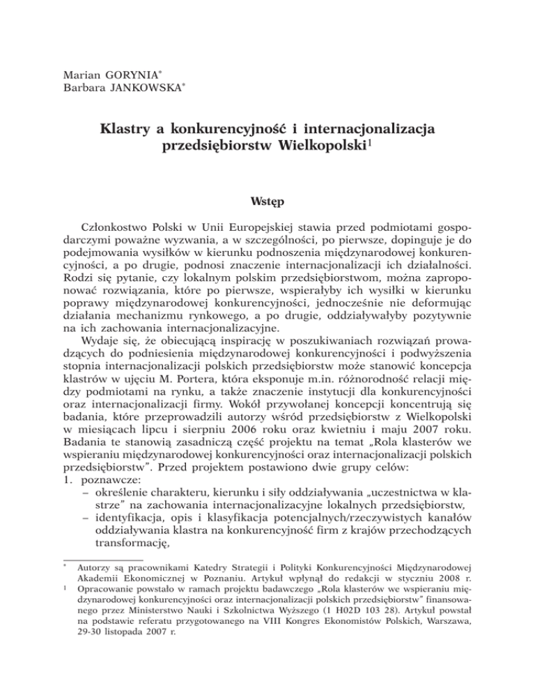 Marian Gorynia* Barbara Jankowska* Klastry a konkurencyjność i internacjonalizacja przedsiębiorstw Wielkopolski Wstęp Członkostwo Polski w Unii Europejskiej stawia przed podmiotami gospodarczymi poważne wyzwania, a w szczególności, po pierwsze, dopinguje je do podejmowania wysiłków w kierunku podnoszenia międzynarodowej konkurencyjności, a po drugie, podnosi znaczenie internacjonalizacji ich działalności. Rodzi się pytanie, czy lokalnym polskim przedsiębiorstwom, można zaproponować rozwiązania, które po pierwsze, wspierałyby ich wysiłki w kierunku poprawy międzynarodowej konkurencyjności, jednocześnie nie deformując działania mechanizmu rynkowego, a po drugie, oddziaływałyby pozytywnie na ich zachowania internacjonalizacyjne. Wydaje się, że obiecującą inspirację w poszukiwaniach rozwiązań prowadzących do podniesienia międzynarodowej konkurencyjności i podwyższenia stopnia internacjonalizacji polskich przedsiębiorstw może stanowić koncepcja klastrów w ujęciu M. Portera, która eksponuje m.in. różnorodność relacji między podmiotami na rynku, a także znaczenie instytucji dla konkurencyjności oraz internacjonalizacji firmy. Wokół przywołanej koncepcji koncentrują się badania, które przeprowadzili autorzy wśród przedsiębiorstw z Wielkopolski w miesiącach lipcu i sierpniu 2006 roku oraz kwietniu i maju 2007 roku. Badania te stanowią zasadniczą część projektu na temat „Rola klasterów we wspieraniu międzynarodowej konkurencyjności oraz internacjonalizacji polskich przedsiębiorstw”. Przed projektem postawiono dwie grupy celów: 1. poznawcze: – określenie charakteru, kierunku i siły oddziaływania „uczestnictwa w klastrze” na zachowania internacjonalizacyjne lokalnych przedsiębiorstw, – identyfikacja, opis i klasyfikacja potencjalnych/rzeczywistych kanałów oddziaływania klastra na konkurencyjność firm z krajów przechodzących transformację, * Autorzy są pracownikami Katedry Strategii i Polityki Konkurencyjności Międzynarodowej Akademii Ekonomicznej w Poznaniu. Artykuł wpłynął do redakcji w styczniu 2008 r. Opracowanie powstało w ramach projektu badawczego „Rola klasterów we wspieraniu międzynarodowej konkurencyjności oraz internacjonalizacji polskich przedsiębiorstw” finansowanego przez Ministerstwo Nauki i Szkolnictwa Wyższego (1 H02D 103 28). Artykuł powstał na podstawie referatu przygotowanego na VIII Kongres Ekonomistów Polskich, Warszawa, 29-30 listopada 2007 r. 92 GOSPODARKA NARODOWA Nr 5-6/2008 – rekonstrukcja założeń i istoty oraz porównanie głównych koncepcji regulacji w gospodarce rynkowej, – wskazanie barier rozwojowych klastrów w Polsce, – identyfikacja potencjalnych/rzeczywistych klastrów w gospodarce polskiej. 2. praktyczne: – sformułowanie praktycznych zaleceń pod adresem strategii firm polskich ze szczególnym uwzględnieniem wykorzystania pozytywnych stron klastrów, – opracowanie rekomendacji odnośnie do prowadzenia polityki wspierania konkurencyjności firm polskich, a w szczególności sprzyjającej internacjonalizacji przedsiębiorstw z wykorzystaniem klastrów, – przygotowanie zaleceń pod adresem samorządu gospodarczego, które eksponowałyby rolę tego typu instytucji w kreacji klastrów, – zarekomendowanie działań zmierzających do likwidacji barier utrudniających powstawanie i działanie klastrów. W części poznawczej stworzono schemat analityczny ujmujący, po pierwsze, potencjalne kanały oddziaływania klastra na międzynarodową konkurencyjność przedsiębiorstw w gospodarkach transformowanych oraz, po drugie, na internacjonalizację firmy [Gorynia, Jankowska, 2007a, 2007b]. Schemat ten został następnie wykorzystany w przeprowadzeniu badań empirycznych w odniesieniu do firm polskich. W niniejszym tekście uwaga zostanie skoncentrowana na prezentacji najważniejszych wyników uzyskanych w badaniach empirycznych trzech klastrów zlokalizowanych w Wielkopolsce: klastera meblarskiego, klastera kotlarskiego i klastera motoryzacyjnego. Przedmiot badań Zasadniczym przedmiotem badania jest analiza sposobów wpływu istniejących bądź potencjalnych klastrów w Polsce na międzynarodową konkurencyjność polskich przedsiębiorstw oraz na zachowania internacjonalizacyjne tych przedsiębiorstw. W toku badań podjęto próbę zidentyfikowania potencjalnych/rzeczywistych klastrów w Polsce, określenia charakteru, kierunku i siły oddziaływania „uczestnictwa w klastrze” na zachowania internacjonalizacyjne lokalnych przedsiębiorstw, zidentyfikowania, opisania i sklasyfikowania potencjalnych/rzeczywistych kanałów oddziaływania klastera na konkurencyjność firm z krajów po transformacji, oraz przeprowadzono analizę przydatności i stopnia realizacji działań dla poprawy konkurencyjności z zakresu polityki gospodarczej oraz podejmowanych przez samorządy gospodarcze. Metoda badawcza Badanie empiryczne, dotyczące roli klastrów we wspieraniu międzynarodowej konkurencyjności oraz internacjonalizacji firm polskich w odniesieniu Marian Gorynia, Barbara Jankowska, Klastry a konkurencyjność i internacjonalizacja... 93 do dwóch tworzących się klastrów w Wielkopolsce – klastra motoryzacyjnego oraz meblowego – zostało przeprowadzone w miesiącach lipcu i sierpniu 2006 roku. Natomiast badania wśród przedstawicieli klastra kotlarskiego w okolicach Pleszewa, w Wielkopolsce miały miejsce w kwietniu i maju 2007 roku. Głównym kryterium doboru jednostek do próby była, po pierwsze, lokalizacja danego przedsiębiorstwa na terenie Wielkopolski, a po drugie, przedmiot jej działalności. Kluczowe znacznie miała również zgoda przedstawicieli firmy na uczestnictwo w badaniu. Lista adresowa potencjalnych respondentów ankiety została przygotowana we współpracy z Wielkopolską Agencją Rozwoju Przedsiębiorczości. Dobór branż do badania podporządkowany był temu, aby były to branże, w których daje się zaobserwow