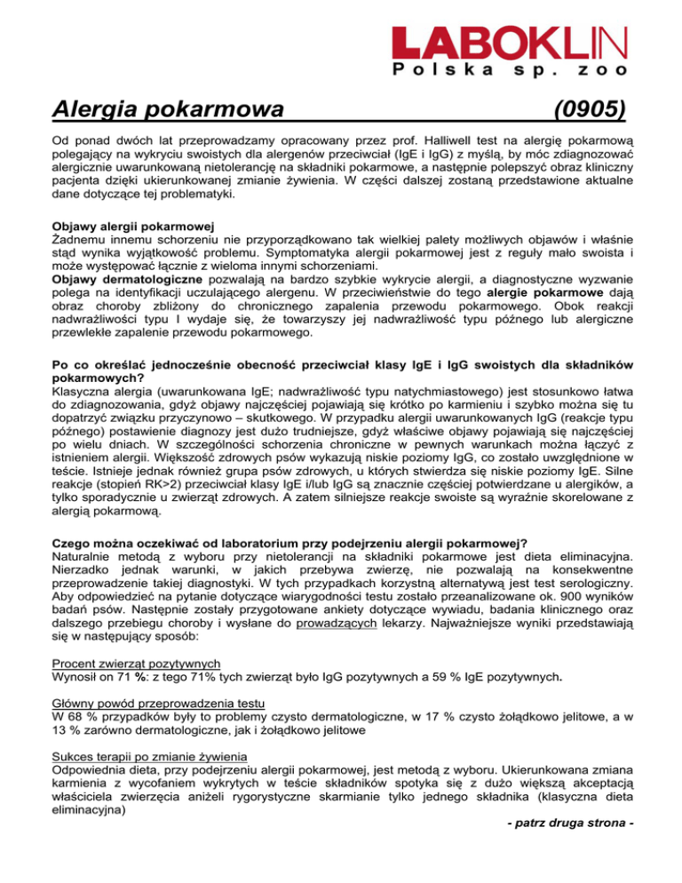 Alergia pokarmowa (0905) Od ponad dwóch lat przeprowadzamy opracowany przez prof. Halliwell test na alergię pokarmową polegający na wykryciu swoistych dla alergenów przeciwciał (IgE i IgG) z myślą, by móc zdiagnozować alergicznie uwarunkowaną nietolerancję na składniki pokarmowe, a następnie polepszyć obraz kliniczny pacjenta dzięki ukierunkowanej zmianie żywienia. W części dalszej zostaną przedstawione aktualne dane dotyczące tej problematyki. Objawy alergii pokarmowej Żadnemu innemu schorzeniu nie przyporządkowano tak wielkiej palety możliwych objawów i właśnie stąd wynika wyjątkowość problemu. Symptomatyka alergii pokarmowej jest z reguły mało swoista i może występować łącznie z wieloma innymi schorzeniami. Objawy dermatologiczne pozwalają na bardzo szybkie wykrycie alergii, a diagnostyczne wyzwanie polega na identyfikacji uczulającego alergenu. W przeciwieństwie do tego alergie pokarmowe dają obraz choroby zbliżony do chronicznego zapalenia przewodu pokarmowego. Obok reakcji nadwrażliwości typu I wydaje się, że towarzyszy jej nadwrażliwość typu późnego lub alergiczne przewlekłe zapalenie przewodu pokarmowego. Po co określać jednocześnie obecność przeciwciał klasy IgE i IgG swoistych dla składników pokarmowych? Klasyczna alergia (uwarunkowana IgE; nadwrażliwość typu natychmiastowego) jest stosunkowo łatwa do zdiagnozowania, gdyż objawy najczęściej pojawiają się krótko po karmieniu i szybko można się tu dopatrzyć związku przyczynowo – skutkowego. W przypadku alergii uwarunkowanych IgG (reakcje typu późnego) postawienie diagnozy jest dużo trudniejsze, gdyż właściwe objawy pojawiają się najczęściej po wielu dniach. W szczególności schorzenia chroniczne w pewnych warunkach można łączyć z istnieniem alergii. Większość zdrowych psów wykazują niskie poziomy IgG, co zostało uwzględnione w teście. Istnieje jednak również grupa psów zdrowych, u których stwierdza się niskie poziomy IgE. Silne reakcje (stopień RK>2) przeciwciał klasy IgE i/lub IgG są znacznie częściej potwierdzane u alergików, a tylko sporadycznie u zwierząt zdrowych. A zatem silniejsze reakcje swoiste są wyraźnie skorelowane z alergią pokarmową. Czego można oczekiwać od laboratorium przy podejrzeniu alergii pokarmowej? Naturalnie metodą z wyboru przy nietolerancji na składniki pokarmowe jest dieta eliminacyjna. Nierzadko jednak warunki, w jakich przebywa zwierzę, nie pozwalają na konsekwentne przeprowadzenie takiej diagnostyki. W tych przypadkach korzystną alternatywą jest test serologiczny. Aby odpowiedzieć na pytanie dotyczące wiarygodności testu zostało przeanalizowane ok. 900 wyników badań psów. Następnie zostały przygotowane ankiety dotyczące wywiadu, badania klinicznego oraz dalszego przebiegu choroby i wysłane do prowadzących lekarzy. Najważniejsze wyniki przedstawiają się w następujący sposób: Procent zwierząt pozytywnych Wynosił on 71 %: z tego 71% tych zwierząt było IgG pozytywnych a 59 % IgE pozytywnych. Główny powód przeprowadzenia testu W 68 % przypadków były to problemy czysto dermatologiczne, w 17 % czysto żołądkowo jelitowe, a w 13 % zarówno dermatologiczne, jak i żołądkowo jelitowe Sukces terapii po zmianie żywienia Odpowiednia dieta, przy podejrzeniu alergii pokarmowej, jest metodą z wyboru. Ukierunkowana zmiana karmienia z wycofaniem wykrytych w teście składników spotyka się z dużo większą akceptacją właściciela zwierzęcia aniżeli rygorystyczne skarmianie tylko jednego składnika (klasyczna dieta eliminacyjna) - patrz druga strona - Analiza ankiet wykazała, że po przeprowadzeniu testu na alergię w 83 % przypadków możliwa była zmiana żywienia na podstawie wyników testu. U 70 % tych zwierząt takie działanie było skuteczne. Przy czym zwierzęta z objawami żołądkowo jelitowymi reagują dużo lepiej na zmianę karmienia podyktowaną wynikami testu alergicznego (86%) aniżeli zwierzęta z objawami dermatologicznymi (65%). Również czas potrzebny do poprawy stanu pacjenta u zwierząt z objawami żołądkowo jelitowymi był wyraźnie krótszy. Wskazówka: zwłaszcza u zwierząt z objawami żołądkowo jelitowymi o niejasnej etiologii do diagnostyki powinny zostać włączone testy na alergię pokarmową. Jak wiarygodny jest ten test? Jakość wyniku testu jest oceniana między innymi w porównaniu do „złotego standardu”. Dla alergii pokarmowej „złotym standardem” jest kombinacja skuteczności terapii po eliminacji składnika pokarmowego oraz nawrotu choroby po ponownej ekspozycji na ten składnik. Dla 13 zwierząt, u których zanotowano znaczą poprawę po zmianie karmienia, dostępne były dane odnośnie prowokacji uczulającym składnikiem karmy. U 12 spośród 13 przypadków (92 %) po prowokacji ponowne wystąpiły objawy alergii. Taki wynik potwierdza wartość testu jako pomocnego środka diagnostycznego przy alergiach pokarmowych. Jak właściciele zwierząt oceniają udział diagnostyczny testu na alergię pokarmową? Czynnik 1 – czas: Test na alergię pokarmową łącznie z podyktowaną jego wynikiem zmianą żywienia odbierany jako bardzo skuteczne rozwiązanie. Poprawa stanu pacjenta w wyniku takie postępowania pojawia się w przeciągu paru tygodni, gdy tymczasem klasyczna dieta eliminacyjna wymaga około 3 miesięcy. Czynnik 2 – mniejsze utrudnienia: Żywienie uwzględniające eliminację składników pokarmowych uznanych za pozytywne w teście wymaga mniejszej dyscypliny od właściciela zwierzęcia i dzięki temu może być konsekwentnie przeprowadzona. Jest ona dużo łatwiejsza do przeprowadzenia aniżeli stosowanie bardzo ograniczonej liczby składników pokarmowych w trakcie klasycznej diety eliminacyjnej. Czynnik 3 – przywiązanie klienta: Od niedawna nasze laboratorium udostępnia paszport alergiczny, który może być przekazany właścicielowi zwierzęcia. Przedstawia on „listę zakupów”, p