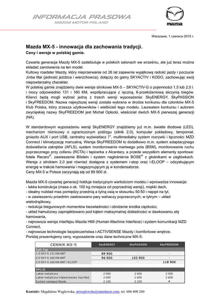 Warszawa, 1 czerwca 2015 r. Mazda MX-5 - innowacja dla zachowania tradycji. Ceny i wersje w polskiej gamie. Czwarta generacja Mazdy MX-5 zadebiutuje w polskich salonach we wrześniu, ale już teraz można składać zamówienia na ten model. Kultowy roadster Mazdy, który nieprzerwanie od 26 lat zapewnia wyjątkową radość jazdy i poczucie Jinba Ittai (jedność jeźdźca i wierzchowca), dołączy do gamy SKYACTIV i KODO, zachowując swój niepowtarzalny charakter. W polskiej gamie znajdziemy dwie wersje silnikowe MX-5 – SKYACTIV-G o pojemności 1,5 lub 2,0 l. i mocy odpowiednio 131 i 160 KM, współpracujące z ręczną, 6-przełożeniową skrzynią biegów. Klienci będą mogli wybrać jedną z trzech wersji wyposażenia: SkyENERGY, SkyPASSION i SkyFREEDOM. Nazwa najwyższej wersji została wybrana w drodze konkursu dla członków MX-5 Klub Polska, który zrzesza użytkowników i wielbicieli tego modelu. Laureatem konkursu i autorem zwycięskiej nazwy SkyFREEDOM jest Michał Opłocki, właściciel dwóch MX-5 pierwszej generacji (NA). W standardowym wyposażeniu wersji SkyENERGY znajdziemy już m.in. światła diodowe (LED), mechanizm różnicowy o ograniczonym poślizgu (silnik 2,0), komputer pokładowy, tempomat, gniazdo AUX i port USB, centralny wyświetlacz 7”, multimedialny system rozrywki i łączności MZD Connect i klimatyzację manualną. Wersja SkyFREEDOM to dodatkowo m.in. system adaptacyjnego doświetlania zakrętów (AFLS), system monitorowania martwego pola (BSM), monitorowanie ruchu poprzecznego przy cofaniu (RCTA) i tapicerka z Alcantary, a przede wszystkim elementy sportowe: fotele Recaro®, zawieszenie Bilstein i system nagłośnienia BOSE® z głośnikami w zagłówkach. Wersja z silnikiem 2,0 jest również dostępna z systemem i-stop oraz i-ELOOP – odzyskującym energię w trakcie hamowania i magazynującym ją w kondensatorze. Ceny MX-5 w Polsce zaczynają się od 89 900 zł. Mazda MX-5 czwartej generacji hołduje tradycyjnym wartościom modelu i wprowadza innowacje: - lekka konstrukcja (masa o ok. 100 kg mniejsza od poprzedniej wersji), miękki dach, - idealny rozkład mas pomiędzy przednią a tylną osią w stosunku 50:50 i napęd na tył, - w zawieszeniu przednim zastosowano pary wahaczy poprzecznych; w tylnym – układ wielodrążkowy, - redukcja biegunowych momentów bezwładności i obniżenie środka ciężkości, - układ hamulcowy zaprojektowano pod kątem maksymalnej dokładności w dawkowaniu siły hamowania, - najnowsza wersja interfejsu Mazda HMI (Human-Machine Interface) i system komunikacji MZD Connect, - najnowsze technologie bezpieczeństwa i-ACTIVSENSE Mazdy i komfortowe wnętrze. Poniżej prezentujemy ceny, wyposażenie oraz dane techniczne MX-5: CENNIK MX-5 Soft Top 1.5 SKY-G 131 KM 6MT 2.0 SKY-G 160 KM 6MT 2.0 SKY-G 160 KM 6MT i-ELOOP OPCJE Lakier metaliczny Lakier metaliczny trójwarstwowy Soul Red System nawigacji Mazda SkyENERGY SkyPASSION SkyFREEDOM 89 900 96 900 - 103 900 - 118 900 2 000 2 600 2 100 2 000 2 600 2 100 2 000 2 600 Kontakt: Magdalena Węglewska, [email protected], tel. 606 600 260 • WYPOSAŻENIE BEZPIECZEŃSTWO i TECHNOLOGIE Przednie i boczne poduszki powietrzne Kurtyny powietrzne Światła mijania / drogowe diodowe (LED) Światła do jazdy dziennej diodowe (LED) Światła przednie z funkcją Leaving/Coming Home (oświetlania drogi do domu) System adaptacyjnego doświetlania zakrętów (AFLS) System zapobiegający blokowaniu kół w trakcie hamowania (ABS) System dynamicznej stabilizacji toru jazdy i kontroli trakcji (DSC + TCS) System monitorowania ciśnienia w oponach (TPMS) System ostrzegania przed niezamierzoną zmianą pasa ruchu (LDW) System automatycznego przełączania świateł drogowych na mijania (HBC) System monitorowania martwego pola (BSM) System monitorowania ruchu poprzecznego przy cofaniu (RCTA) Czujnik deszczu (inteligentne wycieraczki) Czujnik zmierzchu (automatyczne światła mijania) System automatycznego wyłączania silnika w trakcie postoju (i-stop) System odzyskiwania energii w trakcie hamowania (i-ELOOP) Immobilizer Zestaw naprawczy opony z kompresorem 12V SPORT Zawieszenie sportowe Bilstein Mechanizm różnicowy o ograniczonym poślizgu (LSD) (tylko silnik 2.0) Rozpórka kielichów przedniego zawieszenia (tylko silnik 2.0) Sportowe fotele Recaro® KOMFORT Elektrycznie sterowane szyby boczne Elektrycznie sterowane lusterka boczne Podgrzewane lusterka boczne Przycisk uruchamiania silnika Centralny zamek ze zdalnym sterowaniem Zaawansowany system dostępu bezkluczykowego Podgrzewane fotele Klimatyzacja manualna Klimatyzacja automatyczna Komputer pokładowy Elektrochromatyczne lusterko wsteczne Radio AM/FM z RDS (liczba głośników) z odtwarzaniem plików MP3 Gniazdo AUX oraz port USB (liczba portów) Przyciski sterowania audio na kierownicy Radio cyfrowe DAB Wyświetlacz centralny 7" ze sterowaniem dotykowym (dostępnym w trakcie postoju) Multimedialny system rozrywki i łączności MZD Connect* Ergonomiczny system sterowania HMI (pokrętło wielofunkcyjne) Przestrzenny system nagłośnieniowy Bose® z głośnikami w zagłówkach Zestaw głośnomówiący Bluetooth ze sterowaniem przyciskami na kierownicy Układ utrzymywania stałej prędkości (tempomat) Czujniki parkowania z tyłu WNĘTRZE Skórzana kierownica Skórzana gałka dźwigni zmiany biegów Skórzana dźwignia hamulca ręcznego Tapicerka materiałowa w kolorze czarnym Tapicerka materiałowa w kolorze czarnym z czerwonymi szwami Tapicerka skórzana w kolorze czarnym z czerwonymi szwami Tapicerka zamszowa z Alcantary w kolorze czarnym z czerwonymi wykończeniami Wewnętrzne podszybia drzwi w kolorze nadwozia Deflektor aerodynamiczny między zagłówkami Lusterka w osłonach przeciwsłonecznych kierowcy i pasażera WYGLĄD ZEWNĘTRZNY Osłony pałąków przeciwkapotażowych w kolorze Piano Black Obudowy lusterek bocznych w kolorze nadwozia Obudowy lusterek bocznych w kolorze Piano Black Klamki zewnętrzne w kolorze nadwozia Dach ma