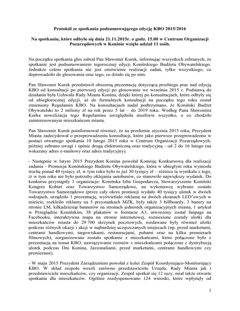 Protokół ze spotkania podsumowującego edycję KBO 2015/2016 Na spotkaniu, które odbyło się dnia 21.11.2015r. o godz. 15.00 w Centrum Organizacji Pozarządowych w Koninie wzięło udział 11 osób. Na początku spotkania głos zabrał Pan Sławomir Kurek, informując wszystkich zebranych, że spotkanie jest podsumowaniem tegorocznej edycji Konińskiego Budżetu Obywatelskiego. Jednakże celem spotkania nie jest omówienie realizacji zadań, tylko wszystkiego, co doprowadziło do głosowania oraz tego, co działo się po nim. Pan Sławomir Kurek przedstawił obszerną prezentację dotyczącą przebiegu prac nad edycją KBO od konsultacji po pierwszej edycji po głosowanie we wrześniu 2015 r. Podstawą do działania była Uchwała Rady Miasta Konina, dzięki której po konsultacjach, które odbyły się od ubiegłorocznej edycji, aż do formalnych konsultacji na początku tego roku został zmieniony Regulamin KBO. Na konsultacjach nadal podtrzymano, że Koniński Budżet Obywatelski to 2 miliony zł na rok przez 5 lat – do 2019 roku. Według Pana Sławomira Kurka nowelizacja tego Regulaminu uwzględniła możliwie wszystko, o co chodziło zainteresowanym mieszkańcom miasta. Pan Sławomir Kurek poinformował również, że na przełomie stycznia 2015 roku, Prezydent Miasta zadecydował o przeprowadzeniu konsultacji, które jako pierwsze przeprowadzono w postaci otwartego spotkania 10 lutego 2015 roku w Centrum Organizacji Pozarządowych, później zebrano uwagi i opinie drogą elektroniczną oraz tradycyjną - od 2 do 16 lutego (na wskazany adres e-mailowy oraz adres tradycyjny). - Następnie w lutym 2015 Prezydent Konina powołał Komisję Konkursową dla realizacji zadania - Promocja Konińskiego Budżetu Obywatelskiego, która w ubiegłym roku wyniosła trochę ponad 40 tysięcy zł, w tym roku było to już 30 tysięcy zł – różnica ta wynikała z tego, iż w tym roku nie było potrzeby oklejania autobusów, co stanowiło największy wydatek. Do konkursu przystąpiły 3 organizacje: Konińska Izba Gospodarcza, Stowarzyszenie Koniński Kongres Kobiet oraz Towarzystwo Samorządowe, na wykonawcę wybrane zostało Towarzystwo Samorządowe (przez cały okres promocji wydało 40 tysięcy ulotek w dwóch rodzajach, urządziło 1 prezentację, wyświetlało reklamę na dwóch ekranach LED’owych w mieście, rozkleiło reklamy na 5 przystankach MZK, były także 3 billboardy, 3 banery na stronie LM, kilkadziesiąt bannerów na stronach jednostek organizacyjnych miasta, 1 artykuł w Przeglądzie Konińskim, 38 plakatów w formacie A3, utworzony został fanpage na Facebooku, interaktywna mapa na stronie internetowej, rozniesione zostały ulotki dla mieszkańców miasta do 29 700 skrzynek pocztowych, rozdawane były również ulotki podczas różnych okazji i akcji w najbardziej uczęszczanych miejscach (np. przed marketami, centrami handlowymi, targowiskami, restauracjami, pubami oraz na kilku premierach filmowych), zorganizowane zostało spotkanie z mieszkańcami, które połączone było z prezentacją na temat KBO, nawiązywanie rozmów z mieszkańcami połączone z dystrybucją ulotek podczas Dni Konina, Jazzonaliami, przed marketami, centrami handlowymi czy premierami). - W maju 2015 Prezydent Zarządzeniem powołał z kolei Zespół Koordynująco-Monitorujący KBO. W skład zespołu weszli zarówno przedstawiciele Urzędu, Rady Miasta jak i przedstawiciele mieszkańców, czy organizacji. Zespół spotkał się 12 razy, miał także otwarte spotkania dla mieszkańców. Ogólnie rozdysponowano 124 wnioski, które wpłynęły od 1 mieszkańców, w ramach odwołań przeprowadzano również wizje lokalne. Pod koniec maja zorganizowano także specjalny dyżur w Urzędzie, aby wszyscy zainteresowani, którzy w tygodniu pracują, bądź się uczą, mogli jeszcze donieść swoje projekty. Złożone wnioski zostały zeskanowane i były dostępne na stronie internetowej, natomiast Zespół Koordynująco-Monitorujący je na bieżąco rozdzielał. - Między lipcem, a początkiem sierpnia 2015 nastąpiła weryfikacja formalno-prawna wniosków w wydziałach Urzędu Miejskiego. Dlatego pojawił nam się sierpień, ponieważ było kilka odwołań, które automatycznie wydłużyły ten czas. W odwołaniach zostały przyjęte 4 wnioski, natomiast 3 zostały oddalone, każde odwołanie było rozpatrywane indywidualnie na spotkaniach Zespołu Koordynująco-Monitorującego, na którym był wnioskodawca i przedstawiciel wydziału. Zespół na każdym spotkaniu głosował i, albo wniosek przyjmował, albo nie (93 wnioski zostały przyjęte do głosowania, a ponad 20 zostało na etapie formalnoprawnym w wydziałach odrzuconych). - Następnie pomiędzy sierpniem, a wrześniem 2015 została przeprowadzona promocja projektów, wszystkie informacje zamieszczone były na oficjalnej stronie Konińskiego Budżetu Obywatelskiego, także lokalna organizacja pozarządowa Akcja Konin zamieszczała i zamieszcza informacje dotyczące KBO, informacje były zamieszczane również na Facebooku, fanpage który został założony przez Towarzystwo Samorządowe oraz na fanpage będącym grupą otwartą, powstałym z inicjatywy mieszkańców Konina. Głosowanie odbyło się po raz pierwszy internetowo od 1 do 13 września 2015 oraz 13 września w 8 lokalach wyborczych, których liczba z pewnością w przyszłości zostanie zmniejszona, ze względu na duże zainteresowanie głosowaniem przez Internet. Łącznie zagłosowały 6453 osoby (w tym przez Internet zagłosowało 5829 osób, a w lokalach wyborczych 624, co dało frekwencję 10, 5 % uprawnionych do zagłosowania). Mieszkańcy wybrali 26 zadań małych i 1 zadanie duże, z czego Prezydent Miasta dodał do tego 3 zadania małe i 2 zadania duże. Pojawiło się również kilka sugestii, co do zmian: - Wykreślenia z Regulaminu KBO zapisu dotyczącego zgody opiekuna prawnego osoby niepełnoletniej, która chce złożyć wniosek do KBO. Pan Bartosz Jędrzejczak podkreśl