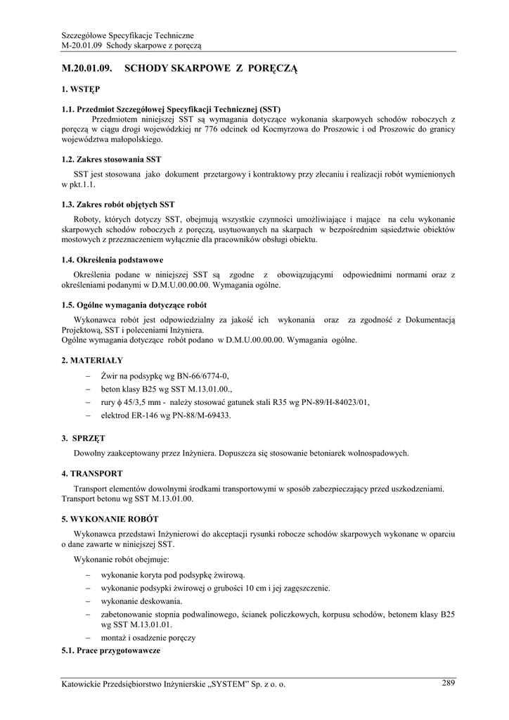Szczegółowe Specyfikacje Techniczne M-20.01.09 Schody skarpowe z poręczą M.20.01.09. SCHODY SKARPOWE Z PORĘCZĄ 1. WSTĘP 1.1. Przedmiot Szczegółowej Specyfikacji Technicznej (SST) Przedmiotem niniejszej SST są wymagania dotyczące wykonania skarpowych schodów roboczych z poręczą w ciągu drogi wojewódzkiej nr 776 odcinek od Kocmyrzowa do Proszowic i od Proszowic do granicy województwa małopolskiego. 1.2. Zakres stosowania SST SST jest stosowana jako dokument przetargowy i kontraktowy przy zlecaniu i realizacji robót wymienionych w pkt.1.1. 1.3. Zakres robót objętych SST Roboty, których dotyczy SST, obejmują wszystkie czynności umoŜliwiające i mające na celu wykonanie skarpowych schodów roboczych z poręczą, usytuowanych na skarpach w bezpośrednim sąsiedztwie obiektów mostowych z przeznaczeniem wyłącznie dla pracowników obsługi obiektu. 1.4. Określenia podstawowe Określenia podane w niniejszej SST są zgodne z obowiązującymi określeniami podanymi w D.M.U.00.00.00. Wymagania ogólne. odpowiednimi normami oraz z 1.5. Ogólne wymagania dotyczące robót Wykonawca robót jest odpowiedzialny za jakość ich wykonania oraz za zgodność z Dokumentacją Projektową, SST i poleceniami InŜyniera. Ogólne wymagania dotyczące robót podano w D.M.U.00.00.00. Wymagania ogólne. 2. MATERIAŁY − świr na podsypkę wg BN-66/6774-0, − beton klasy B25 wg SST M.13.01.00., − rury φ 45/3,5 mm - naleŜy stosować gatunek stali R35 wg PN-89/H-84023/01, − elektrod ER-146 wg PN-88/M-69433. 3. SPRZĘT Dowolny zaakceptowany przez InŜyniera. Dopuszcza się stosowanie betoniarek wolnospadowych. 4. TRANSPORT Transport elementów dowolnymi środkami transportowymi w sposób zabezpieczający przed uszkodzeniami. Transport betonu wg SST M.13.01.00. 5. WYKONANIE ROBÓT Wykonawca przedstawi InŜynierowi do akceptacji rysunki robocze schodów skarpowych wykonane w oparciu o dane zawarte w niniejszej SST. Wykonanie robót obejmuje: − wykonanie koryta pod podsypkę Ŝwirową. − wykonanie podsypki Ŝwirowej o grubości 10 cm i jej zagęszczenie. − wykonanie deskowania. − zabetonowanie stopnia podwalinowego, ścianek policzkowych, korpusu schodów, betonem klasy B25 wg SST M.13.01.01. − montaŜ i osadzenie poręczy 5.1. Prace przygotowawcze Katowickie Przedsiębiorstwo InŜynierskie „SYSTEM” Sp. z o. o. 289 Szczegółowe Specyfikacje Techniczne M-20.01.09 Schody skarpowe z poręczą W ramach prac przygotowawczych naleŜy wykonać następujące prace: − usunąć humus i roślinność z miejsc przeznaczonych na wbudowanie schodów, − usunąć inne elementy znajdujące się w miejscu wbudowania schodów 5.2. Wykonanie schodów W miejscu przeznaczonym do wbudowania schodów wykonać koryto szerokości odpowiadającej szerokości schodów. W korycie ułoŜyć podsypkę z mieszanki cementowo - Ŝwirowej (albo cementowo - pospółkowej) 1:4 i zagęścić ją do min. Is = 0,98. Wykonać deskowanie i ułoŜyć w nim mieszankę betonową. Szerokość schodów razem ze ściankami policzkowymi wynosi 100 cm, a szerokość robocza schodów 80 cm. Wysokość stopnia wynosi 18 cm a szerokość 27 cm. 5.3. Wykonanie i montaŜ poręczy Poręcze wykonac zgodnie z SST M.19.01.09. Poręcze. W przypadku schodów przy obiekcie W-9 poręcz zastępuje się pochwytem mocowanym do bocznych ścian skrzydła i podpory. Mocowanie pochwytu kotwami stalowymi bo betonu. 5.4. Zabezpieczenie antykorozyjne. Wykonać zgodnie z SST M.19.01.09. Poręcze oraz SST M.14.01.06. Zabezpieczenie antykorozyjne konstrukcji stalowych. 6. KONTROLA JAKOŚCI ROBÓT Kontrola jakości robót obejmuje: − sprawdzenie zgodności usytuowania schodów z Dokumentacją Projektową − sprawdzenie prawidłowości wykonania koryta − sprawdzenie poprawności ułoŜenia i zagęszczenia podsypki Ŝwirowej Sprawdzenie wykonania robót betoniarskich przeprowadzić wg SST M.13.01.01. Sprawdzenie wykonania poręczy przeprowadzić wg SST M.19.01.09. Poręcze. 7. OBMIAR ROBÓT Jednostką obmiaru jest 1 m schodów. Długość schodów mierzy się po długości skarpy od początku stopnia podwalinowego do końca stopnia najwyŜszego. 8. ODBIÓR ROBÓT − Odbiory częściowe dotyczą wszystkich pozycji kontroli jakości robót wymienionych w pkt.6 niniejszej SST. − Odbiór końcowy jest spisaniem protokołu. 9. PODSTAWA PŁATNOŚCI Płaci się za wykonaną i odebraną ilość metrów schodów skarpowych według ceny jednostkowej, która obejmuje zakup i dostarczenie wszystkich niezbędnych czynników produkcji, wykonanie koryta pod podsypkę Ŝwirową, wykonanie podsypki Ŝwirowej i jej zagęszczenie, zabetonowanie stopnia podwalinowego, ścianek policzkowych i korpusu schodów łącznie z deskowaniem, wykonanie i montaŜ poręczy, uporządkowaniem terenu. 10. PRZEPISY ZWIĄZANE BN-66/6774-01 PN-81/H-84023 290 Kruszywo naturalne do nawierzchni drogowych i kolejowych. świr i pospółka. Stal określonego zastosowania. Gatunki. Katowickie Przedsiębiorstwo InŜynierskie „SYSTEM” Sp. z o. o.