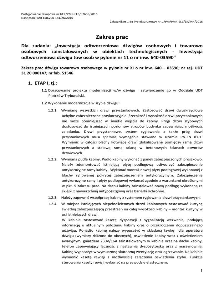 Postępowanie zakupowe nr GEK/PMR-ELB/07658/2016 Nasz znak PMR-ELB.290-181/ZK/2016 Załącznik nr 1 do Projektu Umowy nr …/PM/PMR-ELB/ZK/MN/2016 Zakres prac Dla zadania: „Inwestycja odtworzeniowa dźwigów osobowych i towarowo osobowych zainstalowanych w obiektach technologicznych - Inwestycja odtworzeniowa dźwigu tow osob w pylonie nr 11 o nr inw. 640-03590” Zakres prac dźwigu towarowo osobowego w pylonie nr XI o nr inw. 640 – 03590; nr rej. UDT 31 20 000147; nr fab. 51546 1. ETAP I, tj.: 1.1 Opracowanie projektu modernizacji w/w dźwigu i zatwierdzenie go w Oddziale UDT Piotrków Trybunalski. 1.2 Wykonanie modernizacja w szybie dźwigu: 1.2.1. Wymianę wszystkich drzwi przystankowych. Zastosować drzwi dwuskrzydłowe uchylne zabezpieczone antykorozyjnie. Szerokość i wysokość drzwi przystankowych nie może pomniejszać w świetle wejścia do kabiny. Progi drzwi szybowych dostosować do istniejących poziomów stropów budynku zapewniając możliwość załadunku. Drzwi przystankowe, system ryglowania a także próg drzwi przystankowych musi spełniać wymagania stawiane w Normie PN-EN 81-1. Wymienić w całości blachy kotwiące drzwi zlokalizowane pomiędzy ramą drzwi przystankowych a stalową ramą zalaną w betonowych ścianach otworów drzwiowych. 1.2.2. Wymiana pudła kabiny. Pudło kabiny wykonać z paneli zabezpieczonych proszkowo. Należy zdemontować istniejącą płytę podłogową odtworzyć zabezpieczenie antykorozyjne ramy kabiny. Wykonać montaż nowej płyty podłogowej wykonanej z blachy ryflowanej pokrytej zabezpieczeniem antykorozyjnym. Zabezpieczenia antykorozyjne ramy i płyty podłogowej wykonać zgodnie z warunkami określonymi w pkt. 5 zakresu prac. Na dachu kabiny zainstalować nową podłogę wykonaną ze sklejki z nawierzchnią antypoślizgową oraz barierki ochronne. 1.2.3. Należy zapewnić współpracę kabiny z systemem ryglowania drzwi przystankowych. 1.2.4. W miejsce istniejących niepełnościennych drzwi kabinowych zastosować kurtynę świetlną zabezpieczającą przestrzeń na całej wysokości kabiny – montaż kurtyny w osi istniejących drzwi. W kabinie zastosować kasetę dyspozycji z sygnalizacją wezwania, podającą informację o aktualnym położeniu kabiny oraz o przekroczeniu dopuszczalnego udźwigu. Ponadto kabinę należy wyposażyć w składaną ławkę dla operatora dźwigu (wymiary zbliżone do obecnych), oświetlenie kabiny wraz z oświetleniem awaryjnym, gniazdem 230V/16A zainstalowanym w kabinie oraz na dachu kabiny, telefon zapewniający łączność z nastawnią dyspozytorską oraz z maszynownią. Kabinę wyposażyć w wymuszoną skuteczną wentylację oraz ogrzewanie. Na kabinie wymienić kasetę rewizji z możliwością załączenia oświetlenia szybu. Funkcje sterowania kasety rewizji wykonać na przewodzie elastycznym. 1 Postępowanie zakupowe nr GEK/PMR-ELB/07658/2016 Nasz znak PMR-ELB.290-181/ZK/2016 Załącznik nr 1 do Projektu Umowy nr …/PM/PMR-ELB/ZK/MN/2016 1.2.5. Ściany betonowe szybu po odkurzeniu i uzupełnieniu ubytków betonu pomalować farbą do betonu do wymalowań wewnętrznych. 2. ETAP II, tj.: 2.1 Modernizację zespołu napędowego. 2.1.1. Demontaż zespołu przekładni głównej i korekcyjnej. Zastosować nową wciągarkę sprzężoną z nowym silnikiem napędowym, dobraną do występujących obciążeń oraz warunków pracy. Ruchome elementy wciągarki w tym koła cierne jako strefy niebezpieczne zabezpieczyć osłonami umożliwiającymi obserwację cyklu pracy urządzenia. Zastosować elementy zabezpieczające przed spadnięciem lin z koła ciernego. Przed montażem nowego zespołu napędowego należy przeprowadzić montaż podkładek tłumiących pod ramą wciągarki celem wyeliminowania drgań przenoszonych z napędu na konstrukcję nośną budynku. 2.1.2. Wymiana ogranicznika prędkości wraz z obciążką ogranicznika wyposażoną w wyłączniki krańcowe o działaniu dwukierunkowym z histerezą działania właściwą dla istniejącej wysokości podnoszenia. 2.1.3. Wymiana lin nośnych. Układ nośny dźwigu wyposażyć w urządzenie kontrolujące obciążenie kabiny wykonane jako mostek tensometryczny zapewniający dostęp i możliwość regulacji. Zawieszenie cięgien nośnych należy wyposażyć w urządzenie zabezpieczającej przed ich nadmiernym nierównomiernym wydłużeniem. 2.2 Modernizację instalacji elektrycznej oraz sterowania. 2.2.1. Zastosować sterowanie mikroprocesorowe współpracujące z przetwornicą częstotliwości ze zwrotem energii do sieci, zapewniające możliwość płynnej regulacji prędkości, korekcji położenia kabiny względem progu drzwi przystankowych w trakcie prac ładunkowych prowadzonych przy otwartych drzwiach przystankowych. System sterowania ma realizować funkcję ogranicznika czasu pracy silnika a także odwzorowania położenia kabiny w szybie zapewniając dokładność zatrzymania oraz poziomowania, zgodnie z wymogami Normy PN EN81-1. . System odwzorowania położenia kabiny w szybie wykonać w oparciu o odwzorowanie APS polegające na absolutnym czytniku położenia kabiny. Ponadto jako alternatywne wykonać odwzorowanie sprzężone z ogranicznikiem prędkości. Wymagany jest sterownik z pełną komunikacją za pomocą wyświetlacza ciekłokrystalicznego z menu w języku polskim. Wymagana jest także sygnalizacja optyczna i dźwiękowa wezwań w kabinie, wpięcie sygnalizacji pracy dźwigu do instalacji zakładowej oraz sygnału instalacji pożarowej budynku do sterownika dźwigu. Ponadto sterownik dźwigu musi być wyposażony w łącze w postaci gniazda RS232 celem pełnej komunikacji z komputerem brygady pogotowia serwisowego. Przetwornicę częstotliwości należy umieścić poza szafą sterowniczą i wyposażyć ją w wentylator. Szafę sterowniczą wyposażyć w wymuszoną wentylację z wkładem filtracyjnym. 2 Postępowanie zakupowe nr GEK/PMR-ELB/07658/2016 Nasz znak PMR-ELB.290-181/ZK/2016 Załącznik nr 1 do Projektu Umowy nr …/