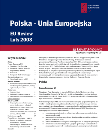 DORADZTWO EUROPEJSKIE Polska - Unia Europejska EU Review Luty 2003 W tym numerze: Polska Pomoc finansowa UE • Narodowy Plan Rozwoju 1 • Europejski Fundusz Rozwoju Regionalnego (EFFR) 4 • SAPARD 7 • Europejski Bank Inwestycyjny 7 Harmonizacja prawa • Nowelizacja ustawy o SS E 8 Naszym zdaniem • Koszty inwestycyjne kwalifukujące się do objęcia pomocą publiczną według wytycznych prawa WE 9 Wydarzenia • Traktat z Nicei 11 • Rejestracja znaku towarowego 12 • Dostosowanie rachunkowości NBP 13 Unia Europejska Z instytucji UE • Przyszły fundusz odbudowy dróg, normy środowiskowe w krajach kandydujących, reguły znakowania opakowań z mięsem, zakaz stosowania arszeniku przy konserwacji drewna, reforma WPR 14 Statystyczna pigułka 17 Perspektywy – tendencje – raporty • Raporty nt. spójności społecznogospodarczej, funduszy strukturalnych, demograficznych konsekwencji rozszerzenia UE 18 Kontakt 19 Oddajemy w Państwa ręce lutowe wydanie EU Review przygotowane przez Dział Doradztwa Europejskiego firmy Ernst & Young. W bieżącym numerze prezentujemy Narodowy Plan Rozwoju na lata 2004-2006, analizujemy problem kosztów inwestycyjnych kwalifikujących się do objęcia pomocą publiczną zgodnie z wytycznymi WE. Znajdą Państwo także podsumowanie Traktatu z Nicei, który wszedł w życie 1 lutego br. Polecamy Państwa uwadze raporty Komisji Europejskiej nt. spójności społeczno-gospodarczej i funduszy strukturalnych, raport Instytutu Statystycznego Holandii dot. demograficznych konsekwencji rozszerzenia, jak również podsumowanie negocjacji akcesyjnych oraz szczytu w Kopenhadze przygotowane przez Instytut Badawczy Deutsche Banku. Polska Pomoc finansowa UE Narodowy Plan Rozwoju. 14 stycznia 2003 roku Rada Ministrów przyjęła Narodowy Plan Rozwoju (NPR), który będzie podstawą korzystania z funduszy strukturalnych po akcesji Polski do UE. Za przygotowanie NPR odpowiedzialne było Ministerstwo Gospodarki. Celem strategicznym NPR jest rozwijanie konkurencyjnej gospodarki opartej na wiedzy i przedsiębiorczości, zdolnej do długofalowego, harmonijnego rozwoju, zapewniającej wzrost zatrudnienia i poprawę spójności społecznej, ekonomicznej i przestrzennej UE na poziomie regionalnym i krajowym. Cel NPR realizowany będzie poprzez działania mające na celu: • • • • ograniczenie zatrudnienia w rolnictwie z jednoczesnym podniesieniem jego dochodowości; podnoszenie udziału przemysłów o dużej produktywności i wydajności pracy w strukturze PKB; wzrost zatrudnienia w usługach, w szczególności w usługach rynkowych; stworzenie wszystkim regionom i grupom społecznym szans udziału w procesach rozwojowych i modernizacyjnych, poprzez przeciwdziałanie DORADZTWO EUROPEJSKIE Polska – UE dalszemu pogłębianiu się gospodarczych i społecznych zróżnicowań przestrzennych. EU Review Warunkiem realizacji tych celów jest przeznaczenie dostępnych środków finansowych na podstawowe działania, tzw. „osie” rozwoju. Do nich należą: Luty 2003 1. 2. 3. 4. 5. 5000 Podnoszenie konkurencyjności sektora przemysłu i usług; Rozwój zasobów ludzkich i zatrudnienia; Tworzenie warunków dla zwiększania poziomu inwestycji, promowanie zróżnicowanego rozwoju i spójności przestrzennej; Przekształcenia strukturalne w rolnictwie i rybołówstwie; Wzmocnienie potencjału rozwojowego regionów i przeciwdziałanie marginalizacji niektórych obszarów. Wkład krajowych środków publicznych i środków UE w realizację NPR w latach 2004-2006 z podziałem na poszczególne osie (w mln euro): 4500 4000 3500 3000 2500 2000 1500 1000 500 0 Oś 1 Oś 2 Oś 3 Wkład wspólnotowy Oś 4 Oś 5 Krajowy wkład publiczny Źródło: Narodowy Plan Rozwoju 2004-2006 Łączna suma środków publicznych (fundusze strukturalne, Fundusz Spójności, środki krajowe) zaangażowanych w realizację NPR w latach 2004-2006 wyniesie ponad 14,892 mld euro. W tej kwocie mieści się suma środków pochodzących z unijnych funduszy strukturalnych równa 11,369 mld euro (76,3%). Szacuje się, że zaangażowanie środków UE w latach 2004-2006 w realizację celów polityki strukturalnej w Polsce, w układzie poszczególnych funduszy, przyjmie następujące, przybliżone proporcje: • • Fundusze strukturalne: o Europejski Fundusz Rozwoju Regionalnego – 5,57 mld euro; o Europejski Fundusz Socjalny – 2,23 mld euro; o Europejski Fundusz Orientacji i Gwarancji Rolnej (Sekcja Orientacji) - 1,67 mld euro; o Finansowy Instrument Wspierania Rybołówstwa - 1,79 mld euro; Fundusz Spójności – 4,20 mld euro. All rights reserved - Ernst & Young 2003 2 DORADZTWO EUROPEJSKIE Polska – UE EU Review Luty 2003 W następnym okresie budżetowania (po 2007 roku) wszystkie regiony Polski mają mieć zagwarantowany dostęp do unijnych funduszy strukturalnych. Decyzje o wielkości funduszy i ich podziale między kraje oraz regiony zapadną w 2006 roku na podstawie średniej wysokości PKB na mieszkańca UE z lat 2001-2003. Na najbogatszy polski region, województwo mazowieckie przypada 64,9% średniego dochodu w poszerzonej UE (59% obecnej UE). Jest to szósty, najbogatszy region spośród przystępujących do Unii w 2004 roku, ale i tak prawie dwa razy biedniejszy od najbogatszej z nich Pragi (133% średniej dla poszerzonej UE). Wśród 10 najuboższych regionów, przystępujących do Unii, siedem leży w Polsce. W obecnej UE najwyższy dochód przypada na miejski region Londynu (241% średniej PKB obecnej UE), a najniższy na grecki Epir (Ipeiros – 47% obecnej UE). W 2007 roku prawo do unijnego wsparcia może stracić 18 regionów obecnej UE, w tym część dawnej NRD, belgijski Hainaut, brytyjski region Liverpoolu, portugalska wyspa Madera, hiszpańska Murcja i Asturia. Jeśli chodzi o wskaźniki bezrobocia, wśród regionów z najwyższym bezrobociem w poszerzonej Unii znajdą się m.in. województwa: dolnośląskie (24,1% ludności czynnej zawodowo), lubuskie (23,6%) i warmińsko-mazurskie