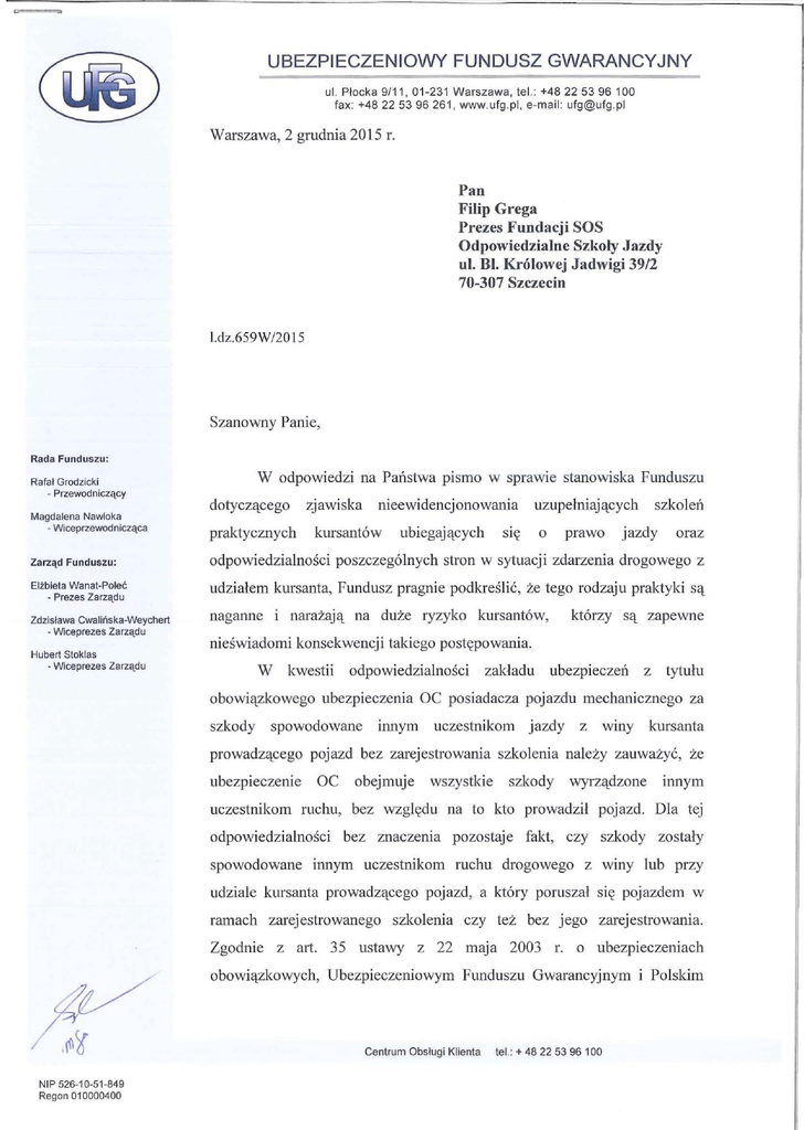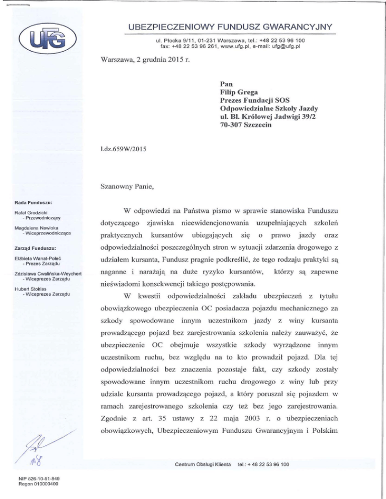 c a UBEZPIECZENIOWY FUNDUSZ GWARANCYJNY ul. Płocka 9/11 , 01-231 Warszawa , tel. : +48 22 53 96100 fax: +48 22 53 96 261 , www.ufg.pl, e-mail: [email protected] Warszawa, 2 grudnia 2015 r. Pan Filip Grega Prezes Fundacji SOS Odpowiedzialne Szkoły Jazdy ul. Bł. Królowej Jadwigi 39/2 70-307 Szczecin l.dz.659W /2015 Szanowny Panie, Rada Fund uszu : Rafał Grodzicki - Przewodniczący Magdalena Nawleka - Wiceprzewodnicząca Zarząd Funduszu: Elżbieta Wanat-Połeć - Prezes Zarządu Zdzisława Cwalińska-Weychert - Wiceprezes Zarządu Hubert Stoklas - Wiceprezes Państwa W odpowiedzi na dotyczącego zjawiska praktycznych udziałem W szkody na duże o prawo kwestii podkreślić, że jazdy którzy są ubezpieczenie są zapewne postępowania. odpowiedzialności zakładu ubezpieczeń z tytułu ubezpieczenia OC posiadacza pojazdu mechan icznego za spowodowane innym uczestnikom jazdy z winy prowadzącego oraz tego rodzaju praktyki ryzyko kursantów, konsekwencji takiego obowiązkowego się szkoleń poszczególnych stron w sytuacj i zdarzenia drogowego z narażają nieświadomi Zarządu ubiegających kursanta, Fundusz pragnie naganne i uzupełniających nieewidencjonowania kursantów odpowiedzialności pismo w sprawie stanowiska Funduszu pojazd bez zarejestrowania szkolenia OC obejmuje uczestnikom ruchu, bez odpowiedzialności wszystkie względu szkody na to kto kursanta należy zauważyć, że wyrządzone prowadził innym pojazd. Dla tej bez znaczenia pozostaje fakt, czy szkody zostały spowodowane innym uczestnikom ruchu drogowego z winy lub przy udziale kursanta prowadzącego pojazd, a który ramach zarejestrowanego szkolenia czy też poruszał się pojazdem w bez jego zarejestrowania. Zgodnie z a11. 35 ustawy z 22 maja 2003 r. o ubezpieczeniach obowiązkowych, Ubezpieczeniowym Funduszu Gwarancyjnym i Polskim Centrum NIP 526-10-51 -849 Regon 010000400 Obsługi Klienta tel. : + 48 22 53 96 100 Biurze Ubezpieczeń Komunikacyjnych (Dz.U. z 2013 r. poz. 392 z zm.) ubezpieczeniem OC jest kierując osoby, która odpowiedzialności ubezpieczeniowej, Kierujący regresem, który wyrządziła szkodę stanowi, iż zakładowi ubezpieczeń będzie przysługiwało tytułu związku z za ubezpieczenia OC. Art. 43 ww. ustawy zwrotu poniesionych kosztów od osoby, która prawo domagania kierowała pojazdem bez uprawnień. W przypadku gdyby kursant ubezpieczenia OC dokonałby w będzie przysługiwał zakładowi ubezpieczeń odszkodowania z wymaganych każdej pojazdem kursant zostanie jednak wypłatę się cywilna pojazdem mechanicznym w okresie trwania ruchem tego pojazdu. obciążony objęta odpowiedzialność późń. wypłaty prowadził świadczeń pojazd bez tytułu z obowiązkowego wyrządzonej następnie Ubezpieczeniowy Fundusz Gwarancyjny, który wystąpiłby podstawie art. 11 O ww. ustawy wypłaconych względu na fakt czy szkolenie na z roszczeniem o zwrot kwot zarówno do posiadacza pojazdu, jak i pojazdem, bez szkody było kierującego tym też zarejestrowane czy nie. Odpowiedzialność ubezpieczyciela z tytułu obowiązkowego ubezpieczenia OC posiadacza pojazdu za szkody, których podczas jazdy kształtuje się zależności odmiennie w doznał od tego czy kursant był on kiemjącym pojazdem czy też jedynie pasażerem. W sytuacji gdy kursant był kierującym w świetle obowiązujących przepisów (min: art. 822 § 1 Kodeksu cywilnego) zakład ubezpieczeń szkody, gdyż nie będzie ubezpieczenie OC dotyczy odpowiedzialny za poniesione wyłącznie szkód wyrządzonych osobom trzecim. Kursanci kmsów szkoleniowych na prawo jazdy są zazwyczaj ubezpieczeni w ramach ubezpieczenia NNW organizatorów kursów szkoleniowych na prawo jazdy. Jeżeli natomiast kursant jest pasażerem odpowiedzialność zakładu ubezpieczeń kształtuje się na zasadzie ryzyka (art. 435 § 1 Kodeksu cywilnego). Pozostałe jednoznacznie przypadki przedstawione przez zakwalifikowane, indywidualnej odpowiedzialności NIP 526-10-51-849 Regon 010000400 oceny. W tym Państwa bardziej, szczególności że me wymagają kwestie pracownika wobec pracodawcy oraz mogą być one dotyczące odpowiedzialności podmiotu prowadzącego działalność gospodarczą wychodzą zagadnienia związane mechanicznego. odpowiedzialnością cywilną z Podstawową zasadą posiadaczem pojazdu jest prowadzący Ośrodek jest, iż posiadacza pojazdu niezależnie Szkolenia Kursantów czy szkolenie, każdy z nich ponosi znacznie poza odpowiedzialność od tego czy też instruktor w ramach OC posiadacza pojazdu. Podsumowując, nieewidencjonowany pojazdem mechanicznym, w kiernjąca świetle prawa, kursant będzie poruszający traktowany jako osoba bez wymaganego uprawnienia, co w konsekwencji wszystkim jego osobę zdarzenie drogowe ubezpieczeń na odpowiedzialność finansową (kolizję się naraża przede za spowodowane lub wypadek) w ramach regresu zakładu lub Ubezpieczeniowego Funduszu Gwarancyjnego. Z poważaniem , NIP 526-10-51-849 Regon 010000400