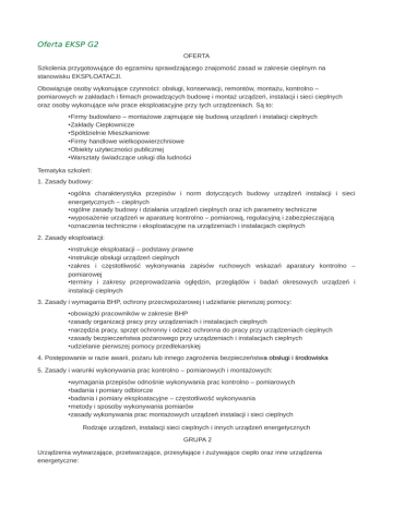 Oferta EKSP G2 OFERTA Szkolenia przygotowujące do egzaminu sprawdzającego znajomość zasad w zakresie cieplnym na stanowisku EKSPLOATACJI. Obowiązuje osoby wykonujące czynności: obsługi, konserwacji, remontów, montażu, kontrolno – pomiarowych w zakładach i firmach prowadzących budowę i montaż urządzeń, instalacji i sieci cieplnych oraz osoby wykonujące w/w prace eksploatacyjne przy tych urządzeniach. Są to: •Firmy budowlano – montażowe zajmujące się budową urządzeń i instalacji cieplnych •Zakłady Ciepłownicze •Spółdzielnie Mieszkaniowe •Firmy handlowe wielkopowierzchniowe •Obiekty użyteczności publicznej •Warsztaty świadczące usługi dla ludności Tematyka szkoleń: 1. Zasady budowy: •ogólna charakterystyka przepisów i norm dotyczących budowy urządzeń instalacji i sieci energetycznych – cieplnych •ogólne zasady budowy i działania urządzeń cieplnych oraz ich parametry techniczne •wyposażenie urządzeń w aparaturę kontrolno – pomiarową, regulacyjną i zabezpieczającą •oznaczenia techniczne i eksploatacyjne na urządzeniach i instalacjach cieplnych 2. Zasady eksploatacji: •instrukcje eksploatacji – podstawy prawne •instrukcje obsługi urządzeń cieplnych •zakres i częstotliwość wykonywania zapisów ruchowych wskazań aparatury kontrolno – pomiarowej •terminy i zakresy przeprowadzania oględzin, przeglądów i badań okresowych urządzeń i instalacji cieplnych 3. Zasady i wymagania BHP, ochrony przeciwpożarowej i udzielanie pierwszej pomocy: •obowiązki pracowników w zakresie BHP •zasady organizacji pracy przy urządzeniach i instalacjach cieplnych •narzędzia pracy, sprzęt ochronny i odzież ochronna do pracy przy urządzeniach cieplnych •zasady bezpieczeństwa pożarowego przy urządzeniach i instalacjach cieplnych •udzielanie pierwszej pomocy przedlekarskiej 4. Postępowanie w razie awarii, pożaru lub innego zagrożenia bezpieczeństwa obsługi i środowiska 5. Zasady i warunki wykonywania prac kontrolno – pomiarowych i montażowych: •wymagania przepisów odnośnie wykonywania prac kontrolno – pomiarowych •badania i pomiary odbiorcze •badania i pomiary eksploatacyjne – częstotliwość wykonywania •metody i sposoby wykonywania pomiarów •zasady wykonywania prac montażowych urządzeń instalacji i sieci cieplnych Rodzaje urządzeń, instalacji sieci cieplnych i innych urządzeń energetycznych GRUPA 2 Urządzenia wytwarzające, przetwarzające, przesyłające i zużywające ciepło oraz inne urządzenia energetyczne: 1.Kotły parowe oraz wodne na paliwa stałe, płynne i gazowe o mocy powyżej 50 kW, wraz z urządzeniami pomocniczymi 2.Sieci i instalacje cieplne wraz z urządzeniami pomocniczymi o przesyle ciepła powyżej 50 kW 3.Turbiny parowe oraz wodne o mocy powyżej 50 kW wraz z urządzeniami pomocniczymi 4.Przemysłowe urządzenia odbiorcze pary i gorącej wody o mocy powyżej 50kW 5.Urządzenia wentylacji, klimatyzacji i chłodnicze o mocy powyżej 50kW 6.Pompy, ssawy, wentylatory i dmuchawy o mocy powyżej 50 kW 7.Sprężarki o mocy powyżej 20 kW oraz instalacje sprężonego powietrza i gazów technicznych 8.Urządzenia do składowania, magazynowania i rozładunku paliw pojemności składowania odpowiadającej masie ponad 100 Mg 9.Piece przemysłowe o mocy powyżej 50 kW 10.Aparatura kontrolno – pomiarowa i urządzenia automatycznej regulacji do urządzeń i instalacji wymienionych w pkt. 1-9