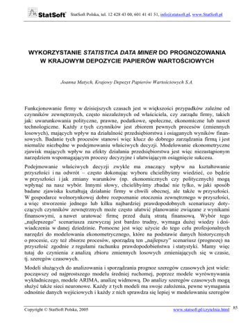 ® StatSoft Polska, tel. 12 428 43 00, 601 41 41 51, [email protected], www.StatSoft.pl WYKORZYSTANIE STATISTICA DATA MINER DO PROGNOZOWANIA W KRAJOWYM DEPOZYCIE PAPIERÓW WARTOŚCIOWYCH Joanna Matych, Krajowy Depozyt Papierów Wartościowych S.A. Funkcjonowanie firmy w dzisiejszych czasach jest w większości przypadków zależne od czynników zewnętrznych, często niezależnych od właściciela, czy zarządu firmy, takich jak: uwarunkowania polityczne, prawne, podatkowe, społeczne, ekonomiczne lub nawet technologiczne. Każdy z tych czynników jest zbiorem pewnych procesów (zmiennych losowych), mających wpływ na działalność przedsiębiorstwa i osiąganych wyników finansowych. Badanie tych procesów stanowi więc klucz do dobrego zarządzania firmą i jest niemalże niezbędne w podejmowaniu właściwych decyzji. Modelowanie ekonometryczne zjawisk mających wpływ na efekty działania przedsiębiorstwa jest więc niezastąpionym narzędziem wspomagającym procesy decyzyjne i ułatwiającym osiągnięcie sukcesu. Podejmowanie właściwych decyzji zwykle ma znaczący wpływ na kształtowanie przyszłości i na odwrót – często dokonując wyboru chcielibyśmy wiedzieć, co będzie w przyszłości i jak zmiany warunków (np. ekonomicznych czy politycznych) mogą wpłynąć na nasz wybór. Innymi słowy, chcielibyśmy zbadać nie tylko, w jaki sposób badane zjawiska kształtują działanie firmy w chwili obecnej, ale także w przyszłości. W gospodarce wolnorynkowej dobre rozpoznanie otoczenia zewnętrznego w przyszłości, a więc stworzenie jednego lub kilku najbardziej prawdopodobnych scenariuszy dotyczących czynników zewnętrznych może często ułatwić planowanie związane z wynikami finansowymi, a nawet uratować firmę przed dużą stratą finansową. Wybór tego „najlepszego” scenariusza zazwyczaj jest bardzo trudny, wymaga dużej wiedzy i doświadczenia w danej dziedzinie. Pomocne jest więc użycie do tego celu profesjonalnych narzędzi do modelowania ekonometrycznego, które na podstawie danych historycznych o procesie, czy też zbiorze procesów, sporządzą ten „najlepszy” scenariusz (prognozę) na przyszłość zgodnie z regułami rachunku prawdopodobieństwa i statystyki. Mamy więc tutaj do czynienia z analizą zbioru zmiennych losowych zmieniających się w czasie, tj. szeregów czasowych. Modeli służących do analizowania i sporządzania prognoz szeregów czasowych jest wiele: począwszy od najprostszego modelu średniej ruchomej, poprzez modele wyrównywania wykładniczego, modele ARIMA, analizę widmową. Do analizy szeregów czasowych mogą służyć także sieci neuronowe. Każdy z tych modeli ma swoje założenia, pewne wymagania odnośnie danych wejściowych i każdy z nich sprawdza się lepiej w modelowaniu szeregów Copyright © StatSoft Polska, 2005 www.statsoft.pl/czytelnia.html 85 ® StatSoft Polska, tel. 12 428 43 00, 601 41 41 51, [email protected], www.StatSoft.pl o różnych strukturach. W niniejszym opracowaniu przedstawiona zostanie próba analizy i sporządzenia prognozy dla szeregów czasowych dotyczących rynku kapitałowego w Polsce za pomocą modeli wyrównywania wykładniczego. Zaletą tego sposobu modelowania jest prostota jego działania oraz duża dokładność generowanych prognoz dla szeregów czasowych, które zbyt szybko nie zmieniają swojej struktury. Model wyrównywania wykładniczego Definicja modelu Prosty model wyrównywania wykładniczego zakłada, że każda obserwacja szeregu czasowego składa się ze stałej (b) i składnika losowego (ε), czyli: Xt b t , gdzie b jest stałą, która powoli może zmieniać się w czasie, a ε ma rozkład N(0,1). Stałą b wyznacza się jako pewnego rodzaju średnią, w której większe wagi przypisuje się obserwacjom nowszym, a wagi te maleją wykładniczo, zgodnie z następującym wzorem:. S t * X t (1 ) * S t 1 , gdzie: X t - wartość obserwowana w czasie t, S t - wartość wygładzonego szeregu w czasie t, - współczynnik wygładzania. Taka rekurencyjna procedura umożliwia obliczanie każdej kolejnej wartości wygładzonego szeregu jako średniej z poprzedniej obserwacji i poprzedniej wartości wygładzonej, która wyliczona była również według tej samej zasady. W wyniku takiej procedury każda wartość szeregu wygładzonego jest średnią wszystkich poprzednich obserwacji, przy czym wagi maleją wykładniczo, zależnie od parametru α. Zauważmy, że jeśli α=1, to szereg wygładzony jest taki sam jak szereg obserwowany, a jeśli α = 0, to szereg wygładzony jest stały i równy początkowej wartości obserwowanej S0. Należy więc założyć: 0 1 . Konstrukcja prostego modelu wyrównywania wykładniczego sprowadza się więc do wyznaczenia parametru α oraz wartości wygładzanej startowej S0. Obie te wartości program STATISTICA wylicza automatycznie, chociaż istnieje też możliwość konstrukcji modelu przy zdefiniowanych przez użytkownika parametrach. Powyższy model stosowany jest przy podstawowej procedurze wyrównywania wykładniczego. Jest ona użyteczna dla szeregów czasowych, w których nie występują trend i sezonowość. W rzeczywistości dość rzadko zdarzają się takie szeregi czasowe, dlatego też algorytm ten wzbogacono właśnie o te dwa składniki, które przy konstrukcji modelu dodaje się (lub mnoży) do wartości wygładzonej w prostym wyrównywaniu wykładniczym. 86 www.statsoft.pl/czytelnia.html Copyright © StatSoft Polska, 2005 ® StatSoft Polska, tel. 12 428 43 00, 601 41 41 51, [email protected], www.StatSoft.pl W przypadku gdy wartości szeregu co pewien stały okres p wzrastają o stałą wartość, np. 1 tys. PLN, to mamy do czynienia z sezonowością addytywną. W takim przypadku nasza prognoza w punkcie t przyjmuje postać: Prognoza t S t I t p , gdzie S t to wartość wygładzona prostym algorytmem, I t p – składnik sezonowości, p – długość okresu sezonowości. W przypadku sezonowości multiplikatywnej, tzn. kie