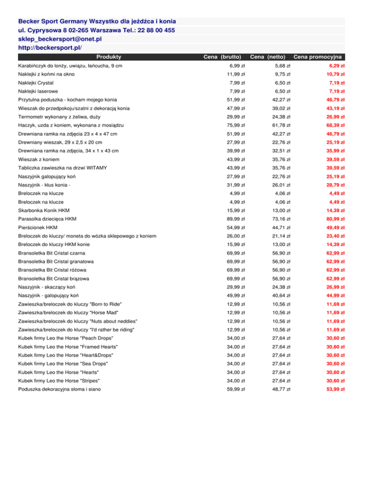 Becker Sport Germany Wszystko dla jeźdźca i konia ul. Cyprysowa 8 02-265 Warszawa Tel.: 22 88 00 455 [email protected] http://beckersport.pl/ Produkty Karabińczyk do lonży, uwiązu, łańcucha, 9 cm Cena (brutto) Cena (netto) Cena promocyjna 6,99 zł 5,68 zł 6,29 zł 11,99 zł 9,75 zł 10,79 zł Naklejki Crystal 7,99 zł 6,50 zł 7,19 zł Naklejki laserowe 7,99 zł 6,50 zł 7,19 zł Przytulna poduszka - kocham mojego konia 51,99 zł 42,27 zł 46,79 zł Wieszak do przedpokoju/szatni z dekoracją konia 47,99 zł 39,02 zł 43,19 zł Termometr wykonany z żeliwa, duży 29,99 zł 24,38 zł 26,99 zł Haczyk, uzda z koniem, wykonana z mosiądzu 75,99 zł 61,78 zł 68,39 zł Drewniana ramka na zdjęcia 23 x 4 x 47 cm 51,99 zł 42,27 zł 46,79 zł Drewniany wieszak, 29 x 2,5 x 20 cm 27,99 zł 22,76 zł 25,19 zł Drewniana ramka na zdjęcia, 34 x 1 x 43 cm 39,99 zł 32,51 zł 35,99 zł Wieszak z koniem 43,99 zł 35,76 zł 39,59 zł Tabliczka zawieszka na drzwi WITAMY 43,99 zł 35,76 zł 39,59 zł Naszyjnik galopujący koń 27,99 zł 22,76 zł 25,19 zł Naszyjnik - kłus konia - 31,99 zł 26,01 zł 28,79 zł 4,99 zł 4,06 zł 4,49 zł Naklejki z końmi na okno Breloczek na klucze Breloczek na klucze 4,99 zł 4,06 zł 4,49 zł Skarbonka Konik HKM 15,99 zł 13,00 zł 14,39 zł Parasolka dziecięca HKM 89,99 zł 73,16 zł 80,99 zł Pierścionek HKM 54,99 zł 44,71 zł 49,49 zł Breloczek do kluczy/ moneta do wózka sklepowego z koniem 26,00 zł 21,14 zł 23,40 zł Breloczek do kluczy HKM konie 15,99 zł 13,00 zł 14,39 zł Bransoletka Bit Cristal czarna 69,99 zł 56,90 zł 62,99 zł Bransoletka Bit Cristal granatowa 69,99 zł 56,90 zł 62,99 zł Bransoletka Bit Cristal różowa 69,99 zł 56,90 zł 62,99 zł Bransoletka Bit Cristal brązowa 69,99 zł 56,90 zł 62,99 zł Naszyjnik - skaczący koń 29,99 zł 24,38 zł 26,99 zł Naszyjnik - galopujący koń 49,99 zł 40,64 zł 44,99 zł Zawieszka/breloczek do kluczy "Born to Ride" 12,99 zł 10,56 zł 11,69 zł Zawieszka/breloczek do kluczy "Horse Mad" 12,99 zł 10,56 zł 11,69 zł Zawieszka/breloczek do kluczy "Nuts about neddies" 12,99 zł 10,56 zł 11,69 zł Zawieszka/breloczek do kluczy "I'd rather be riding" 12,99 zł 10,56 zł 11,69 zł Kubek firmy Leo the Horse "Peach Drops" 34,00 zł 27,64 zł 30,60 zł Kubek firmy Leo the Horse "Framed Hearts" 34,00 zł 27,64 zł 30,60 zł Kubek firmy Leo the Horse "Heart&Drops" 34,00 zł 27,64 zł 30,60 zł Kubek firmy Leo the Horse "Sea Drops" 34,00 zł 27,64 zł 30,60 zł Kubek firmy Leo the Horse "Hearts" 34,00 zł 27,64 zł 30,60 zł Kubek firmy Leo the Horse "Stripes" 34,00 zł 27,64 zł 30,60 zł Poduszka dekoracyjna słoma i siano 59,99 zł 48,77 zł 53,99 zł