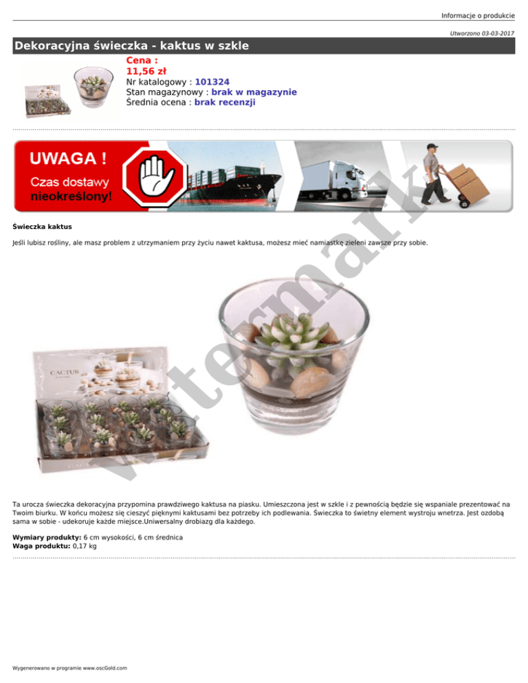 Informacje o produkcie Utworzono 03-03-2017 Dekoracyjna świeczka - kaktus w szkle Cena : 11,56 zł er m ar k Nr katalogowy : 101324 Stan magazynowy : brak w magazynie Średnia ocena : brak recenzji Świeczka kaktus w at Jeśli lubisz rośliny, ale masz problem z utrzymaniem przy życiu nawet kaktusa, możesz mieć namiastkę zieleni zawsze przy sobie. Ta urocza świeczka dekoracyjna przypomina prawdziwego kaktusa na piasku. Umieszczona jest w szkle i z pewnością będzie się wspaniale prezentować na Twoim biurku. W końcu możesz się cieszyć pięknymi kaktusami bez potrzeby ich podlewania. Świeczka to świetny element wystroju wnetrza. Jest ozdobą sama w sobie - udekoruje każde miejsce.Uniwersalny drobiazg dla każdego. Wymiary produkty: 6 cm wysokości, 6 cm średnica Waga produktu: 0,17 kg Wygenerowano w programie www.oscGold.com