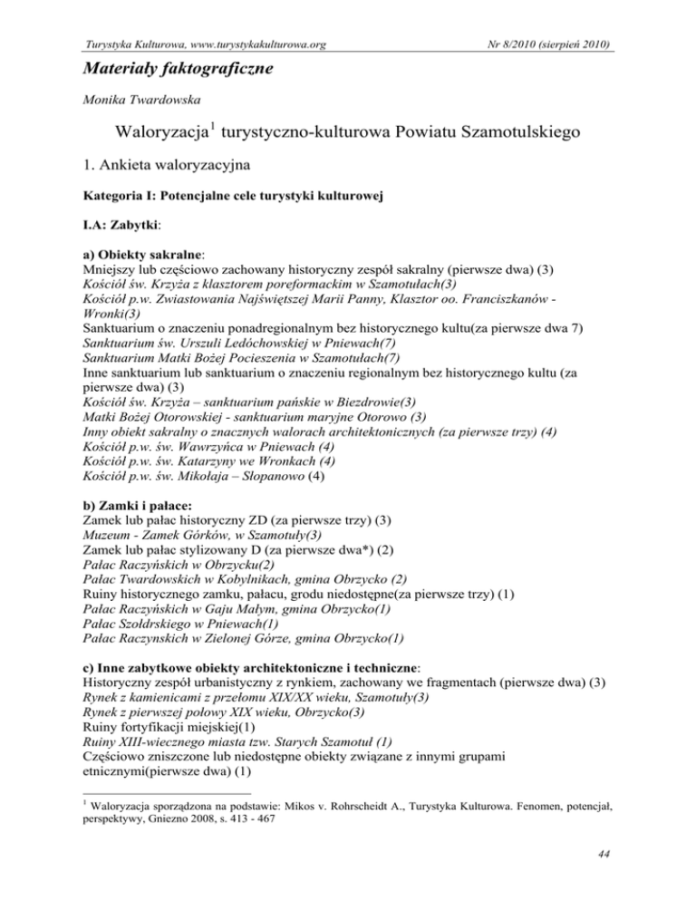 Turystyka Kulturowa, www.turystykakulturowa.org Nr 8/2010 (sierpień 2010) Materiały faktograficzne Monika Twardowska Waloryzacja1 turystyczno-kulturowa Powiatu Szamotulskiego 1. Ankieta waloryzacyjna Kategoria I: Potencjalne cele turystyki kulturowej I.A: Zabytki: a) Obiekty sakralne: Mniejszy lub częściowo zachowany historyczny zespół sakralny (pierwsze dwa) (3) Kościół św. Krzyża z klasztorem poreformackim w Szamotułach(3) Kościół p.w. Zwiastowania Najświętszej Marii Panny, Klasztor oo. Franciszkanów Wronki(3) Sanktuarium o znaczeniu ponadregionalnym bez historycznego kultu(za pierwsze dwa 7) Sanktuarium św. Urszuli Ledóchowskiej w Pniewach(7) Sanktuarium Matki Bożej Pocieszenia w Szamotułach(7) Inne sanktuarium lub sanktuarium o znaczeniu regionalnym bez historycznego kultu (za pierwsze dwa) (3) Kościół św. Krzyża – sanktuarium pańskie w Biezdrowie(3) Matki Bożej Otorowskiej - sanktuarium maryjne Otorowo (3) Inny obiekt sakralny o znacznych walorach architektonicznych (za pierwsze trzy) (4) Kościół p.w. św. Wawrzyńca w Pniewach (4) Kościół p.w. św. Katarzyny we Wronkach (4) Kościół p.w. św. Mikołaja – Słopanowo (4) b) Zamki i pałace: Zamek lub pałac historyczny ZD (za pierwsze trzy) (3) Muzeum - Zamek Górków, w Szamotuły(3) Zamek lub pałac stylizowany D (za pierwsze dwa*) (2) Pałac Raczyńskich w Obrzycku(2) Pałac Twardowskich w Kobylnikach, gmina Obrzycko (2) Ruiny historycznego zamku, pałacu, grodu niedostępne(za pierwsze trzy) (1) Pałac Raczyńskich w Gaju Małym, gmina Obrzycko(1) Pałac Szołdrskiego w Pniewach(1) Pałac Raczynskich w Zielonej Górze, gmina Obrzycko(1) c) Inne zabytkowe obiekty architektoniczne i techniczne: Historyczny zespół urbanistyczny z rynkiem, zachowany we fragmentach (pierwsze dwa) (3) Rynek z kamienicami z przełomu XIX/XX wieku, Szamotuły(3) Rynek z pierwszej połowy XIX wieku, Obrzycko(3) Ruiny fortyfikacji miejskiej(1) Ruiny XIII-wiecznego miasta tzw. Starych Szamotuł (1) Częściowo zniszczone lub niedostępne obiekty związane z innymi grupami etnicznymi(pierwsze dwa) (1) 1 Waloryzacja sporządzona na podstawie: Mikos v. Rohrscheidt A., Turystyka Kulturowa. Fenomen, potencjał, perspektywy, Gniezno 2008, s. 413 - 467 44 Turystyka Kulturowa, www.turystykakulturowa.org Nr 8/2010 (sierpień 2010) Synagoga żydowska w Obrzycku(1) I.B. Miejsca historyczne lub znaczące: a) Budowle historyczne i monumenty Monumenty (pomniki) o znaczeniu regionalnym (do trzech) (2) Pomnik Maksymiliana Ciężkiego brał udział w pracach nad złamaniem kodu EnigmySzamotuły(2) Pomnik Wacława z Szamotuł – Szamotuły(2) Pomnik Jerzego Sobocińskiego, rzeźbiarza – Pniewy(2) Pomniki lub obiekty małej architektury o znaczeniu lokalnym (do trzech****) (1) Pomnik ku czci Powstańców Wielkopolskich w Szamotułach(1) Pomnik Pomordowanych w II wojnie światowej – Wronki(1) b) Cmentarze historyczne Nekropolia zbiorowa znanych osobistości w skali regionu(do trzech)(2) Zbiorowy grób żołnierzy ( pomordowanych w I wojnie światowej oraz powstańców wielkopolskich), Szamotuły(2) Pojedyncze miejsce pochówku osobistości znanej w skali regionu (do trzech) (1) Grób Maksymiliana Ciężkiego, Szamotuły(2) I.C. Pojedyncze dzieła sztuki: Pojedyncze obiekty sztuki o znaczeniu krajowym (do trzech) (5) Ruska ikona „Szamotuł Pani” – Kolegiata - Szamotuły(5) Pierwsza nowoczesna mapa Polski Wacława Grodeckiego – Baszta Halszki – Szamotuły(5) I.D. Muzea i wystawy (w tym skanseny, galerie, muzea techniki) Muzea o znaczeniu regionalnym (do trzech )(5) Muzeum – Zamek Górków Szamotuły(5) Muzea o znaczeniu lokalnym(do trzech***)(2) Muzeum Regionalne – Wronki (2) Zorganizowane w ostatnim roku wystawy czasowe o zasięgu krajowym(w sumie za pierwsze trzy)(4) Muzeum-Zamek Górków w Szamotułach - Skarby Muzeum Historii Religii we Lwowie (marzec 2010) (4) Zorganizowane w ostatnim roku wystawy czasowe o zasięgu regionalnym* (w sumie za pierwsze trzy) (2) Muzeum - Zamek Górków – Szamotuły ”Uroki dawnej zabawki” (maj-wrzesień 2009) (2) Muzeum - Zamek Górków - Szamotuły „Kostiumy i szkice Ireneusz Domagała. Halszka i inne” (wrzesień 2009) (2) Muzeum - Zamek Górków - Szamotuły „Wystawa tkaniny artystycznej” (luty-marzec 2010) (2) Przy wszystkich zaliczonych muzeach i ekspozycjach dodatkowe punkty za: Przewodnicy obiektowi stali (2) Muzeum - Zamek Górków Szamotuły(2) Własny materiał informacyjny, wydany nie dawniej ni_ 5 lat : (1) Muzeum-Zamek Górków - Szamotuły „Szamotuły Karty z dziejów miasta” pod redakcją Antoniego Gąsiorowskiego (1) Sklep muzealny otwarty w godzinach pracy muzeum (1) Muzeum - Zamek Górków Szamotuły(1) 45 Turystyka Kulturowa, www.turystykakulturowa.org Nr 8/2010 (sierpień 2010) Przy muzeach regionalnych i lokalnych punkty dodatkowe za: Stałe godziny otwarcia(1) Muzeum - Zamek Górków w Szamotułach (1) Pojedyncze eksponaty lub kolekcje o znaczeniu międzynarodowym(do dwóch w sumie)(2) Muzeum - Zamek Górków w Szamotułach bogata kolekcja ikon – (2) I.E. Eventy kulturowe: Regularne eventy kultury wysokiej o znaczeniu regionalnym (do dwóch)(4) Mistrzowskie Kursy Wiolonczelowe (czerwiec),Szamotuły(4) Festiwal Teatrów Dzieci i Młodzieży, Pniewy (4) Regularny eventy kultury masowej o znaczeniu regionalnym(do trzech)(4) Muzeum - Zamek Górków – Szamotuły, Spotkania Zespołów Chóralnych „Świat Wacława z Szamotuł”(4) Duszniki - Wielkopolski Festiwal Ludowych Zespołów Śpiewaczych KGW (4) Duszniki - Międzypowiatowy Konkurs Piosenkarski „Śpiewać każdy może” (4) Regularne inscenizacje historyczne lub militarne o znaczeniu regionalnym (do dwóch) (4) Baborówko – Turniej Rycerski (wrzesień) (4) I.F. Funkcjonujące zakłady przemysłowe z oferta turystyczna: Brak I.G. Kulturowo znacząca oferta przyrodnicza: Ogród przy rezydencji, park kultywowany (za pierwsze dwa obiekty) (2) Park pałacowy – Pałac Obrzycko (2) Park p