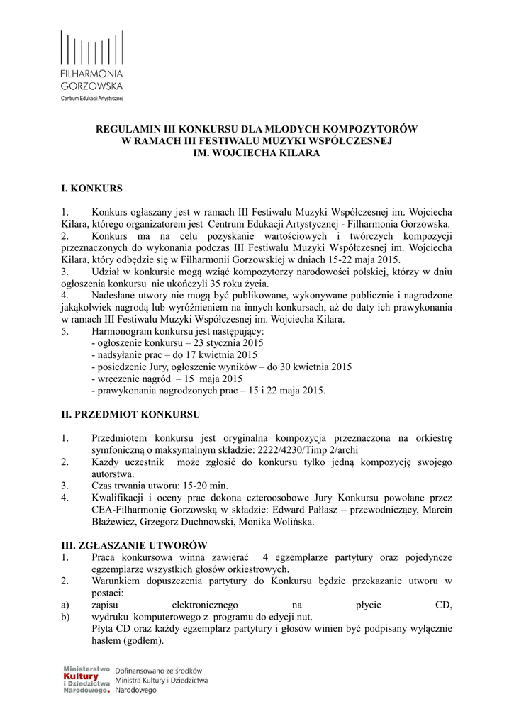 Centrum Edukacji Artystycznej REGULAMIN III KONKURSU DLA MŁODYCH KOMPOZYTORÓW W RAMACH III FESTIWALU MUZYKI WSPÓŁCZESNEJ IM. WOJCIECHA KILARA I. KONKURS 1. Konkurs ogłaszany jest w ramach III Festiwalu Muzyki Współczesnej im. Wojciecha Kilara, którego organizatorem jest Centrum Edukacji Artystycznej - Filharmonia Gorzowska. 2. Konkurs ma na celu pozyskanie wartościowych i twórczych kompozycji przeznaczonych do wykonania podczas III Festiwalu Muzyki Współczesnej im. Wojciecha Kilara, który odbędzie się w Filharmonii Gorzowskiej w dniach 15-22 maja 2015. 3. Udział w konkursie mogą wziąć kompozytorzy narodowości polskiej, którzy w dniu ogłoszenia konkursu nie ukończyli 35 roku życia. 4. Nadesłane utwory nie mogą być publikowane, wykonywane publicznie i nagrodzone jakąkolwiek nagrodą lub wyróżnieniem na innych konkursach, aż do daty ich prawykonania w ramach III Festiwalu Muzyki Współczesnej im. Wojciecha Kilara. 5. Harmonogram konkursu jest następujący: - ogłoszenie konkursu – 23 stycznia 2015 - nadsyłanie prac – do 17 kwietnia 2015 - posiedzenie Jury, ogłoszenie wyników – do 30 kwietnia 2015 - wręczenie nagród – 15 maja 2015 - prawykonania nagrodzonych prac – 15 i 22 maja 2015. II. PRZEDMIOT KONKURSU 1. 2. 3. 4. Przedmiotem konkursu jest oryginalna kompozycja przeznaczona na orkiestrę symfoniczną o maksymalnym składzie: 2222/4230/Timp 2/archi Każdy uczestnik może zgłosić do konkursu tylko jedną kompozycję swojego autorstwa. Czas trwania utworu: 15-20 min. Kwalifikacji i oceny prac dokona czteroosobowe Jury Konkursu powołane przez CEA-Filharmonię Gorzowską w składzie: Edward Pałłasz – przewodniczący, Marcin Błażewicz, Grzegorz Duchnowski, Monika Wolińska. III. ZGŁASZANIE UTWORÓW 1. Praca konkursowa winna zawierać 4 egzemplarze partytury oraz pojedyncze egzemplarze wszystkich głosów orkiestrowych. 2. Warunkiem dopuszczenia partytury do Konkursu będzie przekazanie utworu w postaci: a) zapisu elektronicznego na płycie CD, b) wydruku komputerowego z programu do edycji nut. Płyta CD oraz każdy egzemplarz partytury i głosów winien być podpisany wyłącznie hasłem (godłem). Centrum Edukacji Artystycznej 3. a) b) 4. 5. 6. Wraz z pracą konkursową na adres Organizatora powinny zostać wysłane następujące dokumenty: wypełniony formularz zgłoszeniowy, stanowiący załącznik nr 1 do niniejszego Regulaminu, wraz z podpisaną zgodą autora na przetwarzanie i publikację danych osobowych podpisane przez autora oświadczenia, stanowiące załącznik nr 2 do niniejszego Regulaminu Formularz zgłoszeniowy oraz oświadczenia należy dołączyć w kopercie oznaczonej hasłem (godłem). Pracę konkursową oraz wymagane dokumenty należy przesłać w zamkniętej kopercie oznaczonej hasłem (godłem) na adres Organizatora konkursu: CEA – Filharmonia Gorzowska ul. Dziewięciu Muz 10 66-400 Gorzów Wielkopolski tel.: 95 739 27 00 e-mail: [email protected] Termin nadsyłania materiałów upływa 17 kwietnia 2015. Decyduje data stempla pocztowego. Wyniki zostaną ogłoszone do dnia 30 kwietnia 2015 na stronie internetowej Organizatora Konkursu. IV. NAGRODY 1. 2. Jury przyzna dwie nagrody pieniężne, w wysokości: I nagroda – 12 000 zł II nagroda – 8 000 zł Nagrody pieniężne są kwotami brutto i stosownie do zapisu art. 30 ust. 1 pkt 2 oraz ust. 3 ustawy z dnia 26.07.1991 r. o podatku dochodowym od osób fizycznych, Organizator zobowiązany jest pobrać podatek w formie ryczałtu, w wysokości 10% wartości nagrody. Nagroda zostanie wypłacona w kwocie netto, przelewem na konto bankowe laureata w terminie 14 dni od ogłoszenia werdyktu. 3. Jury może zdecydować o nieprzyznaniu nagród lub o przyznaniu dodatkowych wyróżnień. 4. 5. Jury ma prawo innego niż przewiduje regulamin podziału nagród. W ramach przyznanych nagród Organizator Konkursu zapewnia dodatkowo prawykonanie kompozycji przez Orkiestrę Filharmonii Gorzowskiej podczas koncertów galowych organizowanych w ramach III Festiwalu Muzyki Współczesnej im. Wojciecha Kilara, promocję tych prawykonań oraz ich rejestrację archiwalną. Centrum Edukacji Artystycznej 6. 7. 8. Nagrodzeni kompozytorzy wyrażają zgodę na nieodpłatną rejestrację wykonania utworu w postaci nagrania live, przy czym Organizator zastrzega sobie prawo do dysponowania nagranym materiałem. Wypłata nagród nastąpi w przeciągu miesiąca od daty oficjalnego ogłoszenia wyników podczas III Festiwalu Muzyki Współczesnej im. Wojciecha Kilara. Decyzje Jury są ostateczne. V. POSTANOWIENIA KOŃCOWE 1. 2. 3. 4. Wzięcie udziału w Konkursie jest jednoznaczne z zaakceptowaniem warunków niniejszego Regulaminu. Prace niespełniające wymogów regulaminu nie zostaną zakwalifikowane do konkursu. Organizator nie zwraca nadesłanych materiałów. Załączniki do Regulaminu znajdują się na stronie Organizatora w formie plików do pobrania. KONTAKT: CEA – Filharmonia Gorzowska ul. Dziewięciu Muz 10 66-400 Gorzów Wielkopolski T: 95 739 27 00 E: [email protected] www.filharmoniagorzowska.pl