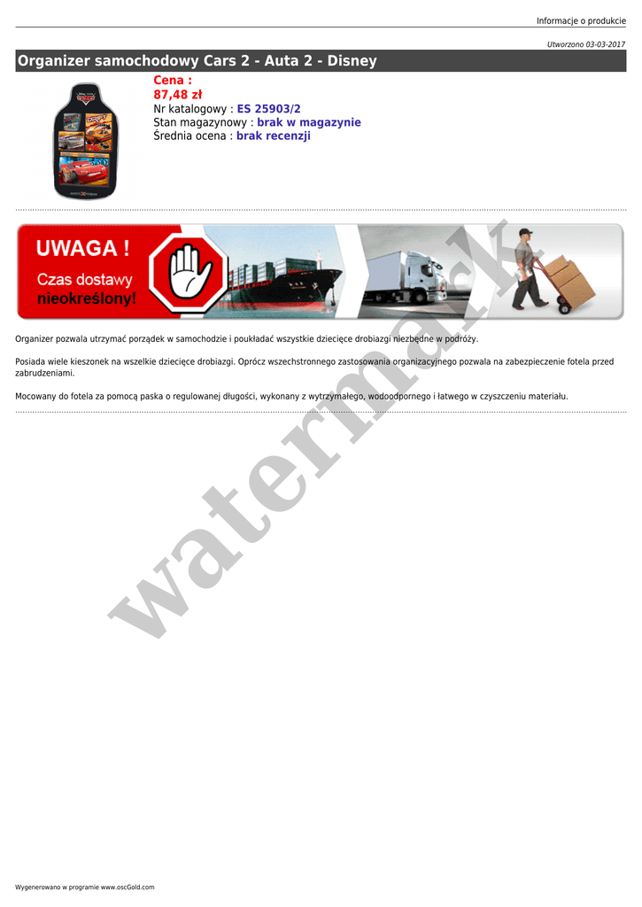 Informacje o produkcie Utworzono 03-03-2017 Organizer samochodowy Cars 2 - Auta 2 - Disney Cena : 87,48 zł er m ar k Nr katalogowy : ES 25903/2 Stan magazynowy : brak w magazynie Średnia ocena : brak recenzji Organizer pozwala utrzymać porządek w samochodzie i poukładać wszystkie dziecięce drobiazgi niezbędne w podróży. Posiada wiele kieszonek na wszelkie dziecięce drobiazgi. Oprócz wszechstronnego zastosowania organizacyjnego pozwala na zabezpieczenie fotela przed zabrudzeniami. w at Mocowany do fotela za pomocą paska o regulowanej długości, wykonany z wytrzymałego, wodoodpornego i łatwego w czyszczeniu materiału. Wygenerowano w programie www.oscGold.com