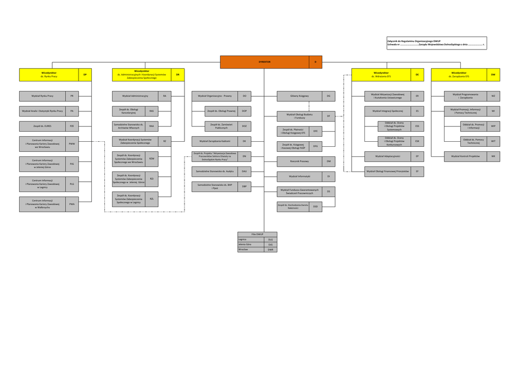 Załącznik do Regulaminu Organizacyjnego DWUP Uchwała nr ………………………...Zarządu Województwa Dolnośląskiego z dnia ………………….. r. DYREKTOR Wicedyrektor ds. Rynku Pracy DP Wydział Rynku Pracy PR Wydział Analiz i Statystyki Rynku Pracy PA Zespół ds. EURES Centrum Informacji i Planowania Kariery Zawodowej we Wrocławiu Centrum Informacji i Planowania Kariery Zawodowej w Jeleniej Górze Centrum Informacji i Planowania Kariery Zawodowej w Legnicy Centrum Informacji i Planowania Kariery Zawodowej w Wałbrzychu PZE PWW PJG PLG PWA Wicedyrektor ds. Administracyjnych i Koordynacji Systemów Zabezpieczenia Społecznego Wydział Administracyjny Zespół ds. Obsługi Kancelaryjnej Samodzielne Stanowisko ds. Archiwów Własnych RA RAS Wydział Koordynacji Systemów Zabezpieczenia Społecznego Zespół ds. Koordynacji Systemów Zabezpieczenia Społecznego we Wrocławiu RZW Zespół ds. Koordynacji Systemów Zabezpieczenia Społecznego w Jeleniej Górze RZJ Zespół ds. Koordynacji Systemów Zabezpieczenia Społecznego w Legnicy DR Wydział Organizacyjno - Prawny Zespół ds. Obsługi Prawnej Zespół ds. Zamówień Publicznych RAA RZ D Wydział Zarządzania Kadrami DO DG Wydział Obsługi Budżetu i Funduszy DF DOP DOZ Zespół ds. Płatności i Obsługi Księgowej EFS DFE Zespół ds. Księgowej i Kasowej Obsługi FGŚP DFG DK Zespół ds. Projektu "Aktywizacja Zawodowa Pracowników Sektora Oświaty na Dolnośląskim Rynku Pracy" DN Samodzielne Stanowisko ds. Audytu DAU Samodzielne Stanowisko ds. BHP i Ppoż Glówny Księgowy Rzecznik Prasowy DM Wydział Informatyki DI Wydział Funduszu Gwarantowanych Świadczeń Pracowniczych DS DBP RZL Zespół ds. Dochodzenia Zwrotu Należności Filie DWUP Legnica DLG Jelenia Góra DJG Wrocław DWR DSD Wicedyrektor ds. Wdrażania EFS DE Wicedyrektor ds. Zarządzania EFS Wydział Aktywizacji Zawodowej i Kształcenia Ustawicznego ER Wydział Programowania i Zarządzania WZ Wydział Integracji Społecznej ES Wydział Promocji, Informacji i Pomocy Technicznej WI DW Oddział ds. Oceny i Obsługi Projektów Systemowych ESS Oddział ds. Promocji i Informacji WIP Oddział ds. Oceny i Obsługi Projektów Konkursowych ESK Oddział ds. Pomocy Technicznej WIT Wydział Adaptacyjności EP Wydział Obsługi Finansowej Priorytetów EF Wydział Kontroli Projektów WK