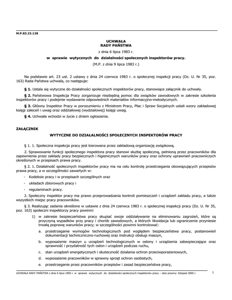 M.P.83.23.128 UCHWAŁA RADY PAŃSTWA z dnia 6 lipca 1983 r. w sprawie wytycznych do działalności społecznych inspektorów pracy. (M.P. z dnia 9 lipca 1983 r.) Na podstawie art. 23 ust. 2 ustawy z dnia 24 czerwca 1983 r. o społecznej inspekcji pracy (Dz. U. Nr 35, poz. 163) Rada Państwa uchwala, co następuje: § 1. Ustala się wytyczne do działalności społecznych inspektorów pracy, stanowiące załącznik do uchwały. § 2. Państwowa Inspekcja Pracy zorganizuje niezbędną pomoc dla związków zawodowych w zakresie szkolenia inspektorów pracy i podejmie wydawanie odpowiednich materiałów informacyjno-metodycznych. § 3. Główny Inspektor Pracy w porozumieniu z Ministrem Pracy, Płac i Spraw Socjalnych ustali wzory zakładowej księgi zaleceń i uwag oraz oddziałowej (wydziałowej) księgi uwag. § 4. Uchwała wchodzi w życie z dniem ogłoszenia. ZAŁĄCZNIK WYTYCZNE DO DZIAŁALNOŚCI SPOŁECZNYCH INSPEKTORÓW PRACY § 1. 1. Społeczna inspekcja pracy jest kierowana przez zakładową organizację związkową. 2. Sprawowanie funkcji społecznego inspektora pracy stanowi służbę społeczną, pełnioną przez pracowników dla zapewnienia przez zakłady pracy bezpiecznych i higienicznych warunków pracy oraz ochrony uprawnień pracowniczych określonych w przepisach prawa pracy. § 2. 1. Działalność społecznych inspektorów pracy ma na celu kontrolę przestrzegania obowiązujących przepisów prawa pracy, a w szczególności zawartych w: - Kodeksie pracy i w przepisach szczególnych oraz - układach zbiorowych pracy i - regulaminach pracy. 2. Społeczny inspektor pracy ma prawo przeprowadzania kontroli pomieszczeń i urządzeń zakładu pracy, a także wszystkich miejsc pracy pracowników. § 3. Realizując zadania określone w ustawie z dnia 24 czerwca 1983 r. o społecznej inspekcji pracy (Dz. U. Nr 35, poz. 163) społeczni inspektorzy pracy powinni: 1) w zakresie bezpieczeństwa pracy skupiać swoje oddziaływanie na eliminowaniu zagrożeń, które są przyczyną wypadków przy pracy i chorób zawodowych, a których likwidacja lub ograniczenie przyniesie trwałą poprawę warunków pracy; w szczególności powinni kontrolować: a. przestrzeganie wymogów technologicznych pod względem bezpieczeństwa pracy, postanowień dokumentacji techniczniczno-ruchowej oraz instrukcji obsługi maszyn, b. wyposażenie maszyn u urządzeń technologicznych w osłony i urządzenia zabezpieczające oraz sprawność i przydatność tych osłon i urządzeń podczas ruchu, c. stan urządzeń energetycznych i skuteczność działania ochron przeciwporażeniowych, d. wyposażenie pracowników w sprawny sprzęt ochron osobistych, e. przestrzeganie przez pracowników przepisów i zasad bezpieczeństwa pracy, UCHWAŁA RADY PAŃSTWA z dnia 6 lipca 1983 r. w sprawie wytycznych do działalności społecznych inspektorów pracy – stan prawny: listopad 2005 r. 1 2) w zakresie higieny pracy kontrolować: a. zapewnianie pracownikom, zgodnie z obowiązującymi przepisami: szatni, pomieszczeń do spożywania posiłków, urządzeń higieniczno-sanitarnych odpowiednich do rodzaju pracy i liczby osób, b. przestrzeganie norm higienicznych, a w szczególności dotyczących substancji szkodliwych, zapylenia, hałasu, wibracji, mikroklimatu i oświetlenia, c. wydawanie przysługujących na określonych stanowiskach pracy środków odżywczych, napojów i środków higieny osobistej, d. poddawanie pracowników obowiązkowym badaniom profilaktycznym oraz ważność orzeczeń lekarskich stwierdzających brak przeciwwskazań do zatrudnienia na danym stanowisku pracy pracowników zatrudnionych w uciążliwych i szkodliwych warunkach dla zdrowia, 3) w zakresie prawnej ochrony pracy kontrolować w szczególności przestrzeganie przepisów dotyczących: a. skróconego czasu pracy wprowadzonego ze względu na uciążliwe lub szkodliwe warunki pracy, b. ochrony pracy kobiet i młodocianych, zwłaszcza czy osoby te nie są zatrudnione przy pracach im wzbronionych, a czas pracy jest zgodny z przepisami prawa pracy, c. ustalania przyczyn i okoliczności wypadków przy pracy, d. świadczeń pieniężnych z tytułu wypadków przy pracy i chorób zawodowych oraz świadczeń należnych z układów zbiorowych pracy. § 4. 1. Grupowy społeczny inspektor pracy obejmuje swoją działalnością pracowników komórki organizacyjnej, w której został wybrany, realizując odpowiednio zadania określone w § 3. 2. W razie stwierdzenia naruszeń przepisów, grupowy społeczny inspektor pracy informuje o tym bezpośredniego przełożonego, czyniąc jednocześnie stosowny zapis w oddziałowej (wydziałowej) księdze uwag. § 5. 1. Oddziałowy (wydziałowy) społeczny inspektor pracy obejmuje swoją działalnością oddział (wydział), realizując odpowiednio zadania, o których mowa w § 3, na podstawie planu pracy. 2. Na podstawie ustaleń własnych bądź grupowego społecznego inspektora pracy oddziałowy (wydziałowy) społeczny inspektor pracy informuje kierownika oddziału (wydziału) o stwierdzonych uchybieniach i naruszeniach, czyniąc jednocześnie stosowny zapis w oddziałowej (wydziałowej) księdze uwag. 3. W razie stwierdzenia naruszeń, których usunięcie należy do kompetencji kierownika zakładu pracy, oddziałowy (wydziałowy) społeczny inspektor pracy przedstawia zakładowemu społecznemu inspektorowi pracy wnioski w sprawie uwag lub zaleceń. § 6. Oddziałowi (wydziałowi) i grupowi społeczni inspektorzy pracy składają sprawozdania zakładowemu społecznemu inspektorowi pracy z realizacji swoich planów pracy. § 7. 1. Zakładowy społeczny inspektor pracy prowadzi działalność na podstawie planu pracy zatwierdzonego przez zakładową organizację związkową. 2. W planie pracy, o którym mowa w ust. 1, należy określać zamierzenia związane z kontrolą poszczególnych zagadnień ochrony pracy, organizacją społecznych przeglądów warunków pracy, rodzajem i częstotliwością kontroli przeprowadzanych