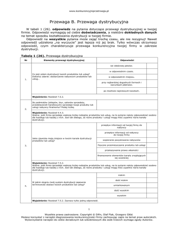 www.konkurencyjniprzetrwaja.pl Przewaga B. Przewaga dystrybucyjna W tabeli 1 (26). odpowiedz na pytania dotyczące przewagi dystrybucyjnej w twojej firmie. Odpowiedzi wymagają od ciebie doświadczenia, a niektóre dokładnych danych na temat sposobu kształtowania dystrybucji w twojej firmie. Odpowiedź na wszystkie pytania może zająć trochę czasu, ale nie rezygnuj! Nawet odpowiedź udzielona „na wyczucie” jest lepsza niż jej brak. Tylko wówczas otrzymasz odpowiedź, czym charakteryzuje przewaga konkurencyjna twojej firmy w zakresie dystrybucji. Tabela 1 (26). Przewaga dystrybucyjna Nr Elementy przewagi dystrybucyjnej Odpowiedzi we właściwej jakości. w odpowiednim czasie. 1. Co jest celem dystrybucji twoich produktów lub usług? Dokończ zdanie: dostarczenie nabywcom produktów lub usług… w odpowiednim miejscu. przy najbardziej dogodnych formach i warunkach płatności. po możliwie najniższych kosztach. Wyjaśnienie: Rozdział 7.5.2. Ile podmiotów (sklepów, biur, salonów sprzedaży, przedstawicieli handlowych) sprzedaje twoje produkty lub usługi nabywcy finalnemu? Podaj liczbę. 2. Wyjaśnienie: Rozdział 4.4.3. Ważne: jeśli firma sprzedaje większą liczbę rodzajów produktów lub usług, na to pytanie należy odpowiedzieć osobno dla każdego lub każdej z nich. Jest tak dlatego, że różne produkty i usługi mogą mieć zupełnie różne kanały dystrybucji. przepływ informacji od twojej firmy do nabywcy przepływ informacji od nabywcy do twojej firmy Jakie zjawiska mają miejsce w twoim kanale dystrybucji produktów lub usług? wspieranie pozyskiwania nabywców fizyczne przemieszczanie produktu lub usługi 3. przekazywanie prawa własności finansowanie elementów kanału znajdujących się wcześniej Wyjaśnienie: Rozdział 7.5.2. Ważne: jeśli firma sprzedaje większą liczbę rodzajów produktów lub usług, na to pytanie należy odpowiedzieć osobno dla każdego lub każdej z nich. Jest tak dlatego, że różne produkty i usługi mogą mieć zupełnie różne kanały dystrybucji. niskim dość niskim 4. W jakim stopniu twój system dystrybucji zapewnia terminowość dostaw twoich produktów lub usług? umiarkowanym dość wysokim wysokim Wyjaśnienie: Rozdział 7.5.2. Zaznacz tylko jedną odpowiedź. 1 Wszelkie prawa zastrzeżone. Copyright © Difin, Olaf Flak, Grzegorz Głód. Możesz korzystać z narzędzi diagnozowania konkurencyjności firmy zachowując zapis na temat praw autorskich. Wykorzystanie narzędzi do celów doradczych lub szkoleniowych dla osób trzecich wymaga zgody Autorów. www.konkurencyjniprzetrwaja.pl niskim dość niskim W jakim stopniu twój system dystrybucji zapewnia dogodne miejsca zakupu twoich produktów lub usług? 5. umiarkowanym dość wysokim wysokim Wyjaśnienie: Rozdział 7.2. Zaznacz tylko jedną odpowiedź. Ważne: jeśli firma sprzedaje większą liczbę rodzajów produktów lub usług, na to pytanie należy odpowiedzieć osobno dla każdego lub każdej z nich. Jest tak dlatego, że różne produkty i usługi mogą mieć zupełnie różne kanały dystrybucji. niskim W jakim stopniu twój system dystrybucji zapewnia dogodny czas zakupu twoich produktów lub usług? 6. dość niskim umiarkowanym dość wysokim wysokim Wyjaśnienie: Rozdział 7.5.2. Zaznacz tylko jedną odpowiedź. Ważne: jeśli firma sprzedaje większą liczbę rodzajów produktów lub usług, na to pytanie należy odpowiedzieć osobno dla każdego lub każdej z nich. Jest tak dlatego, że różne produkty i usługi mogą mieć zupełnie różne kanały dystrybucji. niskim dość niskim W jakim stopniu twój system dystrybucji zapewnia dostępność części zamiennych twoich produktów lub możliwość ponownego świadczenia usług? umiarkowanym 7. dość wysokim wysokim Wyjaśnienie: Rozdział 7.5.2. Zaznacz tylko jedną odpowiedź. Ważne: jeśli firma sprzedaje większą liczbę rodzajów produktów lub usług, na to pytanie należy odpowiedzieć osobno dla każdego lub każdej z nich. Jest tak dlatego, że różne produkty i usługi mogą mieć zupełnie różne kanały dystrybucji. niskim 8. dość niskim W jakim stopniu twój system dystrybucji zapewnia wprowadzanie nowych produktów lub usług na nowe obszary geograficzne? umiarkowanym dość wysokim wysokim Wyjaśnienie: Rozdział 7.3. Zaznacz tylko jedną odpowiedź. niskim 9. W jakim stopniu twój system dystrybucji zapewnia wprowadzanie nowych produktów lub usług do nowych segmentów rynku? dość niskim umiarkowanym dość wysokim wysokim Wyjaśnienie: Rozdział 7.3. Zaznacz tylko jedną odpowiedź. niskim dość niskim W jakim stopniu twój system dystrybucji zapewnia możliwość serwisowania produktów lub usług? umiarkowanym 10. dość wysokim wysokim Wyjaśnienie: Rozdział 7.5.2. Zaznacz tylko jedną odpowiedź. Ważne: jeśli firma sprzedaje większą liczbę rodzajów produktów lub usług, na to pytanie należy odpowiedzieć osobno 2 Wszelkie prawa zastrzeżone. Copyright © Difin, Olaf Flak, Grzegorz Głód. Możesz korzystać z narzędzi diagnozowania konkurencyjności firmy zachowując zapis na temat praw autorskich. Wykorzystanie narzędzi do celów doradczych lub szkoleniowych dla osób trzecich wymaga zgody Autorów. www.konkurencyjniprzetrwaja.pl dla każdego lub każdej z nich. Jest tak dlatego, że różne produkty i usługi mogą mieć zupełnie różne kanały dystrybucji. niskim W jakim stopniu twój system dystrybucji zapewnia optymalizację wielkości dostaw twoich produktów lub usług? 11. dość niskim umiarkowanym dość wysokim wysokim Wyjaśnienie: Rozdział 7.5.2. Zaznacz tylko jedną odpowiedź. Ważne: jeśli firma sprzedaje większą liczbę rodzajów produktów lub usług, na to pytanie należy odpowiedzieć osobno dla każdego lub każdej z nich. Jest tak dlatego, że różne produkty i usługi mogą mieć zupełnie różne kanały dystrybucji. twoja firma i nabywca twoja firma, detalista i nabywca Który z przedstawionych schematów kanału dystry