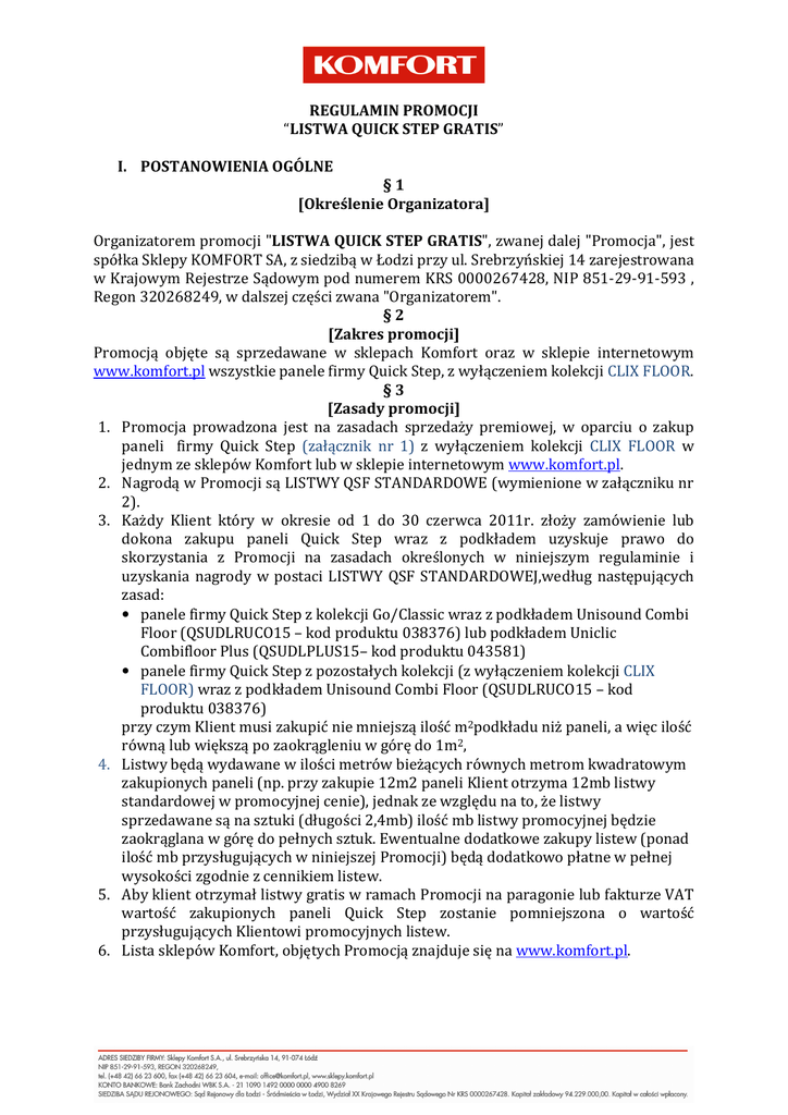 REGULAMIN PROMOCJI “LISTWA QUICK STEP GRATIS” I. POSTANOWIENIA OGÓLNE §1 [Określenie Organizatora] Organizatorem promocji "LISTWA QUICK STEP GRATIS", zwanej dalej "Promocja", jest spółka Sklepy KOMFORT SA, z siedzibą w Łodzi przy ul. Srebrzyńskiej 14 zarejestrowana w Krajowym Rejestrze Sądowym pod numerem KRS 0000267428, NIP 851-29-91-593 , Regon 320268249, w dalszej części zwana "Organizatorem". §2 [Zakres promocji] Promocją objęte są sprzedawane w sklepach Komfort oraz w sklepie internetowym www.komfort.pl wszystkie panele firmy Quick Step, z wyłączeniem kolekcji CLIX FLOOR. §3 [Zasady promocji] 1. Promocja prowadzona jest na zasadach sprzedaży premiowej, w oparciu o zakup paneli firmy Quick Step (załącznik nr 1) z wyłączeniem kolekcji CLIX FLOOR w jednym ze sklepów Komfort lub w sklepie internetowym www.komfort.pl. 2. Nagrodą w Promocji są LISTWY QSF STANDARDOWE (wymienione w załączniku nr 2). 3. Każdy Klient który w okresie od 1 do 30 czerwca 2011r. złoży zamówienie lub dokona zakupu paneli Quick Step wraz z podkładem uzyskuje prawo do skorzystania z Promocji na zasadach określonych w niniejszym regulaminie i uzyskania nagrody w postaci LISTWY QSF STANDARDOWEJ,według następujących zasad: • panele firmy Quick Step z kolekcji Go/Classic wraz z podkładem Unisound Combi Floor (QSUDLRUCO15 – kod produktu 038376) lub podkładem Uniclic Combifloor Plus (QSUDLPLUS15– kod produktu 043581) • panele firmy Quick Step z pozostałych kolekcji (z wyłączeniem kolekcji CLIX FLOOR) wraz z podkładem Unisound Combi Floor (QSUDLRUCO15 – kod produktu 038376) przy czym Klient musi zakupić nie mniejszą ilość m2podkładu niż paneli, a więc ilość równą lub większą po zaokrągleniu w górę do 1m2, 4. Listwy będą wydawane w ilości metrów bieżących równych metrom kwadratowym zakupionych paneli (np. przy zakupie 12m2 paneli Klient otrzyma 12mb listwy standardowej w promocyjnej cenie), jednak ze względu na to, że listwy sprzedawane są na sztuki (długości 2,4mb) ilość mb listwy promocyjnej będzie zaokrąglana w górę do pełnych sztuk. Ewentualne dodatkowe zakupy listew (ponad ilość mb przysługujących w niniejszej Promocji) będą dodatkowo płatne w pełnej wysokości zgodnie z cennikiem listew. 5. Aby klient otrzymał listwy gratis w ramach Promocji na paragonie lub fakturze VAT wartość zakupionych paneli Quick Step zostanie pomniejszona o wartość przysługujących Klientowi promocyjnych listew. 6. Lista sklepów Komfort, objętych Promocją znajduje się na www.komfort.pl. 1. 2. 3. 4. §4 [Ograniczenie promocji] Promocja obowiązuje w okresie od 1 do 30 czerwca 2011r. W Promocji nie biorą udziału panele Quick Step z kolekcji CLIX FLOOR Jeżeli czas realizacji zamówienia na panele Quick Step przekracza okres trwania Promocji uczestnik nie traci prawa do odbioru nagrody. Promocja nie łączy się z innymi akcjami promocyjnymi i rabatami, obowiązującymi w trakcie jej trwania w sklepach Komfort, w tym z rabatami wynikającymi z kart rabatowych. §5 [Określenie podmiotów uprawnionych do udziału w programie] W Promocji może wziąć udział każda pełnoletnia osoba będąca klientem jednego z wymienionych w § 4 pkt. 1 sklepów KOMFORT. Warunki promocji nie dotyczą klientów prowadzących działalność gospodarczą w jakiejkolwiek formie prawnej. §6 [Gwarancja na produkty] Wszystkie produkty nabyte w ramach akcji promocyjnej posiadają takie same prawa regulowane przez polskie prawo i ofertę producentów, jak pozostałe produkty będące w ofercie handlowej sieci Komfort. §7 [Zwroty] Różnica pomiędzy wartością promocyjną za listwy a ceną zgodną z cennikiem w sklepach Komfort nie podlega wymianie na gotówkę.. POSTANOWIENIA KOŃCOWE §8 [Zmiany w regulaminie] Sklepy Komfort S.A. ul. Srebrzyńska 14, 91-074 Łódź , zastrzega sobie możliwość dokonania w każdym czasie zmian w postanowieniach niniejszego regulaminu. §9 [Prawo do ostatecznej interpretacji regulaminu] W wypadku jakichkolwiek wątpliwości związanych ze stosowaniem niniejszego regulaminu organizator zastrzega sobie prawo do ostatecznej interpretacji jego postanowień. W wypadku wątpliwości co do stosowania regulaminu nabywca ma w każdym czasie prawo zwrócić się do organizatora o dokonanie właściwej wykładni jego postanowień. § 10 [Miejsce udostępnienia nowej wersji regulaminu] W wypadku zmiany regulaminu jego nowa wersja zostanie niezwłocznie udostępniona na witrynie internetowej pod adresem www.komfort.pl oraz w siedzibie Organizatora.