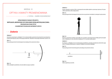 MODUŁ 12 OPTYKA I KWANTY PROMIENIOWANIA Zadanie 2 Pewien człowiek o wzroście 180 cm stanął przed zwierciadłem płaskim ustawionym pionowo. W zwierciadle ujrzał obraz całej swojej postaci. Zad. 2.1. Narysuj bieg promieni ilustrujących docieranie do oczu promieni świetlnych ze skrajnych części postaci. FIZYKA – ZAKRES ROZSZERZONY OPRACOWANE W RAMACH PROJEKTU: WIRTUALNE LABORATORIA FIZYCZNE NOWOCZESNĄ METODĄ NAUCZANIA. PROGRAM NAUCZANIA FIZYKI Z ELEMENTAMI TECHNOLOGII INFORMATYCZNYCH Zadania Zadanie 1 Na ekranie ustawionym w odległości 15 cm od zwierciadła o promieniu krzywizny 20 cm powstaje dwukrotnie pomniejszony obraz świecącego przedmiotu. Wysokość świecącego przedmiotu wynosi 2 cm. Zad. 1.1. Narysuj bieg promieni konstrukcyjnych prowadzących do powstania obrazu. Zad. 2.2. Wyznacz minimalną wysokość zwierciadła oraz wysokość nad powierzchnią podłogi górnej krawędzi lustra. Zakładamy, że oczy człowieka znajdują się 10 cm poniżej czubka głowy. Zadanie 3 Na ekranie, w odległości 18 cm od świecącego przedmiotu, powstaje powiększony dwukrotnie jego obraz. Pomiędzy przedmiotem a obrazem znajduje się soczewka skupiająca. Zad. 3.1. Narysuj bieg promieni konstrukcyjnych prowadzący do powstania obrazu Zad. 3.2. Zad. 1.2. Oblicz odległość przedmiotu od zwierciadła oraz jego wysokość. Oblicz ogniskową soczewki. Zadanie 4 Oblicz odległość między szczelinami siatki dyfrakcyjnej posiadającej 500 linii na jednym milimetrze. Zadanie 5 Na siatkę dyfrakcyjną mającą 400 linii na jednym milimetrze pada prostopadle wiązka światła monochromatycznego. Jasny prążek 1-go rzędu zaobserwowano pod kątem 100. Oblicz długość fali światła padającego na tę siatkę. Rozwiązania zadań Zadanie 1 Zad. 1.1. Zadanie 6 Oblicz wartość pędu fotonu promieniowania o długości fali 400nm. Zadanie 7 Szkolny laser helowo-neonowy daje światła o długości fali 633nm. Moc emitowanej wiązki laserowej wynosi 1,5mW. Oblicz, ile w czasie 1s przechodzi przez przekrój poprzeczny wiązki. Zadanie 8 Oblicz długość fali materii związanej z elektronem przyspieszonym napięciem 1000V. Zadanie 9 Oblicz energię kwantu promieniowania o długości fali 500nm, czyli fali na którą przypada maksimum emisji promieniowania Słońca. Zadanie 10 Wyznacz temperaturę powierzchni Słońca, jeżeli maksimum emisji promieniowania Słońca przypada na falę o długości 500nm. Zad. 1.2. Równanie zwierciadła: 1 1 1 = + . f x y Znamy odległość obrazu od zwierciadła, bo obraz powstaje na ekranie. Szukamy odległości przedmiotu od zwierciadła, czyli odległości x. Przekształcając równanie zwierciadła otrzymujemy: Zadanie 11 x= f ⋅y y− f Światło monochromatyczne o długości fali 500nm pada prostopadle na układ dwóch wąskich szczelin. Odległość między tymi szczelinami wynosi 0,3mm. Odległość między sąsiednimi prążkami interferencyjnymi obrazu obserwowanego na ekranie wynosi 1mm. Oblicz w jakiej odległości znajduje się ekran od układu szczelin. Podstawiając do tego wzoru wartości liczbowe otrzymujemy: Zadanie 12 Powiększenie obrazu rzeczywistego: Na powierzchnię metalu pada promieniowanie o długości fali 250 nm. Praca wyjścia z tego metalu wynosi 1,88 eV. Oblicz, jakie napięcie hamujące należy przyłożyć do metalu, aby elektrony wybite z płytki wracały na nią. Zadanie 13 Elektrony w lampie rentgenowskiej są przyspieszane napięciem 40 kV. Oblicz minimalną długość fali emitowanego przez lampę promieniowania. Zadanie 14 Energia stanu podstawowego atomu wodoru wynosi – 13,6 eV. Na atom wodoru pada promieniowanie o długości fali 100 nm. Oblicz energię atomów po absorpcji tego promieniowania. p= y ho = x hp Wysokość obrazu: Odpowiedź: Przedmiot ustawiono w odległości 30 cm od zwierciadła, obraz tego przedmiotu miał wysokość 2 cm. Zadanie 2 Zadanie 4 Zad. 2.1. Rozwiązanie Odległość między szczelinami siatki, czyli stałą siatki dyfrakcyjnej obliczymy dzieląc 1mm przez ilość linii przypadających na tę odległość: Odpowiedź: Stała siatki posiadającej 500 linii na 1mm wynosi Zadanie 5 Rozwiązanie: Stała siatki mającej 400 linii na 1 mm wynosi: Długość fali światła obliczymy ze wzoru: n ⋅ λ = a ⋅ sin α n Dla prążka 1-go rzędu mamy: λ = a ⋅ sin α Podstawiając dane do wzoru otrzymujemy: Zad. 2.2. Z rysunku widać, że dolna krawędź lustra znajduje się na wysokości . Górna krawędź lustra znajduje się na wysokości 175 cm. Oznacza to, że wysokość lustra wynosi 90 cm, czyli stanowi połowę wzrostu człowieka. Odpowiedź: Lustro powinno być zawieszone w taki sposób, aby jego górna krawędź znajdowała się na wysokości 175 cm nad podłogą, a jego wysokość powinna wynosić 90 cm. Odpowiedź: Na siatkę dyfrakcyjną padało światło o długości 434nm (odpowiada to barwie fioletowoniebieskiej). Zadanie 6 h Zadanie 3 Pęd fotonu obliczymy ze wzoru: p f = Zad. 3.1. Podstawiając dane do wzoru otrzymujemy: λ. Odpowiedź: Pęd fotonu ma wartość . Zadanie 7 Obliczmy energię pojedynczego fotonu: Zad. 3.2. Odległość przedmiotu od jego obrazu jest równa sumie odległości przedmiotu od soczewki oraz odległości obrazu od soczewki: . Obraz jest dwukrotnie powiększony, więc: y = 2 x . Z tych równań można obliczyć odległości x oraz y: Ogniskową soczewki obliczymy korzystając z równania soczewki: 1 1 1 = + f x y Wstawiając dane otrzymamy: f = 4 cm. Odpowiedź: Ogniskowa soczewki wynosi 4 cm. . Obliczmy energię przenoszoną przez wiązkę w czasie 1s: Traktując światło laserowe jako strumień fotonów energia przenoszona przez wiązkę światła: E = N ⋅ E f , gdzie N – szukana przez nas ilość fotonów. Szukana ilość fotonów w wiązce światła: Odpowiedź: W każdej sekundzie przez przekrój poprzeczny wiązki przechodzi 4,8 · 1015 fotonów. Zadanie 8 Zadanie 11 Energia kinetyczna elektronu przyspieszonego napięciem U=1000V wynosi: J