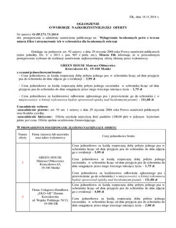 Ełk, dnia 18.11.2014 r. OGŁOSZENIE O WYBORZE NAJKORZYSTNIEJSZEJ OFERTY Nr sprawy: O-ZP.271.73.2014 dot. postępowanie o udzielenie zamówienia publicznego na: Wyłapywanie bezdomnych psów z terenu miasta Ełku i utrzymywanie ich w schronisku dla bezdomnych zwierząt Działając na podstawie art. 92 ustawy z dnia 29 stycznia 2004 roku Prawo zamówień publicznych (tekst jednolity, Dz. U z 2013 r. poz. 907 z późn. zm.), Miasto Ełk informuje, że w prowadzonym postępowaniu wybrano do realizacji zamówienia najkorzystniejszą ofertę złożoną przez wykonawcę: GREEN HOUSE Mateusz Oblacewicz Krzeczkowo 63, 19-100 Mońki z cenami jednostkowymi brutto: - Cena jednostkowa za każdą rozpoczętą dobę pobytu jednego psa w schronisku licząc od dnia przyjęcia psa do schroniska do dnia zdjęcia go z ewidencji – 3,99 zł - Cena jednostkowa za każdą rozpoczętą dobę pobytu jednego szczeniaka w schronisku licząc od dnia przyjęcia psa do schroniska do dnia osiągnięcia przez niego trzeciego miesiąca życia – 1,75 zł - Cena jednostkowa za każdorazowe odłowienie zgłoszonego psa i przewiezienie go do schroniska ( w miejscowości, w której wykonawca będzie sprawował opiekę nad bezdomnymi psami) - 111,00 zł Uzasadnienie wyboru: -uzasadnienie prawne: art. 91 ust. 1 ustawy z dnia 29 stycznia 2004 roku Prawo zamówień publicznych oraz Kodeks cywilny -uzasadnienie faktyczne: Oferta uzyskała najwyższą ilość punktów (100,00 pkt) w jedynym kryterium jakim jest cena. Oferta spełnia oczekiwania Zamawiającego. W PROWADZONYM POSTĘPOWANIU ZŁOŻONO NASTĘPUJĄCE OFERTY: Numer oferty Firma (nazwa) lub nazwisko oraz adres wykonawcy Ceny jednostkowe brutto Cena jednostkowa za każdą rozpoczętą dobę pobytu jednego psa w schronisku licząc od dnia przyjęcia psa do schroniska do dnia zdjęcia go z ewidencji – 3,99 zł 1 GREEN HOUSE Mateusz Oblacewicz Krzeczkowo 63, 19-100 Mońki Cena jednostkowa za każdą rozpoczętą dobę pobytu jednego szczeniaka w schronisku licząc od dnia przyjęcia psa do schroniska do dnia osiągnięcia przez niego trzeciego miesiąca życia – 1,75 zł Cena jednostkowa za każdorazowe odłowienie zgłoszonego psa i przewiezienie go do schroniska ( w miejscowości, w której wykonawca będzie sprawował opiekę nad bezdomnymi psami) - 111,00 zł 2 Firma Usługowo-Handlowa „EKO-AR” Danuta Kowalewska ul. Wojska Polskiego 76/13, 19-300 Ełk Cena jednostkowa za każdą rozpoczętą dobę pobytu jednego psa w schronisku licząc od dnia przyjęcia psa do schroniska do dnia zdjęcia go z ewidencji – 4,00 zł Cena jednostkowa za każdą rozpoczętą dobę pobytu jednego szczeniaka w schronisku licząc od dnia przyjęcia psa do schroniska do dnia osiągnięcia przez niego trzeciego miesiąca życia – 2,00 zł Cena jednostkowa za każdorazowe odłowienie zgłoszonego psa i przewiezienie go do schroniska ( w miejscowości, w której wykonawca będzie sprawował opiekę nad bezdomnymi psami) - 30,00 zł W PROWADZONYM POSTĘPOWANIU DOKONANO WYKLUCZENIA WYKONAWCY. Firma Usługowo-Handlowa „EKO-AR” Danuta Kowalewska, ul. Wojska Polskiego 76/13, 19-300 Ełk Uzasadnienie prawne: art. 24 ust. 2 pkt 3 ustawy Prawo zamówień publicznych Uzasadnienie faktyczne: Zamawiający w Specyfikacji Istotnych Warunków Zamówienia podał szacowaną ilość psów (w wysokości 230) koniecznych do przetransportowania (w przypadku zmiany dotychczasowego wykonawcy) i utrzymywania ich w schronisku przez okres realizacji umowy. Każdy z wykonawców, na potwierdzenie spełniania warunków udziału w postępowaniu określnych w art. 22 ust. 1 ustawy Prawo zamówień publicznych, zobowiązany był do złożenia stosownego oświadczenia o ich spełnianiu, z którego miało wynikać m.in. dysponowanie potencjałem technicznym umożliwiającym realizację zamówienia. Wykonawca Firma Usługowo-Handlowa „EKO-AR” Danuta Kowalewska załączył do oferty przedmiotowe oświadczenie; natomiast w toku badania ofert zamawiający otrzymał od Powiatowego Lekarza Weterynarii w Ełku pisemną informację dotyczącą schroniska położonego w miejscowości Ruska Wieś, gmina Ełk, prowadzonego przez tego wykonawcę, z której wynika, że z dokonanej przez niego wizji lokalnej, teoretyczna, maksymalna obsada schroniska wynosi 300 psów. Przy takiej ilości miejsc i 164 psów przebywających w chwili obecnej (stan z dnia 05.11.2014 r.) w Ruskiej Wsi, przyjęcie 230 psów będących własnością Miasta Ełk jest niemożliwe. Powiatowy Lekarz Weterynarii w Ełku wskazuje 300 miejsc jako możliwe do zasiedlenia, a nie 400 miejsc jak deklaruje wykonawca oraz decyzja na prowadzenie schroniska dla bezdomnych zwierząt w miejscowości Ruska Wieś, wydanej przez Wójta Gminy Ełk, ponieważ z ogólnej ilości boksów przeznaczonych zakwaterowanie wyłączone są boksy na kwarantannę oraz szpitalne, ponadto część kojców przeznaczona jest na potrzeby magazynowe, a część nie posiada nie posiada zabezpieczeń w postaci siatki. Szacowana przez Powiatowego Inspektora Weterynarii ilość 300 psów możliwa jest do osiągnięcia jedynie przy założeniu, że do schroniska trafią psy niewielkich rozmiarów i możliwe będzie umieszczenie ich po kilka w jednym kojcu, dodatkowo wskazuje on, że obsadę poszczególnych boksów determinuje nie tylko wielkość psów, ale także ich stan fizjologiczny, zdrowotny, psychiczny, stopień agresywności i możliwości socjalizacji z innymi. Z powyższego wynika, że wykonawca Firma Usługowo-Handlowa „EKO-AR” Danuta Kowalewska nie jest wstanie przyjąć psów będących własnością Miasta Ełk, a tym samym wykonać przedmiotu zamówienia. Pomimo, że wykonawca nie spełnia warunku dotyczącego dysponowania odpowiednim potencjałem technicznym umożliwiającym realizację zamówienia, złożył oświadczenie o spełnianiu warunków udziału w postępowaniu, czyli wykonawca złożył w ofercie nieprawdziwe informacje mające wpływ na wynik prowadzonego 