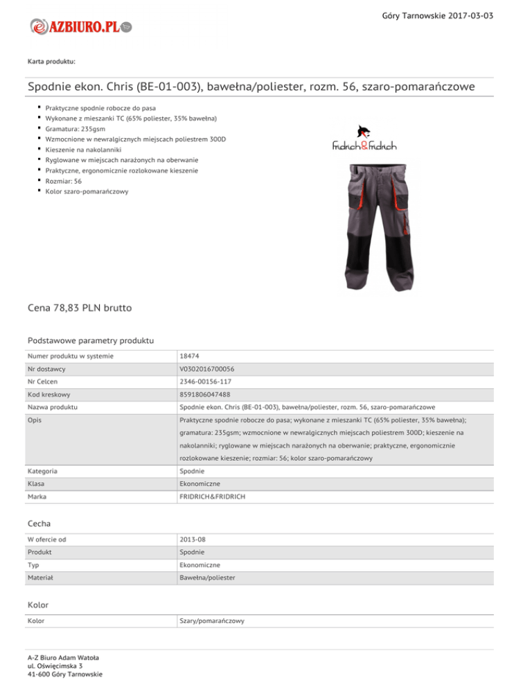 Góry Tarnowskie 2017-03-03 Karta produktu: Spodnie ekon. Chris (BE-01-003), bawełna/poliester, rozm. 56, szaro-pomarańczowe Praktyczne spodnie robocze do pasa Wykonane z mieszanki TC (65% poliester, 35% bawełna) Gramatura: 235gsm Wzmocnione w newralgicznych miejscach poliestrem 300D Kieszenie na nakolanniki Ryglowane w miejscach narażonych na oberwanie Praktyczne, ergonomicznie rozlokowane kieszenie Rozmiar: 56 Kolor szaro-pomarańczowy Cena 78,83 PLN brutto Podstawowe parametry produktu Numer produktu w systemie 18474 Nr dostawcy V0302016700056 Nr Celcen 2346-00156-117 Kod kreskowy 8591806047488 Nazwa produktu Spodnie ekon. Chris (BE-01-003), bawełna/poliester, rozm. 56, szaro-pomarańczowe Opis Praktyczne spodnie robocze do pasa; wykonane z mieszanki TC (65% poliester, 35% bawełna); gramatura: 235gsm; wzmocnione w newralgicznych miejscach poliestrem 300D; kieszenie na nakolanniki; ryglowane w miejscach narażonych na oberwanie; praktyczne, ergonomicznie rozlokowane kieszenie; rozmiar: 56; kolor szaro-pomarańczowy Kategoria Spodnie Klasa Ekonomiczne Marka FRIDRICH&FRIDRICH Cecha W ofercie od 2013-08 Produkt Spodnie Typ Ekonomiczne Materiał Bawełna/poliester Kolor Kolor A-Z Biuro Adam Watoła ul. Oświęcimska 3 41-600 Góry Tarnowskie Szary/pomarańczowy Góry Tarnowskie 2017-03-03 Karta katalogowa produktu cd. Spodnie ekon. Chris (BE-01-003), bawełna/poliester, rozm. 56, szaro-pomarańczowe Wymiary Rozmiar 56 Gramatura (g/m2) 235 Wspólny słownik zamówień CPV 35113400-3 Certyfikaty Nowy produkt w ofercie Standard Hit Standard Pozostałe zdjęcia produktu Serdecznie zapraszamy do współpracy A-Z Biuro Adam Watoła zespół. A-Z Biuro Adam Watoła ul. Oświęcimska 3 41-600 Góry Tarnowskie
