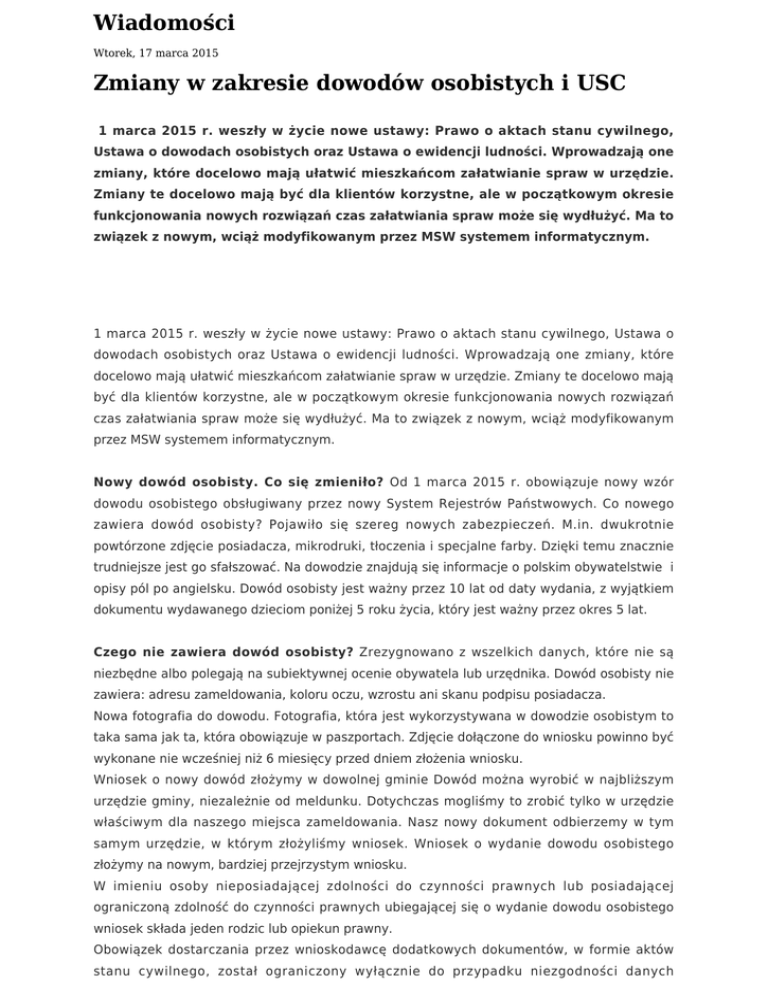 Wiadomości Wtorek, 17 marca 2015 Zmiany w zakresie dowodów osobistych i USC 1 marca 2015 r. weszły w życie nowe ustawy: Prawo o aktach stanu cywilnego, Ustawa o dowodach osobistych oraz Ustawa o ewidencji ludności. Wprowadzają one zmiany, które docelowo mają ułatwić mieszkańcom załatwianie spraw w urzędzie. Zmiany te docelowo mają być dla klientów korzystne, ale w początkowym okresie funkcjonowania nowych rozwiązań czas załatwiania spraw może się wydłużyć. Ma to związek z nowym, wciąż modyfikowanym przez MSW systemem informatycznym. 1 marca 2015 r. weszły w życie nowe ustawy: Prawo o aktach stanu cywilnego, Ustawa o dowodach osobistych oraz Ustawa o ewidencji ludności. Wprowadzają one zmiany, które docelowo mają ułatwić mieszkańcom załatwianie spraw w urzędzie. Zmiany te docelowo mają być dla klientów korzystne, ale w początkowym okresie funkcjonowania nowych rozwiązań czas załatwiania spraw może się wydłużyć. Ma to związek z nowym, wciąż modyfikowanym przez MSW systemem informatycznym. Nowy dowód osobisty. Co się zmieniło? Od 1 marca 2015 r. obowiązuje nowy wzór dowodu osobistego obsługiwany przez nowy System Rejestrów Państwowych. Co nowego zawiera dowód osobisty? Pojawiło się szereg nowych zabezpieczeń. M.in. dwukrotnie powtórzone zdjęcie posiadacza, mikrodruki, tłoczenia i specjalne farby. Dzięki temu znacznie trudniejsze jest go sfałszować. Na dowodzie znajdują się informacje o polskim obywatelstwie i opisy pól po angielsku. Dowód osobisty jest ważny przez 10 lat od daty wydania, z wyjątkiem dokumentu wydawanego dzieciom poniżej 5 roku życia, który jest ważny przez okres 5 lat. Czego nie zawiera dowód osobisty? Zrezygnowano z wszelkich danych, które nie są niezbędne albo polegają na subiektywnej ocenie obywatela lub urzędnika. Dowód osobisty nie zawiera: adresu zameldowania, koloru oczu, wzrostu ani skanu podpisu posiadacza. Nowa fotografia do dowodu. Fotografia, która jest wykorzystywana w dowodzie osobistym to taka sama jak ta, która obowiązuje w paszportach. Zdjęcie dołączone do wniosku powinno być wykonane nie wcześniej niż 6 miesięcy przed dniem złożenia wniosku. Wniosek o nowy dowód złożymy w dowolnej gminie Dowód można wyrobić w najbliższym urzędzie gminy, niezależnie od meldunku. Dotychczas mogliśmy to zrobić tylko w urzędzie właściwym dla naszego miejsca zameldowania. Nasz nowy dokument odbierzemy w tym samym urzędzie, w którym złożyliśmy wniosek. Wniosek o wydanie dowodu osobistego złożymy na nowym, bardziej przejrzystym wniosku. W imieniu osoby nieposiadającej zdolności do czynności prawnych lub posiadającej ograniczoną zdolność do czynności prawnych ubiegającej się o wydanie dowodu osobistego wniosek składa jeden rodzic lub opiekun prawny. Obowiązek dostarczania przez wnioskodawcę dodatkowych dokumentów, w formie aktów stanu cywilnego, został ograniczony wyłącznie do przypadku niezgodności danych wskazanych we wniosku, z informacjami istniejącymi w posiadanych przez organ rejestrach. W w sprawie odbioru dowodu osobistego. W przypadku, gdy wnioskodawca jest osobą niepełnosprawną, chorą, nie wychodzącą z domu wprowadzono możliwość działania przez pełnomocnika. Czy musisz wymienić stary dowód Nie! Dotychczasowe dowody osobiste zachowają ważność do upływu terminów w nich określonych. Nie ma konieczności wymiany dokumentów. Przypominamy, iż obowiązek meldunkowy został zachowany, a jego zniesienie ustawa przewiduje z dniem 1 stycznia 2016 roku. Odpisy aktów stanu cywilnego: W nowej ustawie określono, iż odpisy aktów stanu cywilnego pobrać można w każdym urzędzie stanu cywilnego, niezależnie od tego, gdzie nastąpiło urodzenie, zgon czy zawarcie małżeństwa. Jest to odmiejscowienie wydawania odpisów z aktów stanu cywilnego. UWAGA: Aby otrzymać odpis aktu stanu cywilnego znajdujący się w rejestrach wymagane jest, zgodnie z ustawą odczekanie kilku dni, potrzebnych na wprowadzenie do centralnego rejestru stanu cywilnego aktu, przez właściwy urząd stanu cywilnego. Ostatecznie o sprawności działania nowego systemu decyduje realne działanie. Zawarcie związku małżeńskiego poza urzędem stanu cywilnego: Ustawodawca rozszerzył możliwość zawarcia związku małżeńskiego poza urzędem stanu cywilnego. Dotyczy to nie tylko osób w stanie zagrożenia życia lub zdrowia albo pozbawionych wolności, ale także narzeczonych, którzy wskażą miejsce zawarcia małżeństwa zapewniające zachowanie uroczystej formy jego zawarcia oraz bezpieczeństwo osób obecnych na uroczystości. Opłata dodatkowa na rzecz gminy wynosi jednak 1000 zł. Wraz z wdrożeniem 1 marca 2015 roku Systemu Rejestrów Państwowych pod adresem obywatel.gov.pl uruchomiona została platforma usług dla obywateli. Podajemy Państwu adres strony internetowej: plid.obywatel.gov.pl. UWAGA: Czym jest nowa platforma OBYWATEL.GOV.PL? Każdą sprawę, którą obywatel załatwia w urzędzie, traktujemy jak usługę, którą dla niego wykonujemy. Chcemy, aby była ona załatwiona szybko i sprawnie. Dlatego zbieramy nasze usługi w jednym miejscu. Opisujemy w prosty i przystępny sposób, co należy zrobić, co przygotować, gdzie pójść, a co można załatwić bez wychodzenia z domu. Wszystko po to, aby nie tracić czasu. OBYWATEL.GOV.PL stanie się dobrym źródłem informacji o usługach Ministerstwa Spraw Wewnętrznych. Na początku znajdą się tam usługi, które dotyczą dowodów osobistych i ewidencji ludności. Wraz z rozwojem platformy umieścimy tu również informacje dotyczące ślubów, urodzeń, czy zameldowania oraz wiele innych. Wzór nowego dowodu osobistego