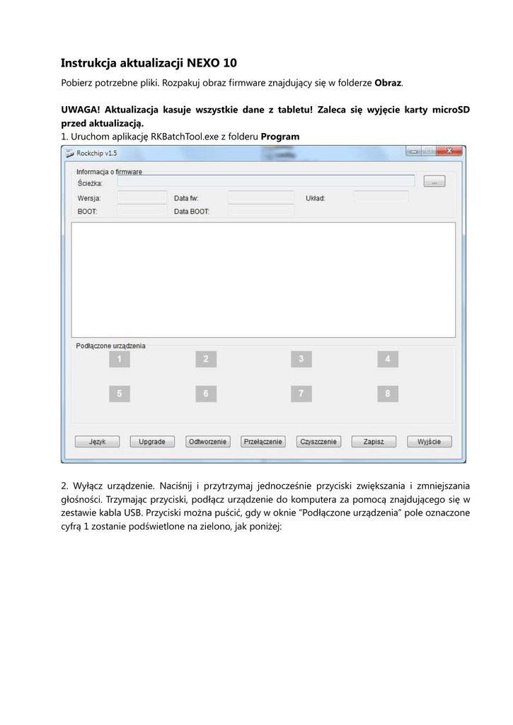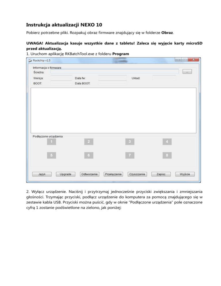 Instrukcja aktualizacji NEXO 10 Pobierz potrzebne pliki. Rozpakuj obraz firmware znajdujący się w folderze Obraz. UWAGA! Aktualizacja kasuje wszystkie dane z tabletu! Zaleca się wyjęcie karty microSD przed aktualizacją. 1. Uruchom aplikację RKBatchTool.exe z folderu Program 2. Wyłącz urządzenie. Naciśnij i przytrzymaj jednocześnie przyciski zwiększania i zmniejszania głośności. Trzymając przyciski, podłącz urządzenie do komputera za pomocą znajdującego się w zestawie kabla USB. Przyciski można puścić, gdy w oknie “Podłączone urządzenia” pole oznaczone cyfrą 1 zostanie podświetlone na zielono, jak poniżej: UWAGA! Przy pierwszym użyciu programu do aktualizacji, może być wymagane zainstalowanie sterownika. Sterowniki znajdują się w folderze „Sterowniki”. Bez zainstalowanych sterowników, NEXO 10 widoczne jest jako „Nieznane urządzenie”. Podczas instalacji sterowników, wskaż ręcznie sterowniki dla właściwej platformy. Podczas instalacji, zignoruj komunikat: wybierając „Zainstaluj oprogramowanie sterownika mimo to”. 3. Naciśnij przycisk ” i wybierz plik właściwy plik upgrade (*.img) z folderu Obraz. Naciśnij przycisk “Upgrade”. Zakończenie aktualizacji sygnalizowane jest okienkiem z komunikatem: „Upgrade zakończony<1> Niepowodzenie<0>” UWAGA ! animacja startowa uruchamiająca się po wykonaniu upgrade trwa wyraźnie dłużej, poczekaj na jej zakończenie i uruchomienie systemu.