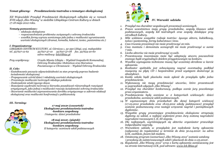 Temat główny: Przedstawienia teatralne o tematyce ekologicznej XII Wojewódzki Przegląd Przedstawień Ekologicznych odbędzie się w ramach XVII edycji „Eko-Wiosny” w siedzibie Libiąskiego Centrum Kultury w dniach 17-18 maja 2012 roku. Tematy pomocnicze:: - edukacja ekologiczna - rozpowszechnianie problemów związanych z ochroną środowiska - wszelkie formy wyrazu scenicznego jako jedna z możliwości ugruntowania wartości ekologicznych (dramat, komedia, kabaret, taniec, pantomima etc.) I. Organizatorzy: LIBIĄSKIE CENTRUM KULTURY, ul. Górnicza 1, 32-590 Libiąż, woj. małopolskie tel. 32/627-12-62 32/627-37-10 32/627-37-08 fax. 32/624-20-60 adres mailowy: [email protected] Przy współpracy: Urzędu Miasta Libiąża – Wydział Gospodarki Komunalnej, Ochrony Środowiska i Rolnictwa oraz Starostwa Powiatowego w Chrzanowie – Wydział Ochrony Środowiska II. Cele: - Kształtowanie poczucia odpowiedzialności za stan przyrody poprzez budzenie świadomości ekologicznej - Propagowanie wśród dzieci i młodzieży wartości ekologicznych - Prezentacja możliwości twórczych młodego pokolenia - Doskonalenie sztuki żywego słowa - Rozwijanie wyobraźni twórczej w kierunku poszukiwań różnorodnych rozwiązań artystycznych, jako jednej z możliwości rozwoju świadomości ochrony środowiska - Stworzenie możliwości zaprezentowania dorobku artystycznego w zakresie edukacji ekologicznej oraz możliwości konfrontacji z publicznością III. Terminy: 17 maj 2012r.(czwartek) Ekologiczne przedstawienia teatralne -konkurs zespołowy I kategoria: dzieci przedszkolne 18 maj 2012r. (piątek) Ekologiczne przedstawienia teatralne -konkurs zespołowy II kategoria: uczniowie szkół podstawowych IV. Warunki udziału 1. Przegląd ma charakter zespołowych prezentacji scenicznych. 2. Prawo uczestnictwa mają grupy przedszkolne, zespoły klasowe szkół podstawowych, zespoły kół teatralnych oraz zespoły działające przy ośrodkach kultury. 3. Mile widziane wszystkie rodzaje teatrów: żywego aktora, kukiełkowy, tańca i pantomimy, formy kabaretowe i inne. 4. Czas trwania prezentacji nie może przekroczyć 20 min. 5. Czas montażu i demontażu scenografii nie może przekroczyć w sumie 7 min. 6. Liczba aktorów nie może przekroczyć 15 osób. 7. Prezentowana inscenizacja może być adaptacją utworu powszechnie znanego bądź oryginalnym dziełem przygotowanym na konkurs. 8. Wszelkie wymagania techniczne muszą być wcześniej określone w karcie zgłoszenia. 9. Realizator spektaklu jest zobowiązany nagrać ewentualny podkład muzyczny na płytę CD i bezpośrednio przed występem dostarczyć ją akustykowi. 10. Każda szkoła bądź placówka może zgłosić do przeglądu tylko jedno przedstawienie. 11. Wykonawcy nie mogą przedstawiać utworów, które prezentowali w poprzednich edycjach „Eko-Wiosny”. 12. Przegląd ma charakter konkursowy, podlega ocenie jury powołanego przez organizatora. 13. Przedstawienia będą oceniane w 2 kategoriach wiekowych: dzieci przedszkolne, uczniowie szkół podstawowych. 14. W wyznaczonym dniu przesłuchań dla danej kategorii wiekowej (17.05.2012 przedszkola oraz 18.05.2012 szkoły podstawowe) przegląd zostanie podsumowany oraz nastąpi wręczenie nagród i pamiątkowych dyplomów. 15. Wszystkie grupy prezentujące przedstawienia ekologiczne otrzymają dyplomy za udział, a najlepsi wyłonieni przez Jury zostaną nagrodzeni nagrodami rzeczowymi I, II, III stopnia. 16. Dla najlepszych, wyróżniających się aktorów organizator przewiduje indywidualne nagrody. 17. Warunkiem udziału w przeglądzie jest nadesłanie karty zgłoszenia (załączonej do regulaminu) w terminie do dnia 30.04.2012r. na adres LCK, osobiście, faxem lub mailem. 18. Ostateczny program (scenariusz) „Eko-Wiosny 2012” zostanie ustalony i przesłany do zainteresowanych szkół i placówek do dnia 11.05.2012r. 19. Regulamin „Eko-Wiosny 2012” wraz z kartą zgłoszenia zamieszczony jest na stronie internetowej LCK, pod adresem: www.lck.libiaz.pl