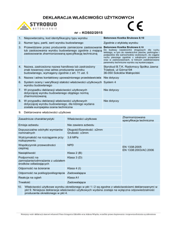 DEKLARACJA WŁAŚCIWOŚCI UŻYTKOWYCH nr – KOS02/2015 1. Niepowtarzalny, kod identyfikacyjny typu wyrobu Betonowa Kostka Brukowa 8;10 2. Numer typu, partii, serii wyrobu budowlanego Zgodnie z etykietą wyrobu 3. Przewidziane przez producenta zamierzone zastosowanie lub zastosowania wyrobu budowlanego zgodnie z mającą zastosowanie zharmonizowaną specyfikacją techniczną Betonowa Kostka Brukowa 8;10 4. Nazwa, zastrzeżona nazwa handlowa lub zastrzeżony znak towarowy oraz adres producenta wyrobu budowlanego, wymagany zgodnie z art. 11 ust. 5 Styrobud B.T.K. Radomscy Spółka Jawna Trzeboś, ul Górna194 36-050 Sokołów Małopolski Do budowy nawierzchni drogowych dla ruchu lekkiego, w tym do nawierzchni placów, parkingów i podjazdów dla samochodów osobowych, do ciągów ruchu pieszego zgodnie z odrębnymi przepisami oraz w zastosowaniach, w których zadeklarowane parametry techniczne wyrobu są wystarczające. 5. Nazwa i adres kontaktowy upoważnionego przedstawiciela Nie dotyczy 6. System oceny i weryfikacji stałości właściwości użytkowych System 4 wyrobu budowlanego 7. W przypadku deklaracji właściwości użytkowych dotyczącej wyrobu budowlanego objętego normą zharmonizowaną Nie dotyczy 8. W przypadku deklaracji właściwości użytkowych dotyczącej wyrobu budowlanego, dla którego wydana została europejska ocena techniczna Nie dotyczy 9. Deklarowane właściwości użytkowe Zasadnicze charakterystyki Właściwości użytkowe Emisja azbestu Nie zawiera azbestu Dopuszczalne odchyłki wymiarów nominalnych Długość/Szerokość: ±2mm Grubość: ±3mm Wytrzymałość na rozciąganie przy rozłupywaniu 3,6 MPa Współczynnik przewodności cieplnej NPD Nasiąkliwość Klasa 2 (B) Zharmonizowana specyfikacja techniczna EN 1338:2005 EN 1338:2003/AC:2006 Podporność na Klasa 3 (D) zamrażanie/odmrażanie z udziałem środków odladzających Odporność na ścieranie Klasa 4 (I) Odporność na poślizg/poślizgnięcie Zadowalająca Reakcja na ogień Klasa A1 Trwałość Zadowalająca 10. Właściwości użytkowe wyrobu określonego w pkt 1 i 2 są zgodne z właściwościami deklarowanymi w pkt 9. Niniejsza deklaracja właściwości użytkowych wydana zostaje na wyłączna odpowiedzialność producenta określonego w pkt 4. Niniejszy wzór deklaracji stanowi własność Pana Grzegorza Zdziebło oraz Adama Wiącka, wszelkie prawa kopiowania i rozpowszechniania są zabronione Deklaracja właściwości użytkowych nr KOS02/2015 dotyczy następujących wyrobów: Kostka 8 cm Holland, Kostka 8 cm Behaton, Kostka 8 cm Arco, Kostka 8 cm Nostalit, We wszystkich wariantach kolorystycznych i obróbki dodatkowej, w wersjach z fazą, mikrofazą i bez fazy (wg katalogu producenta). W imieniu producenta podpisał(-a): Grzegorz Zdziebło – Kierownik Laboratorium Trzeboś,11.05.2015 (pieczątka i podpis) Niniejszy wzór deklaracji stanowi własność Pana Grzegorza Zdziebło oraz Adama Wiącka, wszelkie prawa kopiowania i rozpowszechniania są zabronione