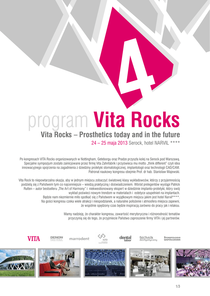 program Vita Rocks Vita Rocks – Prosthetics today and in the future 24 – 25 maja 2013 Serock, hotel NARVIL **** Po kongresach VITA Rocks organizowanych w Nottingham, Geteborgu oraz Pradze przyszła kolej na Serock pod Warszawą. Specjalne sympozjum zostało zainicjowane przez firmę Vita Zahnfabrik i przyświeca mu motto „think different” czyli idea innowacyjnego spojrzenia na zagadnienia z dziedziny protetyki stomatologicznej, implantologii oraz technologii CAD/CAM. Patronat naukowy kongresu obejmie Prof. dr hab. Stanisław Majewski. Vita Rock to niepowtarzalna okazja, aby w jednym miejscu zobaczyć światowej klasy wykładowców, którzy z przyjemnością podzielą się z Państwem tym co najcenniejsze – wiedzą praktyczną i doświadczeniem. Wśród prelegentów wystąpi Patrick Rutten – autor bestselleru „The Art of Harmony” i niekwestionowany ekspert w dziedzinie implanto-protetyki, który swój wykład poświeci nowym trendom w materiałach i estetyce uzupełnień na implantach. Będzie nam niezmiernie miło spotkać się z Państwem w wyjątkowym miejscu jakim jest hotel Narvil****. Na gości kongresu czeka wiele atrakcji i niespodzianek, a naturalne położenie i atmosfera miejsca zapewni, że wspólnie spędzony czas będzie inspiracją zarówno do pracy jak i relaksu. Mamy nadzieję, że charakter kongresu, zawartość merytoryczna i różnorodność tematów przyczynią się do tego, że przyjmiecie Państwo zaproszenie firmy VITA i jej partnerów. 1/3 program Vita Rocks 4th Vita Rocks – Prosthetics today and in the future 24 Maja, piątek Sala 2 wykład adresowany do techników dentystycznych 12:45 – 13:30 Rejestracja uczestników Sala Główna wykład adresowany do lekarzy stomatologów Miejsce wystawowe Sala Główna – dla wszystkich uczestników 13:30 – 13:45 OTWARCIE KONGRESU – Prof. zw. dr hab. n. med. Stanisław Majewski oraz Jürg Weber, Sales Manager Central/SE Europe/VITA 13:45 – 15:15 Doskonałość uzupełnień protetycznych – nowe trendy i materiały w implantologii estetycznej. ZTM Patrick Rutten, Belgia 15:15 – 16:45 Filozofia uzupełnień całkowitych. Czy estetyka jest limitowana? ZTM Alexia Merg, Niemcy dr Katarzyna Zakrzewska tech. dent. Urszula Młynarska międzynarodowy instruktor VITA/ VITA Master Lab 16:45 – 17:15 przerwa kawowa • Denon Dental • Marrodent • VITA • VITA Master Lab • Izba Gospodarcza Techników Dentystycznych • Dental Labor Polska • Nowoczesny Technik Dentystyczny • Stomatologia Współczesna Prezentacja Optoelektroniczny dobór koloru VITA Easyshade tech. dent. Adam Misztal/VITA Master Lab tech. dent. Mateusz Świtała/konsultant firmy VITA Sala Główna – dla wszystkich uczestników 17:15 – 18:45 Zasady i prawidłowe postępowanie z tlenkiem cyrkonu. dr Michael Tholey, Niemcy 18:45 – 19:15 Panel dyskusyjny – podsumowanie pierwszego dnia kongresu. Program niespodzianka. 19:45 Program wieczorny – kolacja z oprawą muzyczną 25 Maja, sobota Sala 2 09:15 – 10:45 10:45 – 12:15 Miejsce wystawowe Sala Główna – dla wszystkich uczestników OTWARCIE – Prof. zw. dr hab. n. med. Stanisław Majewski VITA ENAMIC – Rewolucja, czy po prostu kolejny nowy materiał? dr Gerhard Werling, Niemcy CERAMIKA VITA VM 13 oraz VM9 – ODBUDOWY NA IMPLANTACH. lic. tech. dent. Piotr Proskura VITA Master Lab 12:15 – 12:45 Sala Główna Protetyka inaczej. dr Piotr Pawłowski mgr Agnieszka Jasek przerwa kawowa • Denon Dental • Marrodent • VITA • VITA Master Lab • Izba Gospodarcza Techników Dentystycznych • Dental Labor Polska • Nowoczesny Technik Dentystyczny • Stomatologia Współczesna Pokaz na żywo ENAMIC, VM LC, zęby VITA – porady i zastosowanie tech. dent. Jerzy Osłow doradca i autoryzowany instruktor firmy VITA Sala Główna – dla wszystkich uczestników 12.45 – 13:30 Kartka z kalendarza – czyli protetyka dziś i jutro. Prof. zw. dr hab. n. med. Stanisław Majewski 14:00 Zakończenie kongresu VITA ROCKS 4 2/3 formularz zgłoszeniowy Vita Rocks 4th Vita Rocks – Prosthetics today and in the future Prosimy o wypełnienie i wysłanie formularza zgłoszeniowego na adres e-mail: [email protected] i równoczesne przesłanie kopii na e-mail: [email protected] Proszę po wypełnieniu formularza zapisać plik i wysłać na wskazane adresy e-mail. Imię i nazwisko Nazwa laboratorium/gabinetu NIP Nr PWZ (dotyczy lekarzy) Nr telefonu E-mail Adres /miejsce na pieczątkę liczba osób biorących udział w kongresie VITA Rocks 4 liczba osób towarzyszących w kolacji (maksymalnie jedna osoba na jednego uczestnika kongresu VITA Rocks 4) Data i podpis Wyrażam zgodę na przetwarzanie danych osobowych przez firmy VITA Zahnfabrik z siedzibą w Bad Sackingen, Spitalgasse 3; MARRODENT SP. Z O.O., 43-300 Bielsko-Biała, ul. Krasińskiego 31, w celach marketingowych, zgodnie z ustawą z dn. 29.08.1997 r. o ochronie danych osobowych. PUNKTY EDUKACYJNE Kurs został zgłoszony do Izby Lekarskiej. Lekarzom stomatologom zostanie przyznanych 11 punktów edukacyjnych. JĘZYK Wystąpienia zagranicznych wykładowców będą tłumaczone symultanicznie na język polski. KOSZT Koszt kongresu wraz z uroczystym wieczorem wynosi 490 zł Koszt kongresu, uroczysty wieczór wraz z osobą towarzyszącą wynosi 690 zł MIEJSCE Hotel Narvil Conference & Spa**** ul. Czesława Miłosza 14 A, 05-140 Serock. Dla uczestników VITA Rocks otrzymaliśmy specjalne warunki od Hotelu Narvil****. Dodatkowo pierwsi zgłaszający się uczestnicy kongresu skorzystają z rabatu. REJESTRACJA Warunkiem udziału w kongresie jest rejestracja telefoniczna lub e-mailowa. Ostatecznym potwierdzeniem jest wpłata należności na konto dealera, u którego nastąpiła rejestracja. W tytule płatności prosimy wpisać: dane do faktury, telefon kontaktowy, kongres VITA. MARRODENT SP. Z O.O. 43-300 Bielsko-Biała, ul. Krasińskiego 31 Nr konta: 48 1140 1049 0000 2278 7400 1024 INFORMACJE I ZAPISY MARRODENT SP. Z O.O. tel.: + 48 33 827 