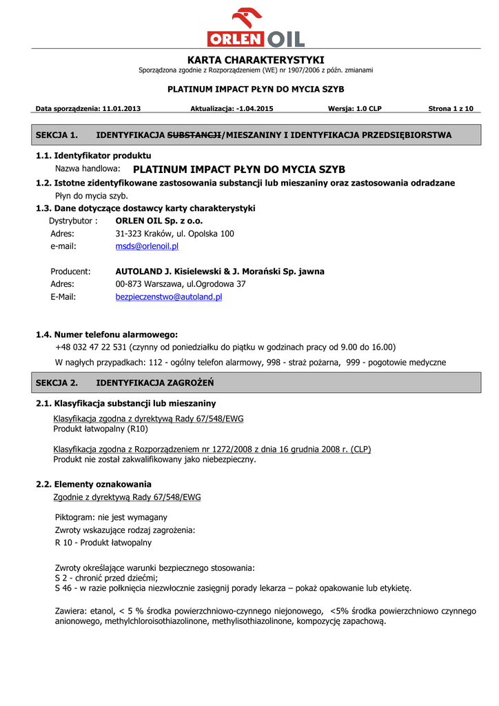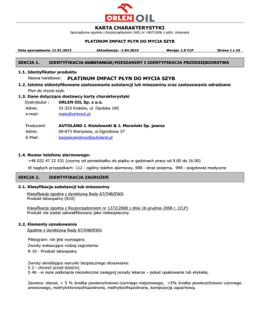KARTA CHARAKTERYSTYKI Sporządzona zgodnie z Rozporządzeniem (WE) nr 1907/2006 z późn. zmianami PLATINUM IMPACT PŁYN DO MYCIA SZYB Data sporządzenia: 11.01.2013 SEKCJA 1. Aktualizacja: -1.04.2015 Wersja: 1.0 CLP Strona 1 z 10 IDENTYFIKACJA SUBSTANCJI/MIESZANINY I IDENTYFIKACJA PRZEDSIĘBIORSTWA 1.1. Identyfikator produktu Nazwa handlowa: PLATINUM IMPACT PŁYN DO MYCIA SZYB 1.2. Istotne zidentyfikowane zastosowania substancji lub mieszaniny oraz zastosowania odradzane Płyn do mycia szyb. 1.3. Dane dotyczące dostawcy karty charakterystyki Dystrybutor : ORLEN OIL Sp. z o.o. Adres: 31-323 Kraków, ul. Opolska 100 e-mail: [email protected] Producent: AUTOLAND J. Kisielewski & J. Morański Sp. jawna Adres: 00-873 Warszawa, ul.Ogrodowa 37 E-Mail: [email protected] 1.4. Numer telefonu alarmowego: +48 032 47 22 531 (czynny od poniedziałku do piątku w godzinach pracy od 9.00 do 16.00) W nagłych przypadkach: 112 - ogólny telefon alarmowy, 998 - straż pożarna, 999 - pogotowie medyczne SEKCJA 2. IDENTYFIKACJA ZAGROŻEŃ 2.1. Klasyfikacja substancji lub mieszaniny Klasyfikacja zgodna z dyrektywą Rady 67/548/EWG Produkt łatwopalny (R10) Klasyfikacja zgodna z Rozporządzeniem nr 1272/2008 z dnia 16 grudnia 2008 r. (CLP) Produkt nie został zakwalifikowany jako niebezpieczny. 2.2. Elementy oznakowania Zgodnie z dyrektywą Rady 67/548/EWG Piktogram: nie jest wymagany Zwroty wskazujące rodzaj zagrożenia: R 10 - Produkt łatwopalny Zwroty określające warunki bezpiecznego stosowania: S 2 - chronić przed dziećmi; S 46 - w razie połknięcia niezwłocznie zasięgnij porady lekarza – pokaż opakowanie lub etykietę. Zawiera: etanol, < 5 % środka powierzchniowo-czynnego niejonowego, <5% środka powierzchniowo czynnego anionowego, methylchloroisothiazolinone, methylisothiazolinone, kompozycję zapachową. KARTA CHARAKTERYSTYKI Sporządzona zgodnie z Rozporządzeniem (WE) nr 1907/2006 z późn. zmianami PLATINUM IMPACT PŁYN DO MYCIA SZYB Data sporządzenia: 11.01.2013 Aktualizacja: -1.04.2015 Wersja: 1.0 CLP Strona 2 z 10 Zgodnie z Rozporządzeniem nr 1272/2008 z dnia 16 grudnia 2008 r. (CLP) Piktogram: nie jest wymagany Hasło ostrzegawcze: nie jest wymagane ZWROTY WSKAZUJĄCE RODZAJ ZAGROŻENIA: Nie są wymagane ZWROTY OKREŚLAJĄCE WARUNKI BEZPIECZNEGO STOSOWANIA: P102 Chronić przed dziećmi. P264 Dokładnie umyć ręce po użyciu. P305 + P351 + P338 W PRZYPADKU DOSTANIA SIĘ DO OCZU: Ostrożnie płukać wodą przez kilka minut. Wyjąć soczewki kontaktowe, jeżeli są i można je łatwo usunąć. Dodatkowe informacje: EUH208 Zawiera mieszaninę 5-chloro-2-metylo-2H-izotiazol-3-onu i 2-metylo-2H-izotiazol-3-onu (3:1). Może powodować wystąpienie reakcji alergicznej. Zawiera: sodium laureth sulfate, alkyl polyglycosides, poniżej 5% anionowych związków powierzchniowo czynnych, poniżej 5% niejonowych związków powierzchniowo czynnych, kompozycję zapachową, konserwant (methylchloroisothiazolinone, methylisothiazolinone). 2.3. Inne zagrożenia Nie ma wystarczających podstaw do sklasyfikowania jako PBT i vPvB SEKCJA 3. SKŁAD/INFORMACJA O SKŁADNIKACH 3.2. Mieszaniny Nazwa substancji /nr rejestracji Nr CAS / Nr WE % wag. Nr indeksowy Klasyfikacja wg 67/548/EWG etanol 64-17-5/ 200-578-6 <10 200-578-6 F; R 11 oksyetylowany siarczan alkilosodowy 68585-34-2/ - < 0,4 - Xi; R 38, R 41 poliglikozyd alkilowy 68515-73-1/ - < 0,3 - Xi; R 38, R 41 5-chloro-2-metylo-2Hizotiazol-3-on 55965-84-9/ 247-500-7 < 0,005 613-167-00-5 T; R 23/24/25 N; R 34, R 42, R 50/53 2-metylo-2H-izotiazol3-on 55965-84-9/ 220-239-6 Opis zwrotów R i H podano w Sekcji 16. Klasyfikacja wg 1272/2008 (CLP) Flam. Liq. 2, H 225 Skin Irrit. 2, H 315 Eye Dam. 1, H 318 Aquatic Chronic 3, H 412 Skin Irrit. 2, H 315 Eye Dam. 1, H 318 Aquatic Chronic 3, H 412 Acute Tox. 3, H 301, H 331 Skin Corr. 1 B, H 311, H 314 Skin Sens. 1, H 317 Aquatic Acute 1, H 400 Aquatic Chronic 1, H 410 KARTA CHARAKTERYSTYKI Sporządzona zgodnie z Rozporządzeniem (WE) nr 1907/2006 z późn. zmianami PLATINUM IMPACT PŁYN DO MYCIA SZYB Data sporządzenia: 11.01.2013 SEKCJA 4. Aktualizacja: -1.04.2015 Wersja: 1.0 CLP Strona 3 z 10 ŚRODKI PIERWSZEJ POMOCY 4.1. Opis środków pierwszej pomocy Wdychanie: Wynieść poszkodowanego z miejsca narażenia, ułożyć w wygodnej pozycji półleżącej lub siedzącej, zapewnić spokój, chronić przed utratą ciepła. Jeżeli wystąpią zaburzenia oddychania, podawać tlen do oddychania. Jeżeli objawy nie ustępują, wezwać lekarza. Kontakt ze skórą: Obficie zmywać letnią, bieżącą wodą. Zdjąć zanieczyszczoną odzież. Jeśli podrażnienie nie ustępuje, zasięgnąć porady lekarza. Kontakt z oczami: Natychmiast płukać dużą ilością letniej wody, najlepiej bieżącej, przez co najmniej 15 min. Usunąć szkła kontaktowe. Unikać silnego strumienia wody ze względu na ryzyko mechanicznego uszkodzenia rogówki. Jeżeli podrażnienie nie ustępuje, należy skonsultować się z lekarzem-okulistą. Połknięcie: Jeżeli nastąpi połknięcie dużej ilości, nie powodować wymiotów ponieważ istnieje ryzyko zachłyśnięcia się i przedostania się substancji do płuc. Podać do wypicia dużą ilość wody, jeżeli poszkodowany jest przytomny. Wezwać lekarza. 4.2. Najważniejsze ostre i opóźnione objawy oraz skutki narażenia Brak danych 4.3. Wskazania dotyczące wszelkiej natychmiastowej pomocy lekarskiej i szczególnego postępowania z poszkodowanym Wskazówki dla lekarza: leczenie objawowe. SEKCJA 5. POSTĘPOWANIE W PRZYPADKU POŻARU 5.1. Środki gaśnicze Odpowiednie środki gaśnicze: Piana, dwutlenek węgla, proszki gaśnicze, woda – prądy rozproszone. Pojemniki nie objęte pożarem, narażone na działanie ognia, chłodzić rozproszonym strumieniem wody. Niewłaściwe środki gaśnicze: Nie stosować zwartych strumieni wody. 5.2. Szczególne zagrożenia związane z substancją lub mieszaniną Podczas spalania tworzą się: tlenki węgla (CO, CO2) 5.3. Informacje dla straży pożarnej Nakł