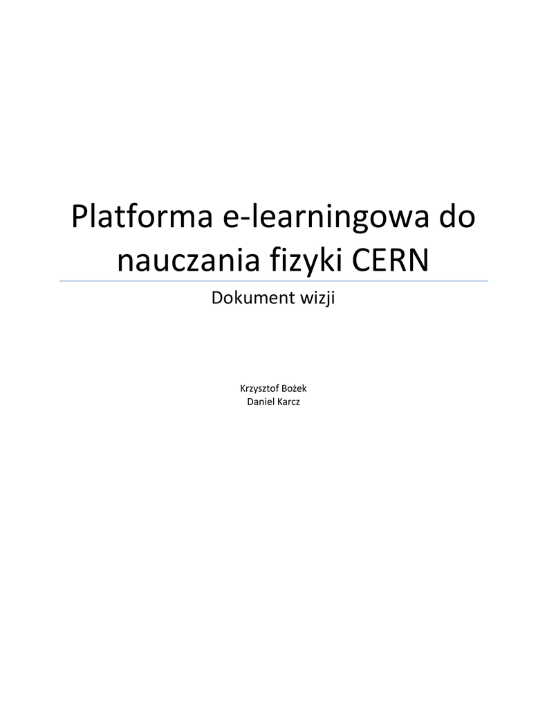 Platforma e-learningowa do nauczania fizyki CERN Dokument wizji Krzysztof Bożek Daniel Karcz Historia dokumentu Data Wersja Opis 19.11.2011 1.0 Gotowy dokument 21.11.2011 1.1 Konsultacje i poprawki Autor Krzysztof Bożek, Daniel Karcz Krzysztof Bożek, Daniel Karcz 1 Spis treści 1. Wstęp ....................................................................................................................................... 4 1.1 Cel dokumentu ...................................................................................................................... 4 1.2 Zakres .................................................................................................................................... 4 1.3 Definicje, akronimy i skróty ................................................................................................... 4 1.4 Referencje ............................................................................................................................. 4 2. Umiejscowienie problemu .......................................................................................................... 4 2.1 Korzyści biznesowe ............................................................................................................... 4 2.2 Zdefiniowanie problemu ....................................................................................................... 5 2.3 Umiejscowienie produktu ..................................................................................................... 6 3. Charakterystyka użytkowników................................................................................................... 6 3.1 Demografia rynku.................................................................................................................. 6 3.2 Użytkownicy .......................................................................................................................... 7 3.3 Środowisko użytkownika ....................................................................................................... 7 3.4 Profile użytkowników ............................................................................................................ 8 3.4.3 Wykładowca ....................................................................................................................... 8 3.4.4 Klient .................................................................................................................................. 9 3.5 Kluczowe wymagania ............................................................................................................ 9 3.6 Rozwiązania alternatywne ...................................................................................................11 4. Omówienie produktu .................................................................................................................11 4.1 Kontekst produktu................................................................................................................11 4.2 Podsumowanie możliwości ................................................................................................. 12 4.3 Założenia i zależności .......................................................................................................... 12 4.4 Licencje i instalacja .............................................................................................................. 12 5. Funkcjonalnośd produktu .......................................................................................................... 13 5.1 Funkcjonalnośd dla kursanta ............................................................................................... 13 5.2 Funkcjonalnośd dla wykładowcy ......................................................................................... 14 5.3 Funkcjonalnośd dla księgowego .......................................................................................... 14 5.4 Funkcjonalnośd dla administratora ..................................................................................... 14 6. Ograniczenia .............................................................................................................................. 14 7. Normy jakościowe ..................................................................................................................... 15 8. Pozostałe wymagania ................................................................................................................ 15 8.1 Komputery klienckie ........................................................................................................... 15 2 8.2 Serwer ................................................................................................................................. 15 9. Wymagana dokumentacja ........................................................................................................ 15 9.1 Podręcznik użytkownika ...................................................................................................... 15 9.2 Pomoc online ...................................................................................................................... 15 9.1 Podręcznik instalacyjny i konfiguracyjny ............................................................................. 15 3 1. Wstęp 1.1 Cel dokumentu Celem niniejszego dokumentu jest przedstawienie możliwości i wymagao platformy e-learningowej do nauczania fizyki CERN. Skupia się on na wymaganiach jakie stawiane są przez zleceniodawcę projektu firmę “Fizyka dla Was” i przyszłych użytkowników. 1.2 Zakres Niniejszy dokument dotyczy platformy e-learningowej do nauczania fizyki CERN. System zostanie zaprojektowany, wykonany i wdrożony przez firmę “Idea4Physics” z siedzibą w Krakowie. Platforma ma umożliwid poszerzenie oferty rynkowej i zwiększenie konkurencyjności firmy “Fizyka dla Was” zajmującej się prowadzeniem kursów fizy