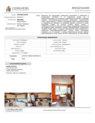 MIESZKANIE Numer oferty: Mi/2824 Cena: 150 000 zł PLN Powierzchnia: 47.00 m² O ofercie: Sprzedaż Rynek Wtórny Lokalizacja: Zabrze ( Zaborze ) woj. Śląskie www.czerkawskinieruchomosci.com.pl/oferta/12123 Opis: Polecamy do sprzeedaży atrakcyjne mieszkanie 2 pokojowe o powierzchni 47,40m2 w 4 piętrowym bloku na 4 piętrze.Mieszkanie po remoncie wymienione wszystkie instalacje (wodna, kanalizacyjna,gazowa)okna plastikowe, podwieszane sufity. Duża kuchnia z oknem, na podłodze kafle, pozostają meble w zabudowie.W pokojach na podłodze panele w jednym z pokoi pozostają meble na wymiar (szafa, łóżko, biurko z regałem),mieszkanie posiada dużą loggię, przedpokój przestronny na podłodze kafle. łazienka z wanną, wykafelkowana. Ogrzewanie miejskie ciepła woda z junkersa. Wymienione drzwi wewnętrzne i wyjściowe (antywłamaniowe).Niski czynsz 310zł. Mieszkanie znajduje się na osiedlu z pełną infrastrukturą bardzo dobrze skomunikowane, bliski zjazd na DTŚ. Zapraszamy na prezentację. Informacje dodatkowe Ilość pokoi 2-pokojowe Stan do użytku Standard wysoki Piętro 4 Cena za metr 3191.49 Ciepła woda junkers Przeznaczenie mieszkaniowe Ilość kondygnacji 5 Ilość łazienek 1 Typ kuchni widna Balkon loggia Typ budynku blok Ogrzewanie c.o. miejskie Przynależne Okna piwnica, miejsce parkingowe, PCV, Dane kontaktowe agenta: Szeliga Krystyna kom. 605-622-344 e-mail: [email protected] Nr licencji: 2185 Jerzy Czerkawski www.czerkawski-nieruchomosci.com.pl