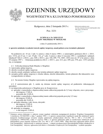 DZIENNIK URZĘDOWY WOJEWÓDZTWA KUJAWSKO-POMORSKIEGO Bydgoszcz, dnia 2 listopada 2015 r. Elektronicznie podpisany przez: Ewa Mes; Kujawsko-Pomorski Urząd Wojewódzki w Bydgoszcz Poz. 3231 Data: 2015-11-02 09:57:39 UCHWAŁA Nr XIII/122/15 RADY MIEJSKIEJ W MOGILNIE z dnia 21 października 2015 r. w sprawie ustalenia wysokości stawek opłaty targowej, zasad poboru oraz terminów płatności Na podstawie art. 18 ust. 2 pkt. 8, ustawy z dnia 8 marca 1990 r. o samorządzie gminnym (Dz.U. z 2015, poz. 1515), art.15 ust. 1 i art. 19 pkt. 1 lit „a” i pkt. 2 ustawy z dnia 12 stycznia 1991 r. o podatkach i opłatach lokalnych1) (Dz.U z 2014 r., poz. 849; z 2015 r., poz. 528, 699, 774, 1045, 1283) oraz art. 47 § 4a ustawy z dnia 29 sierpnia 1997 r. – Ordynacja podatkowa (Dz.U. z 2015 r., poz. 613, poz. 699, poz. 978, poz. 1197) uchwala się, co następuje: 1) 2) 3) 4) § 1. Uchwałą niniejszą Rada Miejska w Mogilnie: wprowadza opłatę targową; określa wysokość opłaty targowej; określa zasady ustalania i poboru oraz terminy płatności opłaty targowej; zarządza pobór opłaty targowej w drodze inkasa, określa inkasentów, termin płatności dla inkasentów oraz wynagrodzenie za inkaso. § 2. Na terenie Gminy Mogilno wprowadza się opłatę targową. § 3. Z zastrzeżeniem pkt. 2, ustala się dzienne stawki opłaty targowej od podmiotów dokonujących sprzedaży: 1) na targowisku położonym w Mogilnie przy ul. Kasprowicza: a) sprzedaż z samochodu o dopuszczalnej masie całkowitej pojazdu do 3,5 tony włącznie, oraz z przyczepy: - dni targowe 17,00 zł, - pozostałe dni 12,00 zł, b) sprzedaż z samochodu o dopuszczalnej masie całkowitej pojazdu powyżej 3,5 tony: - dni targowe 25,00 zł, - pozostałe dni 16,00 zł, c) sprzedaż obnośną z ręki, kosza, skrzynki: - dni targowe 12,00 zł, - pozostałe dni 6,00 zł, d) sprzedaż ze straganu: - w dni targowe 15,00 zł, 1) Niniejsza ustawa dokonuje w zakresie swojej regulacji wdrożenia następujących dyrektyw Wspólnot Europejskich: 1) dyrektywy 92/106/EWG z dnia 7 grudnia 1992 r. w sprawie ustanowienia wspólnych zasad dla niektórych typów transportu kombinowanego towarów między państwami członkowskimi (Dz.Urz. WE L 368 z 17.12.1992 r.); 2) dyrektywy 1999/62/WE z dnia 17 czerwca 1999 r. w sprawie pobierania opłat za użytkowania niektórych typów infrastruktury przez pojazdy ciężarowe (Dz. Urz. WE L 187 z 20.07.1999). Dane dotyczące ogłoszenia aktów prawa Unii Europejskiej , zamieszczone w niniejszej ustawie – z dniem uzyskania przez Rzeczpospolitą Polską członkostwa w Unii Europejskiej – dotyczą ogłoszenia tych aktów w Dzienniku Urzędowym Unii Europejskiej – wydanie specjalne. Dziennik Urzędowy Województwa Kujawsko-Pomorskiego 2) 3) 4) 5) 6) –2– Poz. 3231 - pozostałe dni 8,00 zł, e) sprzedaż w obrębie wyznaczonego stanowiska o powierzchni od 9 m2 do 18 m²: - w dni targowe 20,00 zł, - pozostałe dni 8,00 zł, f) sprzedaż w obrębie wyznaczonego stanowiska o powierzchni do 9 m²: - w dni targowe 13,00 zł, - pozostałe dni 8,00 zł, g) sprzedaż ze stoiska typu „szczęki”: - w dni targowe 17,00 zł, - pozostałe dni 8,00 zł, h) sprzedaż z pawilonów nietrwale związanych z gruntem: - w dni targowe 17,00 zł, - pozostałe dni 8,00 zł; realizowanej na terenie nie należącym do Gminy Mogilno lub nie znajdującym się w jej zarządzie, położonym w granicach administracyjnych miasta Mogilna, z zastrzeżeniem, o którym mowa w pkt 3-5 – 625,00 zł; wieńców, kwiatów, zniczy, świerku w okresie od 25 października do 2 listopada, przy ul. Kościuszki w Mogilnie (na terenie harcówki, przy stacji benzynowej, przy placu bazy PKS) – 35,00 zł; choinek, ozdób choinkowych, świerku w okresie od 15-24 grudnia przy ul. Hallera w Mogilnie (teren byłego targowiska, parking marketu Biedronka i Polo Market) – 35,00 zł; realizowanej w czasie organizowanych imprez okolicznościowych, na jarmarkach, kiermaszach – 35,00 zł; realizowanej na terenie nie należącym do Gminy Mogilno lub nie znajdującym się w jej zarządzie, położonym poza granicami administracyjnymi miasta Mogilna – 17,00 zł. § 4.1. Ustala się pobór opłaty targowej w systemie dziennym w drodze inkasa. 2. Inkasentem opłaty na terenie miasta jest Mogileńskie Przedsiębiorstwo Gospodarki Komunalnej Sp. z o.o. w Mogilnie. 3. Inkasentami opłaty na terenie wiejskim są sołtysi, z ograniczeniem prawa poboru do sołectwa, w którym wykonują mandat sołtysa. 4. Ustala się wynagrodzenie za inkaso w wysokości 20%, od wpłat dokonanych na zasadach określonych w § 3. § 5. Inkasenci pobierający opłatę targową, odprowadzają ją, za okresy miesięczne w terminie do 10-go każdego miesiąca za miesiąc poprzedni na rachunek Gminy. § 6. Wykonanie uchwały powierzyć Burmistrzowi Mogilna. § 7. Traci moc uchwała nr II/13/14 Rady Miejskiej w Mogilnie z dnia 5 grudnia 2014 r. w sprawie ustalenia wysokości stawek opłaty targowej, zasad poboru oraz terminów płatności. § 8. Uchwała wchodzi w życie z dniem 1 stycznia 2016 roku i podlega ogłoszeniu w Dzienniku Urzędowym Województwa Kujawsko-Pomorskiego. Przewodnicząca Rady Teresa Kujawa