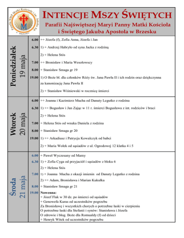 INTENCJE MSZY ŚWIĘTYCH Parafii Najświętszej Maryi Panny Matki Kościoła i Świętego Jakuba Apostoła w Brzesku Poniedziałek 19 maja 6.00 ++ Józefa (f), Zofia Anna, Józefa i Jan 6.30 1) + Andrzej Habryło od syna Jacka z rodziną 2) + Helena Stós 7.00 ++ Bronisław i Maria Wesołowscy 8.00 + Stanisław Smaga gr 19 19.00 1) O Boże bł. dla członków Róży św. Jana Pawła II i ich rodzin oraz dziękczynna za kanonizację Jana Pawła II 2) + Stanisław Wiśniewski w rocznicę śmierci 6.00 ++ Joanna i Kazimierz Mucha od Danuty Legutko z rodzina Wtorek 20 maja 6.30 1) ++ Bogusław i Jan Zając w 11 r. śmierci Bogusława z int. rodziców i braci 2) + Helena Stós 7.00 + Helena Stós od wnuka Daniela z rodzina 8.00 + Stanisław Smaga gr 20 19.00 1) ++ Arkadiusz i Patrycja Kowalczyk od babci 2) + Maria Wołek od sąsiadów z ul. Ogrodowej 12 klatka 4 i 5 6.00 + Paweł Wyczesany od Mamy 6.30 1) + Zofia Cyga od przyjaciół i sąsiadów z bloku 6 Środa 21 maja 2) + Helena Stós 7.00 1) + Joanna Mucha z okazji imienin od Danuty Legutko z rodzina 2) ++ Adam, Bronisława i Marian Kukułka 8.00 + Stanisław Smaga gr 21 19.00 Nowenna: + Józef Flak w 30 dz. po śmierci od sąsiadów + Genowefa Kuras od uczestników pogrzebu Za Bronisławę i wszystkich chorych o potrzebne łaski w cierpieniu O potrzebne łaski dla Stefanii i synów: Stanisława i Józefa O zdrowie i błog. Boże dla Romualdy (f) od dzieci + Henryk Witek od uczestników pogrzebu Czwartek 22 maja 6.00 + Jan Dziegiecki od córki Gabrieli 6.30 1) + Zofia Cyga od przyjaciół i sąsiadów z bloku 6 2) W int. członków Róży św. Jadwigi Śląskiej dz-bł 7.00 + Helena Kordecka z ok. imienin od córki i synów z rodzinami 8.00 + Stanisław Smaga gr 22 19.00 1) Podziękowanie za łaski z prośba o dalsze błog. dla członkiń Róży św. Rity 2) + Krystyna Pacura z int. męża 6.00 1) + Jan Dziegiecki od córki Agnieszki z rodziną 2) W int. Natalii z ok. 18 r. urodzin o zdrowie, błog. Boże i dary Ducha Św. Piątek 23 maja 6.30 1) + Paweł wyczesany od sąsiadów z Browarnej 19 kl. IV 2) + Helena Drożdż z okazji imienin i 2 r. śmierci 7.00 + Czesław Gnyla w 1 r. śmierci 8.00 1) + Stanisław Smaga gr 23 2) W int. strażaków i pracowników cywilnych Powiatowej Państwowej Straży Pożarnej w Brzesku, emerytów i rencistów pożarnictwa i rodzin strażaków 19.00 1) W int. Katarzyny i Grzegorza z ok. 1 r. ślubu dz-bł 2) W int. kapłanów pracujących w naszej parafii od Róży bł. Marii Teresy Ledóchowskiej 6.00 + Eugeniusz Zachara w 4 r. śmierci od żony i syna z rodziną Sobota 24 maja 6.30 1) + Kazimierz Sacha z ok. urodzin od żony i córki 2) + Ks. Czesław Konwent od Marii 7.00 ++ Julia i Antoni Stec w rocz. śmierci Antoniego 7.30 K. Ducha Św.: + Joanna Mucha z ok. imienin od siostry z rodziną 8.00 + Stanisław Smaga gr 24 11.00 Z ok. 100 r. urodzin Janiny Kaczmarowskiej dz-bł 19.00 W int. Ks. Piotra z okazji rocznicy święceń dz-bł 6.00 + Stanisław Smaga gr 25 7.30 ++ Zofia, Władysław, Jan i Zbigniew Buczek 25 maja Niedziela 9.00 1) + Franciszek Biel w 3 r. śmierci i z okazji imienin od żony 2) W 30 r. ślubu Janusza i Grażyny Filip dz-bł 10.00 K. Ducha Św.: ++ Franciszek Biel w 3 r. śm. i Józef Biel w 2 r. śm. od Zbigniewa 10.30 ++ Helena i Stanisław Cieślik i syn Stanisław z ok. imienin 12.00 Za parafian 16.00 + Jan Ostręga w 26 r. śmierci 19.00 + Janina Jemioło