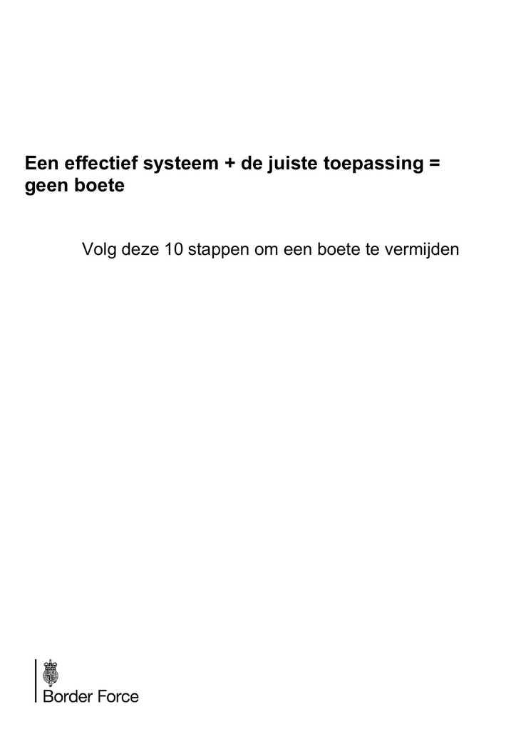 Een effectief systeem + de juiste toepassing = geen boete Volg deze 10 stappen om een boete te vermijden Voordat u aan de rit begint 1. Zorg dat u schriftelijke aanwijzingen over voertuigbeveiliging en een checklist krijgt van uw werkgever. 2. Houd toezicht tijdens het laden van het voertuig, om zeker te weten dat er geen onbevoegde personen het voertuig betreden. 3. Controleer het voertuig (chassis, zeil) en noteer eventuele schade op de checklist. Direct na het laden 4. Sluit het voertuig goed af. Bij voertuigen met massieve zijkant: Sluit de integrale kleppen af en breng een hangslot aan. Bij voertuigen met zachte zijkant: Sluit de integrale kleppen af en breng een hangslot aan. Breng een hoogwaardig zeiltouw aan en maak dit vast met een stevig hangslot of unieke verzegeling. Noteer het verzegelingsnummer op de checklist. 5. Controleer de bakken en sluit waar mogelijk af met sloten. Controleer het windschot en de assen. Tijdens de rit, na elke keer stoppen 6. Controleer het voertuig, het dak en de sloten op het voertuig: Trek aan de sloten e.d. om te controleren of ze nog vast zitten en er niet mee is geknoeid. Controleer de bakken, het windschot en de assen. Controleer op beschadigingen Is er met de sloten e.d. geknoeid? 7. Als u beschadigingen opmerkt, of er is met de sloten geknoeid of onbevoegd toegang verkregen, controleer de vracht en de laadruimte dan en sluit het voertuig opnieuw af. Voordat u de Controlezones van Groot-Brittannië binnenkomt of u inscheept op weg naar Groot-Brittannië 8. Herhaal stappen 6-7. 9. Als u het voertuig niet kon afsluiten, voer dan een gedegen controle uit van de vracht en de laadruimte. 10. Noteer op de checklist dat u deze controles heeft uitgevoerd: tijdens het laden, na elke keer stoppen en voordat u de Controlezone van Groot-Brittannië binnenkomt of u inscheept op weg naar Groot-Brittannië. Altijd: Voorzichtig zijn. Alert zijn. Extra sloten en checklists meenemen. Schriftelijke aanwijzingen en checklists in de cabine bij u houden. Aantekenen op de checklist wanneer u een controle heeft uitgevoerd. De plaatselijke overheid, de grensbewakingsdienst of de politie op de hoogte brengen als u vermoedt dat er iemand zonder uw toestemming in uw voertuig is gekomen. Informatie Meer informatie, zoals de Gedragscode voor het Voorkomen van Illegale Toegang en een voorbeeld van een checklist, kunnen van onze website worden gedownload: https://www.gov.uk/secure-your-vehicle-to-help-stop-illegal-immigration U kunt contact met ons opnemen via [email protected] or: Team bestuurlijke boetes voor illegale toegang van de grensbewakingsdienst Grensbewakingsdienst Zuiden/Zuidoosten en Europa Amadeus Building The Quadrant Mondial Way Harlington Middlesex UB3 5AR, GB Tel: 0044 (0)20 3014 8180 Fax: 0044 (0)20 3014 8006 De relevante wetgeving is het Besluit Immigratie en Asiel van 1999, Lid 32, 33 en 34, gewijzigd in het Besluit Nationaliteit, Immigratie en Asiel 2002.