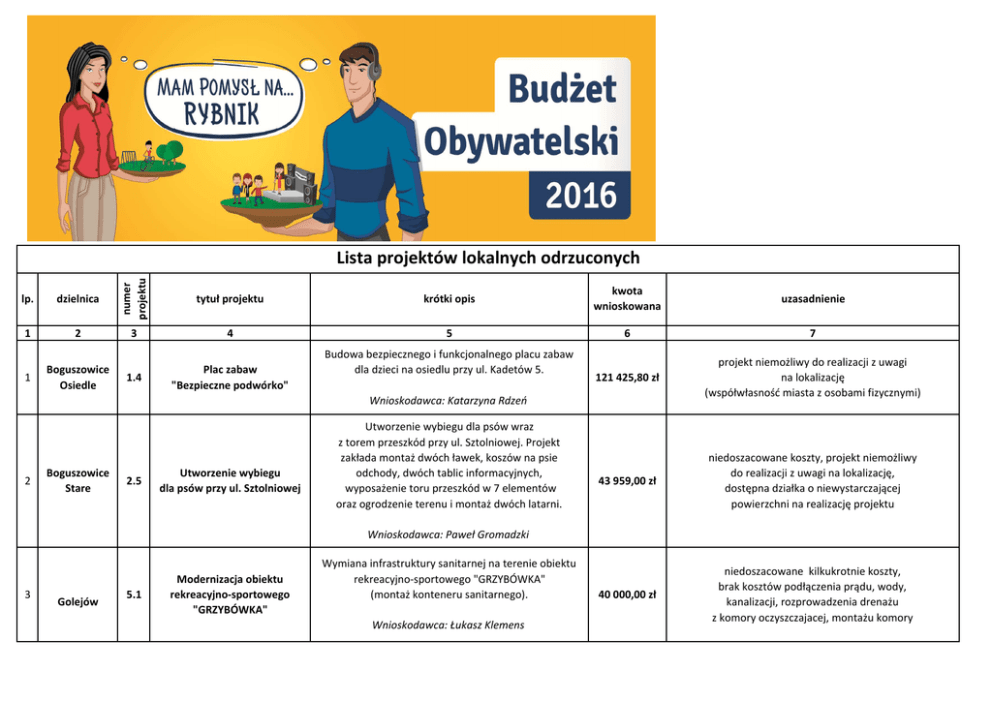 lp. dzielnica 1 2 1 Boguszowice Osiedle numer projektu Lista projektów lokalnych odrzuconych tytuł projektu krótki opis kwota wnioskowana uzasadnienie 3 4 5 6 7 1.4 Plac zabaw "Bezpieczne podwórko" 121 425,80 zł projekt niemożliwy do realizacji z uwagi na lokalizację (współwłasność miasta z osobami fizycznymi) 43 959,00 zł niedoszacowane koszty, projekt niemożliwy do realizacji z uwagi na lokalizację, dostępna działka o niewystarczającej powierzchni na realizację projektu 40 000,00 zł niedoszacowane kilkukrotnie koszty, brak kosztów podłączenia prądu, wody, kanalizacji, rozprowadzenia drenażu z komory oczyszczajacej, montażu komory Budowa bezpiecznego i funkcjonalnego placu zabaw dla dzieci na osiedlu przy ul. Kadetów 5. Wnioskodawca: Katarzyna Rdzeń 2 Boguszowice Stare 2.5 Utworzenie wybiegu dla psów przy ul. Sztolniowej Utworzenie wybiegu dla psów wraz z torem przeszkód przy ul. Sztolniowej. Projekt zakłada montaż dwóch ławek, koszów na psie odchody, dwóch tablic informacyjnych, wyposażenie toru przeszkód w 7 elementów oraz ogrodzenie terenu i montaż dwóch latarni. Wnioskodawca: Paweł Gromadzki 3 Golejów 5.1 Modernizacja obiektu rekreacyjno-sportowego "GRZYBÓWKA" Wymiana infrastruktury sanitarnej na terenie obiektu rekreacyjno-sportowego "GRZYBÓWKA" (montaż konteneru sanitarnego). Wnioskodawca: Łukasz Klemens 4 Gotartowice 6.5 Modernizacja budynku Doprowadzenie do pełnej funkcjonalności budynku stanowiącego jeden z elementów kompleksu sportowo-rekreacyjnego przy ul. Szybowcowej 1, poprzez wykonanie stropozadaszenia, izolacji oraz ocieplenia zewnętrznych ścian, wymianę okien, drzwi, doprowadzenie instalacji wodnokanalizacyjnej i elektrycznej oraz wykonanie wylewki betonowej podłoża. 70 000,00 zł niedoszacowane koszty remontu budynku, konstrukcja obiektu nie pozwala na realizację wnioskowanych robót budowlanych, budynek w dalszym ciągu powinien pełnić funkcję gospodarczo-magazynową 40 033,95 zł niedoszacowane koszty realizacji inwestycji, przedstawiony projekt nie rozwiązuje kompleksowo zalewania drogi i sąsiednich nieruchomości przy ul. Żorskiej przez wody opadowe i roztopowe spływające z dróg wydzielonych jako drogi umożliwiające dojazd do nieruchomości zabudowanych przez deweloperów. Należałoby zaprojektować drogę wraz z kanalizacją deszczową o długości około 650 metrów, uzyskać pozwolenie wodnoprawne na zrzut wód do cieku (potoku) oraz pozwolenie na budowę; nie uwzględniono całości zalewni, odtworzenia nawierzchni 39 040,50 zł szacunkowe koszty projektu są niewystarczające dla wykonania zaplanowanych robót. Wykonanie nawierzchni przeznaczonej do postoju pojazdów i jezdni manewrowej wymaga przygotowania odpowiedniego podłoża spełniającego wymagania Rozporządzenia Ministra Transportu i Gospodarki Morskiej z dnia 2 marca 1999 r. w sprawie warunków technicznych, jakim powinny odpowiadać drogi publiczne i ich usytuowanie. Zastosowanie kruszywa do podbudowy odpowiedniej jakości oraz grubości, zgodnie z ww. warunkami, powoduje wzrost ceny do wysokości 170 zł/ m2 Wnioskodawca: Walenty Stajer 5 Ligota-Ligocka 10.4 Kuźnia Budowa odwodnienia ul. Pogodnej - odbiór wód opadowych Budowa jednego kolektora odbierającego wodę deszczową i skierowanie sieci do istniejących kanałów opadowych. Wnioskodawca: Michał Zientek 6 Ochojec 16.3 Zagospodarowanie terenu przy ulicy Milenijnej Częściowe zagospodarowanie działki gminnej przy skrzyżowaniu ulic Milenijnej i Łukowej poprzez utwardzenie istniejącego ciągu pieszo-jezdnego z przeznaczeniem w kolejnych latach części działki na miejsca do parkowania samochodów. Wnioskodawca: Krzysztof Szafraniec 7 ParuszowiecPiaski Rozbudowa parkingu 17.2 samochodowego przy budynku na ul. Wolnej 20 Zaprojektowanie i rozbudowa parkingu samochodowego o powierzchni ok. 80 m² przy budynku na ul. Wolnej 20. 25 000,00 zł niedoszacowane koszty realizacji inwestycji, zgodnie z Rozporządzeniem Ministra Infrastruktury z dnia 12 kwietnia 2002 r. w sprawie warunków technicznych jakim powinny odpowiadać budynki i ich usytuowanie odległość wydzielonych miejsc postojowych dla samochodów osobowych od okien budynków mieszkalnych w przypadku od 5 do 60 stanowisk włącznie, nie może być mniejsza niż 10 m. W odniesieniu do budynków usytuowanych wzdłuż ulicy Wolnej warunek ten nie będzie spełniony 20 400,00 zł proponowane działanie jest poza Rybnikiem (niezgodność z Regulaminem budżetu obywatelskiego Miasta Rybnika) 65 000,00 zł niedoszacowane koszty inwestycji, realizacja zadania wymusza przebudowę dwóch słupów oświetlenia ulicznego oraz wycinkę drzew i krzewów. Wykonanie wnioskowanego chodnika o parametrach, zgodnych z warunkami technicznymi jakim powinny odpowiadać drogi publiczne i ich usytuowanie, prowadzi do sytuacji, że chodnik ten nie zostanie w całości usytuowany na działce gminnej nr 3780/13, a do jego realizacji konieczne byłoby zajęcie działek prywatnych 56 800,00 zł brak oceny stanu technicznego i istniejącej infrastruktury oraz konieczność uzyskania pozwolenia wodno-prawnego na napełnienie stawu Wnioskodawca: Tadeusz Żymełka 8 ParuszowiecPiaski 17.3 Wycieczka rodzinna do parku rozrywki i edukacji w Zatorze Zorganizowanie jednodniowej wycieczki mieszkańców dzielnicy (rodziny z dziećmi 4-16 lat, lub osoby samotnie wychowujące dzieci) do Zatoru. Wnioskodawca: Karina Mańka-Nowrot 9 21.1 Budowa chodnika przy ul. Widok od skrzyżowania z ul. Karłowicza do skrzyżowania z ul. PCK i dalej do skrzyżowania z ul. Różańskiego Budowa jednostronnego chodnika wzdłuż ul. Widok w kierunku ul. PCK, od skrzyżowania ulic Karłowicza i Widok do skrzyżowania ulic Widok i PCK, o długości ok. 150 m. Wnioskodawca: Andrzej Hajduk Rybnik-Północ 10 21.4 Rekultywacja Stawu - czyli miejsce do wypoczynku i spacerów dla mieszkańców dzielnicy Rybnik-Północ Przywrócenie osuszonego kilka lat temu stawu oraz zagospodaro