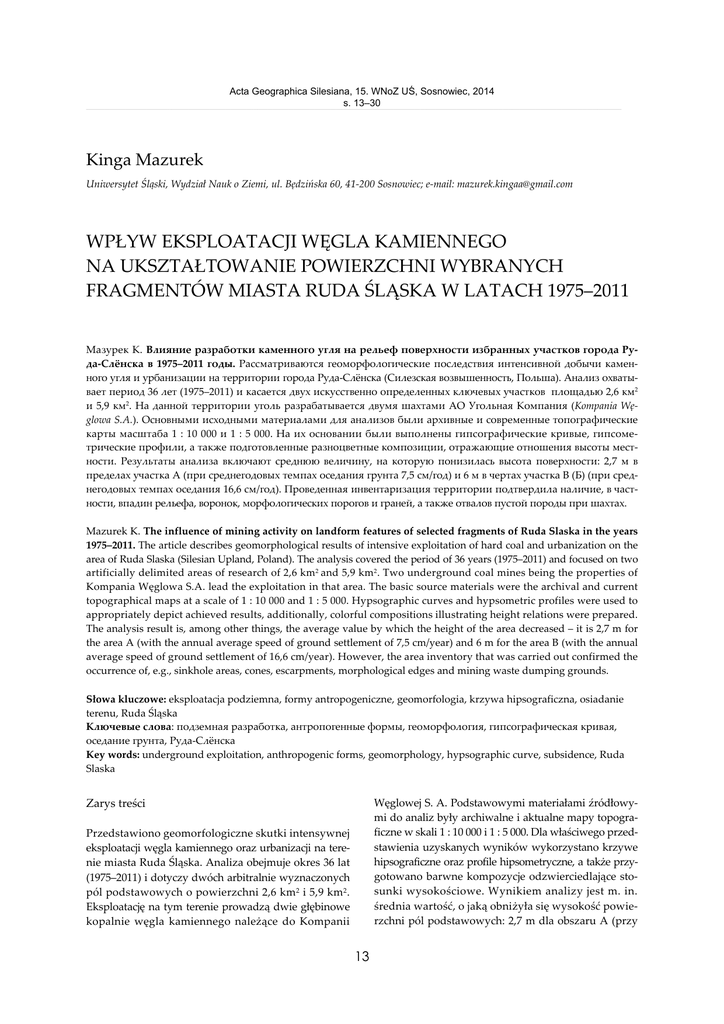 Acta Geographica Silesiana, 15. WNoZ UŚ, Sosnowiec, 2014 s. 13–30 _______________________________________________________________________________________________________________________________________________________________________________________________________________________________________________________________________________________________________________________________________________________________________________________________________________________________________________________________________________________________________________________________________________________________________________________________________________________________________________________________________________________________________________________________________________________________________________________________________________________________________________ Kinga Mazurek Uniwersytet Śląski, Wydział Nauk o Ziemi, ul. Będzińska 60, 41-200 Sosnowiec; e-mail: [email protected] WPŁYW EKSPLOATACJI WĘGLA KAMIENNEGO NA UKSZTAŁTOWANIE POWIERZCHNI WYBRANYCH FRAGMENTÓW MIASTA RUDA ŚLĄSKA W LATACH 1975–2011 Мазурек К. Влияние разработки каменного угля на рельеф поверхности избранных участков города Руда-Слёнска в 1975–2011 годы. Рассматриваются геоморфологические последствия интенсивной добычи каменного угля и урбанизации на территории города Руда-Слёнска (Силезская возвышенность, Польша). Анализ охватывает период 36 лет (1975–2011) и касается двух искусственно определенных ключевых участков площадью 2,6 км2 и 5,9 км2. На данной территории уголь разрабатывается двумя шахтами АО Угольная Компания (Kompania Węglowa S.A.). Основными исходными материалами для анализов были архивные и современные топографические карты масштаба 1 : 10 000 и 1 : 5 000. На их основании были выполнены гипсографические кривые, гипсометрические профили, а также подготовленные разноцветные композиции, отражающие отношения высоты местности. Результаты анализа включают среднюю величину, на которую понизилась высота поверхности: 2,7 м в пределах участка А (при среднегодовых темпах оседания грунта 7,5 см/год) и 6 м в чертах участка B (Б) (при среднегодовых темпах оседания 16,6 cм/год). Проведенная инвентаризация территории подтвердила наличие, в частности, впадин рельефа, воронок, морфологических порогов и граней, а также отвалов пустой породы при шахтах. Mazurek K. The influence of mining activity on landform features of selected fragments of Ruda Slaska in the years 1975–2011. The article describes geomorphological results of intensive exploitation of hard coal and urbanization on the area of Ruda Slaska (Silesian Upland, Poland). The analysis covered the period of 36 years (1975–2011) and focused on two artificially delimited areas of research of 2,6 km2 and 5,9 km2. Two underground coal mines being the properties of Kompania Węglowa S.A. lead the exploitation in that area. The basic source materials were the archival and current topographical maps at a scale of 1 : 10 000 and 1 : 5 000. Hypsographic curves and hypsometric profiles were used to appropriately depict achieved results, additionally, colorful compositions illustrating height relations were prepared. The analysis result is, among other things, the average value by which the height of the area decreased – it is 2,7 m for the area A (with the annual average speed of ground settlement of 7,5 cm/year) and 6 m for the area B (with the annual average speed of ground settlement of 16,6 cm/year). However, the area inventory that was carried out confirmed the occurrence of, e.g., sinkhole areas, cones, escarpments, morphological edges and mining waste dumping grounds. Słowa kluczowe: eksploatacja podziemna, formy antropogeniczne, geomorfologia, krzywa hipsograficzna, osiadanie terenu, Ruda Śląska Ключевые слова: подземная разработка, антропогенные формы, геоморфология, гипсографическая кривая, оседание грунта, Руда-Слёнска Key words: underground exploitation, anthropogenic forms, geomorphology, hypsographic curve, subsidence, Ruda Slaska Węglowej S. A. Podstawowymi materiałami źródłowymi do analiz były archiwalne i aktualne mapy topograficzne w skali 1 : 10 000 i 1 : 5 000. Dla właściwego przedstawienia uzyskanych wyników wykorzystano krzywe hipsograficzne oraz profile hipsometryczne, a także przygotowano barwne kompozycje odzwierciedlające stosunki wysokościowe. Wynikiem analizy jest m. in. średnia wartość, o jaką obniżyła się wysokość powierzchni pól podstawowych: 2,7 m dla obszaru A (przy Zarys treści Przedstawiono geomorfologiczne skutki intensywnej eksploatacji węgla kamiennego oraz urbanizacji na terenie miasta Ruda Śląska. Analiza obejmuje okres 36 lat (1975–2011) i dotyczy dwóch arbitralnie wyznaczonych pól podstawowych o powierzchni 2,6 km2 i 5,9 km2. Eksploatację na tym terenie prowadzą dwie głębinowe kopalnie węgla kamiennego nal