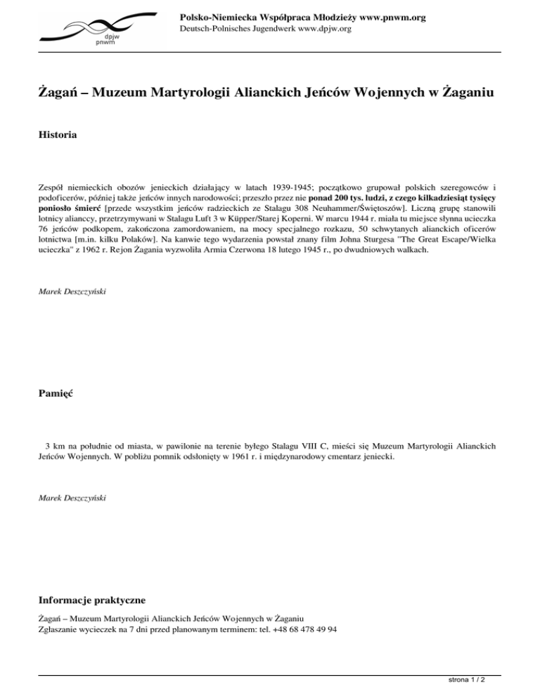 Polsko-Niemiecka Współpraca Młodzieży www.pnwm.org Deutsch-Polnisches Jugendwerk www.dpjw.org Żagań – Muzeum Martyrologii Alianckich Jeńców Wojennych w Żaganiu Historia Zespół niemieckich obozów jenieckich działający w latach 1939-1945; początkowo grupował polskich szeregowców i podoficerów, później także jeńców innych narodowości; przeszło przez nie ponad 200 tys. ludzi, z czego kilkadziesiąt tysięcy poniosło śmierć [przede wszystkim jeńców radzieckich ze Stalagu 308 Neuhammer/Świętoszów]. Liczną grupę stanowili lotnicy alianccy, przetrzymywani w Stalagu Luft 3 w Küpper/Starej Koperni. W marcu 1944 r. miała tu miejsce słynna ucieczka 76 jeńców podkopem, zakończona zamordowaniem, na mocy specjalnego rozkazu, 50 schwytanych alianckich oficerów lotnictwa [m.in. kilku Polaków]. Na kanwie tego wydarzenia powstał znany film Johna Sturgesa "The Great Escape/Wielka ucieczka" z 1962 r. Rejon Żagania wyzwoliła Armia Czerwona 18 lutego 1945 r., po dwudniowych walkach. Marek Deszczyński Pamięć 3 km na południe od miasta, w pawilonie na terenie byłego Stalagu VIII C, mieści się Muzeum Martyrologii Alianckich Jeńców Wojennych. W pobliżu pomnik odsłonięty w 1961 r. i międzynarodowy cmentarz jeniecki. Marek Deszczyński Informacje praktyczne Żagań – Muzeum Martyrologii Alianckich Jeńców Wojennych w Żaganiu Zgłaszanie wycieczek na 7 dni przed planowanym terminem: tel. +48 68 478 49 94 strona 1 / 2 Polsko-Niemiecka Współpraca Młodzieży www.pnwm.org Deutsch-Polnisches Jugendwerk www.dpjw.org Cmentarz i pomnik lotników przy ul. Słowiańskiej. Dojazd: Żagań, miasto powiatowe, leży na skrzyżowaniu dróg nr 298, 295 i 296. Dojazd koleją: rozkłady jazdy dostępne na www.pkp.pl. ul. Lotników Alianckich 6, 68-100 Żagań tel. +48 68 478 49 94 http://www.muzeum.eline2.serwery.pl e-mail:[email protected] Czynne: wtorek-piątek 10-16; sobota, niedziela 10-17 Wstęp: 5 PLN - dorośli; 3 PLN - dzieci We wtorki wstęp bezpłatny strona 2 / 2 Powered by TCPDF (www.tcpdf.org)