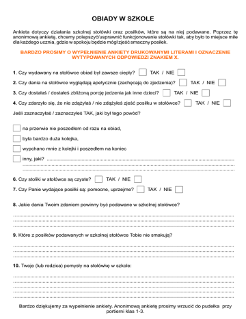 OBIADY W SZKOLE Ankieta dotyczy działania szkolnej stołówki oraz posiłków, które są na niej podawane. Poprzez tę anonimową ankietę, chcemy polepszyć/usprawnić funkcjonowanie stołówki tak, aby było to miejsce miłe dla każdego ucznia, gdzie w spokoju będzie mógł zjeść smaczny posiłek. BARDZO PROSIMY O WYPEŁNIENIE ANKIETY DRUKOWANYMI LITERAMI I OZNACZENIE WYTYPOWANYCH ODPOWIEDZI ZNAKIEM X. 1. Czy wydawany na stołówce obiad był zawsze ciepły? TAK / NIE 2. Czy dania na stołówce wyglądają apetycznie (zachęcają do zjedzenia)? 3. Czy dostałaś / dostałeś zbliżoną porcję jedzenia jak inne dzieci? TAK / NIE TAK / NIE 4. Czy zdarzyło się, że nie zdążyłaś / nie zdążyłeś zjeść posiłku w stołówce? TAK / NIE Jeśli zaznaczyłaś / zaznaczyłeś TAK, jaki był tego powód? na przerwie nie poszedłem od razu na obiad, była bardzo duża kolejka, wypchano mnie z kolejki i poszedłem na koniec inny, jaki? ........................................................................................................................................ .......................................................................................................................................................... .......................................................................................................................................................... 6. Czy stoliki w stołówce są czyste? TAK / NIE 7. Czy Panie wydające posiłki są: pomocne, uprzejme? TAK / NIE 8. Jakie dania Twoim zdaniem powinny być podawane w szkolnej stołówce? …............................................................................................................................................................. …............................................................................................................................................................. …............................................................................................................................................................. 9. Które z posiłków podawanych w szkolnej stołówce Tobie nie smakują? …............................................................................................................................................................. …............................................................................................................................................................. …............................................................................................................................................................. 10. Twoje (lub rodzica) pomysły na stołówkę w szkole: …............................................................................................................................................................. …............................................................................................................................................................. …............................................................................................................................................................. …............................................................................................................................................................. …............................................................................................................................................................. Bardzo dziękujemy za wypełnienie ankiety. Anonimową ankietę prosimy wrzucić do pudełka przy portierni klas 1-3.