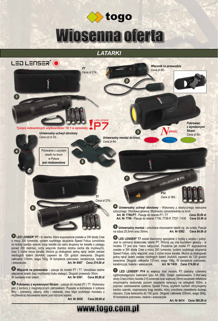 LATARKI Włącznik na przewodzie Cena zł 89,- P7 Cena zł 274,2 1 !P7 LED LENSER Tysiące zadowolonych użytkowników ! Nr 1 w sprzedaży Uniwersalny uchwyt obrotowy Cena od zł 24,- Polowanie z użyciem latarki na broni w Polsce jest niedozwolone 4 3 Uniwersalny montaż do broni Cena zł 84,- N owość Pokrowiec z wymiennymi fitrami Cena zł 99,- 5 7 T7 Cena zł 274,6 P14 Cena zł 360,4 Uniwersalny uchwyt obrotowy - Wykonany z elastycznego tworzywa sztucznego. Obrotowa głowica. Możliwość zamontowania na broń. Art. Nr 7799-PT - Pasuje do latarek P7 i T7 Cena 39,00 zł Art. Nr 7799 - Pasuje do latarek 7736, 7736-P, 7737 i 7438 Cena 24,00 zł 5 Uniwersalny montaż - umożliwia mocowanie latarki np. do lunety. Pasuje na tubus 25,5mm oraz 30mm. Art. Nr 0362 Cena 84,00 zł 1 LED LENSER® P7 - to latarka, która wyposażona została w 3W diodę Cree o mocy 200 lumenów, system szybkiego skupiania Speed Fokus (umożliwia on kolisty bardzo szeroki snop światła lub ostro skupiony tor światła o zasięgu ponad 200 metrów), cichy włącznik (bardzo istotna cecha dla myśliwych), oraz 3 różne moce światła. Można ją obsługiwać jedną ręką! Jeden zestaw niedrogich baterii (4xAAA) zapewni do 120 godzin świecenia. Długość całkowita 133mm, waga 192g. W komplecie pokrowiec, karabinczyk, baterie i wieszaczek. Art. Nr 8407 Cena 274,00 zł 2 Włącznik na przewodzie - pasuje do modeli P7 i T7. Umożliwia zdalne włączenie latarki (bez możliwości trybu stałego). Długość przewodu 30cm. W zestawie brak baterii. Art. Nr 0361 Cena 89,00 zł 3 Pokrowiec z wymiennymi filtrami - pasuje do modeli P7 i T7. Wykonany jest z kordury z magnetycznym zatrzaskiem. Posiada w komplecie 4 szklane filtry - czerwony, zielony, żółty i niebieski, oraz klips szybkiego montażu z możliwością mocowania latarki pod różnymi kątami. Art. Nr 0039 Cena 99,00 zł 6 LED LENSER® T7 został stworzony specjalnie z myślą o wojsku i policji. Jest to odmiana doskonałej latarki P7. Różnią się one kształtem głowicy - w modelu T7 jest ona “nieco taktyczna”. Podobnie jak model P7 wyposażona została w 3W diodę Cree o mocy 200 lumenów, system szybkiego skupiania Speed Fokus, cichy włącznik, oraz 3 różne moce światła. Można ją obsługiwać jedną ręką! Jeden zestaw niedrogich baterii (4xAAA) zapewni do 120 godzin świecenia. Długość całkowita 137mm, waga 198g. W komplecie pokrowiec, karabinczyk, baterie i wieszaczek. Art. Nr 7439 Cena 274,00 zł 7 LED LENSER® P14 to większy brat modelu P7 zasilany czterema ogólnodostępnymi bateriami typu AA (R6). Dzięki zastosowaniu 3-Wat’owej diody Cree o mocy światła 210 lumenów oraz większej 39mm soczewki reflektora otrzymujemy doskonały poziom skupienia świecący na odległość 300m, a poprzez zastosowanie systemu Speed Fokus, szybkim ruchem otrzymujemy bardzo szeroki, rozproszony krąg światła, który umożliwia oświetlenie dużego obszaru. Czas świecenia do 150 godz. Długość całkowita 205mm, waga 384g. W komplecie pokrowiec, baterie i wieszaczek. Art. Nr 8414 Cena 360,00 zł 1 LATARKI 9 K3 Cena zł 88,- 8 M1 Cena zł 269,- M5 Cena zł 236,- H7 Cena zł 231,- 10 11 12 X21 Cena zł 1250,13 K3 – Ważąca zaledwie 34 g i mierząca mniej niż 7 cm latarka jest prawdziwym krasnoludkiem, ale jej wydajność i moc świetlna jest olbrzymia. Latarkę wyposażono w system Blue Moon Focus. Wokół jednorodnego światła pojawia się błękitny krąg. Dzięki kółku breloczkowemu, świetnie nadaje się jako latarka do kluczy. Art. Nr 8313 Cena 88,00 zł 9 M1 - nowy model małej i lekkiej latarki z bardzo silnym światłem. Dzięki diodzie Cree i zasilaniu z jednej 3-Voltowej litowej baterii CR123 latarka posiada moc 155 lumenów i świeci na ponad 140m. Zastosowano w niej także nowy włącznik MicroController, który, pozwala na dopasowanie siły promienia świetlnego do aktualnych potrzeb - wysoka (high), średna (mid) oraz stroboskop. Latarka ta posiada także system szybkiego skupiania Speed Fokus. Czas świecenia do 8 godz. Długość całkowita 97mm, waga 78g. W komplecie pokrowiec, karabinczyk, baterie i wieszaczek. Art. Nr 8301 Cena 269,00 zł 10 M5 - to podobny model do latarki M1, lecz zasilany z 1 baterii typu AA (R6). Poprzez zastosowanie 1,5 Voltowej baterii latarka ta generuje moc 88 lumenów i świeci na odległość 116m. Ponadto jak w modelu M1 zastosowano w niej włącznik MicroController i Speed Fokus. Czas świecenia do 6,5 godz. Długość całkowita 104mm, waga 74g. W komplecie pokrowiec, karabinczyk, baterie i wieszaczek. Art. Nr 8305 Cena 236,00 zł 11 H7 - Latarka czołowa Led osiągająca jasność 140 lumenów jest prawdziwym arcydziełem techniki oświetleniowej. Zastosowano w niej system szybkiego skupiania Speed Fokus (umożliwia on kolisty bardzo szeroki snop światła lub ostro skupiony tor światła), oraz obrotowy potencjometr, który pozwala na płynną regulację mocy światła. Głowica latarki jest ruchoma w zakresie 90 stopni. Zasilanie 3 x AAA, czas świecenia do 75 godzin, waga 117g. Art. Nr 7497 Cena 231,00 zł Hokus Fokus - nowa wersja znanego modelu, który został wyposażony w nową 3W diodę Cree o mocy 105 lumenów. Latarka zasilana jest 3 bateriami 2 14 P17 Cena zł 476,- 8 12 Hokus Fokus Cena zł 231,- typu AAA i posiada system fokusowania poprzez obracanie głowicy. Model ten otrzymał nagrodę na renomowanych rozdaniach nagród IF Design Awards 2008 i był wielokrotnie nominowany do wielu innych, prestiżowych nagród i wyróżnień. Czas świecenia do 120 godz. Długość całkowita 129,5mm, waga 148g. W komplecie pokrowiec, karabinek, baterie i wieszaczek. Art. Nr 7438 Cena 231,00 zł 13 LED LENSER® X21 wywoła furorę, ponieważ otwiera nowe perspektywy zastosowania techniki oświetleniowej. Latarka wytwarza strumień światła wynoszący 950 lumenów. Stożek świetlny może być regulowany dynamicznie za pomocą systemu Advanced Focus. Aby móc w pełni docenić tę latarkę