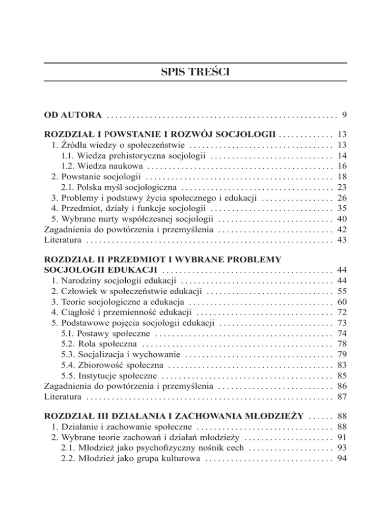 Spis treści Od autora . . . . . . . . . . . . . . . . . . . . . . . . . . . . . . . . . . . . . . . . . . . . . . . . . . . . . . 9 Rozdział I Powstanie i rozwój socjologii . . . . . . . . . . . . . 1. Źródła wiedzy o społeczeństwie . . . . . . . . . . . . . . . . . . . . . . . . . . . . . . . . . . 1.1. Wiedza prehistoryczna socjologii . . . . . . . . . . . . . . . . . . . . . . . . . . . . . 1.2. Wiedza naukowa . . . . . . . . . . . . . . . . . . . . . . . . . . . . . . . . . . . . . . . . . . . . 2. Powstanie socjologii . . . . . . . . . . . . . . . . . . . . . . . . . . . . . . . . . . . . . . . . . . . . 2.1. Polska myśl socjologiczna . . . . . . . . . . . . . . . . . . . . . . . . . . . . . . . . . . . . 3. Problemy i podstawy życia społecznego i edukacji . . . . . . . . . . . . . . . . . 4. Przedmiot, działy i funkcje socjologii . . . . . . . . . . . . . . . . . . . . . . . . . . . . . 5. Wybrane nurty współczesnej socjologii . . . . . . . . . . . . . . . . . . . . . . . . . . . Zagadnienia do powtórzenia i przemyślenia . . . . . . . . . . . . . . . . . . . . . . . . . . . Literatura . . . . . . . . . . . . . . . . . . . . . . . . . . . . . . . . . . . . . . . . . . . . . . . . . . . . . . . . . . 13 13 14 16 18 23 26 35 40 42 43 Rozdział II Przedmiot i wybrane problemy socjologii edukacji . . . . . . . . . . . . . . . . . . . . . . . . . . . . . . . . . . . . . . . . 1. Narodziny socjologii edukacji . . . . . . . . . . . . . . . . . . . . . . . . . . . . . . . . . . . . 2. Człowiek w społeczeństwie edukacji . . . . . . . . . . . . . . . . . . . . . . . . . . . . . . 3. Teorie socjologiczne a edukacja . . . . . . . . . . . . . . . . . . . . . . . . . . . . . . . . . . 4. Ciągłość i przemienność edukacji . . . . . . . . . . . . . . . . . . . . . . . . . . . . . . . . 5. Podstawowe pojęcia socjologii edukacji . . . . . . . . . . . . . . . . . . . . . . . . . . . 5.1. Postawy społeczne . . . . . . . . . . . . . . . . . . . . . . . . . . . . . . . . . . . . . . . . . . 5.2. Rola społeczna . . . . . . . . . . . . . . . . . . . . . . . . . . . . . . . . . . . . . . . . . . . . . 5.3. Socjalizacja i wychowanie . . . . . . . . . . . . . . . . . . . . . . . . . . . . . . . . . . . 5.4. Zbiorowość społeczna . . . . . . . . . . . . . . . . . . . . . . . . . . . . . . . . . . . . . . . 5.5. Instytucje społeczne . . . . . . . . . . . . . . . . . . . . . . . . . . . . . . . . . . . . . . . . Zagadnienia do powtórzenia i przemyślenia . . . . . . . . . . . . . . . . . . . . . . . . . . . Literatura . . . . . . . . . . . . . . . . . . . . . . . . . . . . . . . . . . . . . . . . . . . . . . . . . . . . . . . . . . 44 44 55 60 72 73 74 78 79 83 85 86 87 Rozdział III działania i zachowania młodzieży . . . . . . 1. Działanie i zachowanie społeczne . . . . . . . . . . . . . . . . . . . . . . . . . . . . . . . . 2. Wybrane teorie zachowań i działań młodzieży . . . . . . . . . . . . . . . . . . . . . 2.1. Młodzież jako psychofizyczny nośnik cech . . . . . . . . . . . . . . . . . . . . 2.2. Młodzież jako grupa kulturowa . . . . . . . . . . . . . . . . . . . . . . . . . . . . . . 88 88 91 93 94 Spis treści 2.3. Młodzież jako podmiot i przedmiot działań . . . . . . . . . . . . . . . . . . . . 97 2.4. Młodzież jako globalna zbiorowość w ujęciu socjoglobalistyki . . . . . . . . . . . . . . . . . . . . . . . . . . . . . . . . . . . . . . . . . . 100 3. Środowisko społeczne jako przestrzeń działań . . . . . . . . . . . . . . . . . . . . 102 3.1. Środowisko naturalne człowieka . . . . . . . . . . . . . . . . . . . . . . . . . . . . 103 3.2. Środowisko społeczne . . . . . . . . . . . . . . . . . . . . . . . . . . . . . . . . . . . . . . 104 3.3. Środowisko wychowawcze . . . . . . . . . . . . . . . . . . . . . . . . . . . . . . . . . 106 4. Pozycja i status społeczny młodzieży . . . . . . . . . . . . . . . . . . . . . . . . . . . . 108 4.1. Stratyfikacja społeczna młodzieży . . . . . . . . . . . . . . . . . . . . . . . . . . . 109 4.2. Podmiotowe cechy wartości młodzieży . . . . . . . . . . . . . . . . . . . . . . . 110 4.3. Identyfikacja i tożsamość społeczna młodzieży . . . . . . . . . . . . . . . . 112 Zagadnienia do powtórzenia i przemyślenia . . . . . . . . . . . . . . . . . . . . . . . . . . 115 Literatura . . . . . . . . . . . . . . . . . . . . . . . . . . . . . . . . . . . . . . . . . . . . . . . . . . . . . . . . . 115 Rozdział IV Kształtowanie osobowości społecznej . . . . . . . . . . . . . . . . . . . . . . . . . . . . . . . . . . . . . . . . . . . . . . . . . . . 1. Pojęcie osobowości. Kształtowanie się osobowości . . . . . . . . . . . . . . . . 2. Elementy składowe osobowości . . . . . . . . . . . . . . . . . . . . . . . . . . . . . . . . . 3. Typy osobowości . . . . . . . . . . . . . . . . . . . . . . . . . . . . . . . . . . . . . . . . . . . . . . 4. Rozwój osobowości dzieci na przełomie okresu przedszkolnego i szkolnego . . . . . . . . . . . . . . . . . . . . . . . . . . . . . . . . . . . . . . . . . . . . . . . . . . . 5. Kształtowanie się osobowości w okresie dorastania . . . . . . . . . . . . . . . 6. Strukturalne uwarunkowania osobowości . . . . . . . . . . . . . . . . . . . . . . . . . 7. Działania aspołeczne i jego przejawy . . . . . . . . . . . . . . . . . . . . . . . . . . . . Zagadnienia do powtórzenia i przemyślenia . . . . . . . . . . . . . . . . . . . . . . . . . . Literatura . . . . . . . . . . . . . . . . . . . . . . . . . . . . . . . . . . . . . . . . . . . . . . . . . . . . . . . . . 122 124 125 126 136 137 Rozdział V Socjologiczne aspekty interakcji i socjalizacja młodzieży . . . . . . . . . . . . . . . . . . . . . . . . . . . . . . . . . 1. Interakcja społeczna i jej rozumienie . . . . . . . . . . . . . . . . . . . . . . . . . . . . 2. Teorie interakcji społecznej . . . . . . . . . . . . . . . . . . . . . . . . . . . . . . . . . . . . . 2.1. Interakcjonizm symboliczn