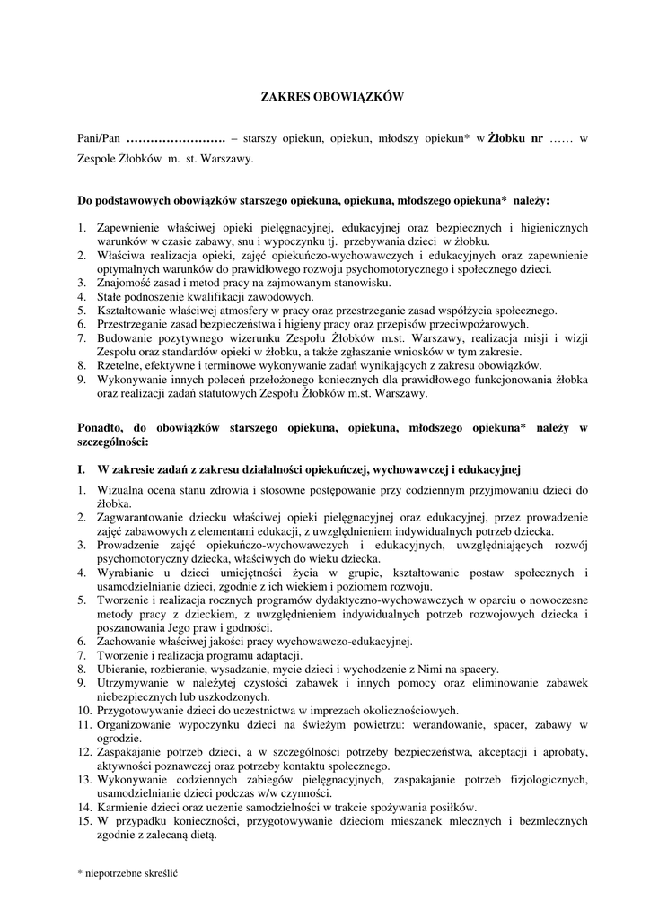 ZAKRES OBOWI ZKÓW Pani/Pan - Zespół Żłobków m. st. Warszawy