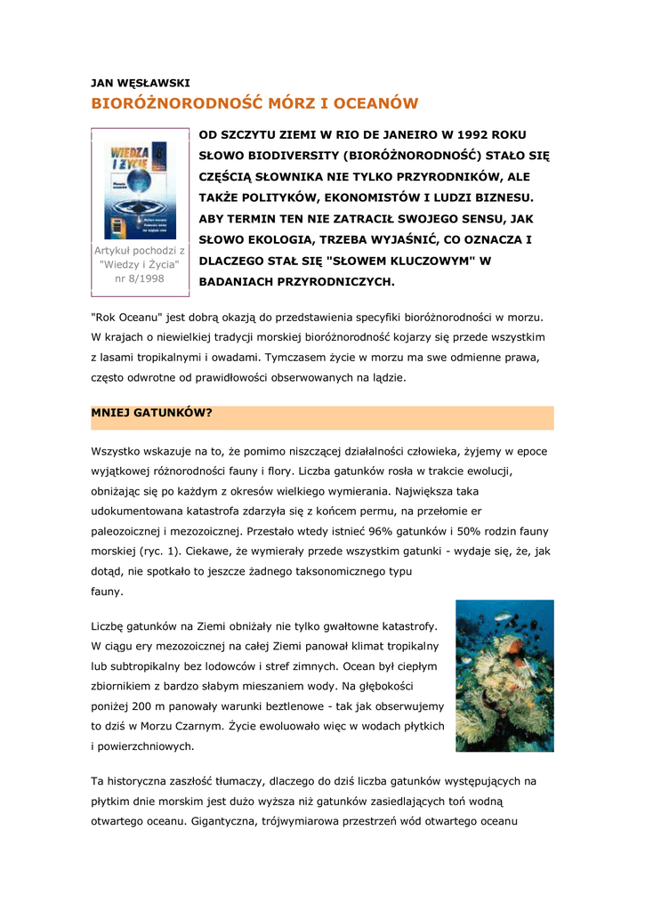 JAN WĘSŁAWSKI BIORÓŻNORODNOŚĆ MÓRZ I OCEANÓW OD SZCZYTU ZIEMI W RIO DE JANEIRO W 1992 ROKU SŁOWO BIODIVERSITY (BIORÓŻNORODNOŚĆ) STAŁO SIĘ CZĘŚCIĄ SŁOWNIKA NIE TYLKO PRZYRODNIKÓW, ALE TAKŻE POLITYKÓW, EKONOMISTÓW I LUDZI BIZNESU. ABY TERMIN TEN NIE ZATRACIŁ SWOJEGO SENSU, JAK Artykuł pochodzi z "Wiedzy i Życia" nr 8/1998 SŁOWO EKOLOGIA, TRZEBA WYJAŚNIĆ, CO OZNACZA I DLACZEGO STAŁ SIĘ "SŁOWEM KLUCZOWYM" W BADANIACH PRZYRODNICZYCH. "Rok Oceanu" jest dobrą okazją do przedstawienia specyfiki bioróżnorodności w morzu. W krajach o niewielkiej tradycji morskiej bioróżnorodność kojarzy się przede wszystkim z lasami tropikalnymi i owadami. Tymczasem życie w morzu ma swe odmienne prawa, często odwrotne od prawidłowości obserwowanych na lądzie. MNIEJ GATUNKÓW? Wszystko wskazuje na to, że pomimo niszczącej działalności człowieka, żyjemy w epoce wyjątkowej różnorodności fauny i flory. Liczba gatunków rosła w trakcie ewolucji, obniżając się po każdym z okresów wielkiego wymierania. Największa taka udokumentowana katastrofa zdarzyła się z końcem permu, na przełomie er paleozoicznej i mezozoicznej. Przestało wtedy istnieć 96% gatunków i 50% rodzin fauny morskiej (ryc. 1). Ciekawe, że wymierały przede wszystkim gatunki - wydaje się, że, jak dotąd, nie spotkało to jeszcze żadnego taksonomicznego typu fauny. Liczbę gatunków na Ziemi obniżały nie tylko gwałtowne katastrofy. W ciągu ery mezozoicznej na całej Ziemi panował klimat tropikalny lub subtropikalny bez lodowców i stref zimnych. Ocean był ciepłym zbiornikiem z bardzo słabym mieszaniem wody. Na głębokości poniżej 200 m panowały warunki beztlenowe - tak jak obserwujemy to dziś w Morzu Czarnym. Życie ewoluowało więc w wodach płytkich i powierzchniowych. Ta historyczna zaszłość tłumaczy, dlaczego do dziś liczba gatunków występujących na płytkim dnie morskim jest dużo wyższa niż gatunków zasiedlających toń wodną otwartego oceanu. Gigantyczna, trójwymiarowa przestrzeń wód otwartego oceanu zamieszkana jest tylko przez około 1200 gatunków ryb, podczas gdy w wąskim pasie wód przybrzeżnych żyje ponad 13 tys. gatunków. Pionowe mieszanie wód oceanu, które umożliwia dopływ natlenionych wód do jego głębin, umożliwiając ekspansję fauny, rozpoczęło się dopiero w czasie trzeciorzędowego oziębienia klimatu. PRAWIDŁOWOŚCI CZY NASZE PRZYZWYCZAJENIA? Historia poznania przyrody ożywionej obszarów lądowych jest znacznie starsza niż badania mórz i oceanów, prowadzone zaledwie od około stu lat. W efekcie niemal wszystkie prawa nowoczesnej ekologii, które powstały w oparciu o obserwacje ekosystemów lądowych, bardzo często zawodzą przy próbie interpretacji zjawisk w morzu. Podobnie to, co wiemy o prawach rządzących bioróżnorodnością na lądzie, nie zawsze zgadza się z obserwacjami zróżnicowania fauny i flory w oceanie. Ryc. 1. Wzrost zróżnicowania biologicznego fauny w trakcie ewolucji wyrażony liczbą rodzin zwierząt morskich. Wyraźnie widać epizody wielkiego wymierania Wydaje się, że jednym z najbardziej oczywistych przejawów ludzkiego przyzwyczajenia w myśleniu jest geograficzny gradient bioróżnorodności. W kierunku północ-południe liczba gatunków np. drzew, motyli czy ptaków rośnie gwałtownie od bieguna ku równikowi. W morzu podobną prawidłowość obserwujemy właściwie tylko u fauny zasiedlającej skaliste płycizny. Inne grupy ekologiczne (taksonomiczne) są najbardziej zróżnicowane w strefie umiarkowanej (np. makrofity), antarktycznej (np. skorupiaki równonogie - Isopoda) lub - jak skorupiaki obunogie (Amphipoda) - liczą sobie po około 1000 gatunków w każdej ze stref klimatycznych (ryc. 2). Badania, prowadzone przy użyciu standardowych metod, wykazały, że jeżeli porównamy siedlisko charakteryzujące się podobną głębokością i podobnym rodzajem dna, różnorodność fauny będzie niemal identyczna w tropikach, strefie umiarkowanej i Arktyce. W przeciwieństwie do kierunku północ-południe, mało kto wie o występowaniu gradientu geograficznego wschód-zachód. Przejawia się on tym, żeże w obrębie morskich stref tropikalnej i subtropikalnej obserwowany jest spadek liczby gatunków koralowców i ryb w miarę oddalania się od wschodniej granicy Oceanu Indyjskiego. Jest to najprawdopodobniej wpływ zaawansowanego wieku ewolucyjnego tego obszaru - im starszy obszar, tym więcej gatunków go zamieszkuje. Najsłabiej poznany został gradient głębokościowy, ponieważ nasza wiedza o faunie głębinowej jest w fazie embrionalnej. Zdaniem niektórych badaczy, w strefie najgłębszych wód może występować wielka liczba nieznanych nauce gatunków (ryc. 3). Na przykład z 21 m2 łącznej powierzchni dna północnego Atlantyku, leżącego na głębokości 2000 m, wydobyto próbki osadu, w których oznaczono aż 800 różnych gatunków makrofauny. Inni podkreślają, że wprawdzie zróżnicowanie mierzo-ne liczbą gatunków przypadającą na 100 losowo schwytanych osobników jest rzeczywiście największe w głębinach, jednak zagęszczenia fauny głębinowej są tak niskie, że całkowita liczba gatunków jest największa w wodach szelfowych i przybrzeżnych. Ryc. 2. Zależność liczby gatunków morskich od strefy klimatycznej Jednym z koronnych argumentów na rzecz ochrony bioróżnorodności był jej związek ze stabilnością i produktywnością ekosystemu. Im bardziej złożony jest ekosystem, tym lepiej buforuje zmiany środowiska (stresy) i tym skuteczniej zwiększa produkcję biomasy - jako przykład tego mechanizmu podaje się stary las, przeciwstawiony monokulturze szkółki leśnej. Ta teoria nie zawsze sprawdza się w morzu. Najbardziej złożony ekosystem raf koralowych jest bardzo wrażliwy na zaburzenia warunków środowiska i mało produktywny. Z kolei, najprostsze ekosystemy mulistego wybrzeża czy plaż piaszczystych mają wielką zdolność regenerac