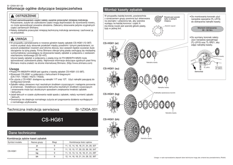 SI-1ZX0A-001-03 Informacje ogólne dotyczące bezpieczeństwa OSTRZEŻENIE • Przed zamontowaniem części należy uważnie przeczytać niniejszą instrukcję. Poluzowane, zużyte lub uszkodzone części mogą doprowadzić do wywrócenia roweru, co może spowodować poważne obrażenia. Zalecamy stosowanie jedynie oryginalnych części zamiennych Shimano. • Należy dokładnie przeczytać niniejszą techniczną instrukcję serwisową i zachować ją na przyszłość. Montaż kasety zębatek W przypadku każdej koronki, powierzchnia z oznaczeniem grupy powinna być skierowana na zewnątrz i ustawiona tak, aby szerokie występy na każdej koronce i część A (na której rowek jest szeroki) główki piasty, były w jednej linii. A Rowek jest szeroki tylko w jednym miejscu. Szeroki wypust ac -14T Moment dokręcania: 30 - 50 Nm • Do wymiany koronek należy użyć narzędzia specjalnego (TL-LR15) oraz TL-SR21, aby zdjąć nakrętkę kasety. UWAGA ba HYP A NO ER CK LO aQ 4 0 0 kg /c m ar IM U .S . PA T 4268 25 9 ap G Nakrętka kasety Nakrętka kasety TL-LR15 34T Narzędzie (TL-SR21) Demontaż 30T T 17 23T 20T 26T 13T P ER G L I D E HY T 11 as 15 T au CS -M 96 au au AN JA P as as 9S 0 11T asap ap ap as as as ap as Nakrętka kasety Podkładka dystansowa koronki ar aQ ap 12T AN JA P ba ar aQ ap CS ba 16T 11T ba P ER G L I D E HY 0 ar 11 T ar 9S 9S aQ ba 13 T 96 14 T -M CS-HG61 (bg) aQ • Piasta FH-M629/FH-M529 jest zgodna z kasetą zębatek CS-HG61 (12-36T). • Stosować CS-HG61 w połączeniu z łańcuchami 9-biegowymi (CN-7701 / HG93 / HG73 / HG53). • Do użycia z CS-HG61 dostępne są nakrętki 11T oraz 12T. Użyć nakrętki pasującej do konfiguracji koronek. • Zębatki należy okresowo myć neutralnym środkiem czyszczącym i następnie ponownie je smarować. Dodatkowo czyszczenie łańcucha neutralnym środkiem czyszczącym i smarowanie może być skutecznym sposobem zwiększenia trwałości zębatek i łańcucha. • Jeżeli łańcuch w czasie użytkowania nadal spada z zębatek, należy wymienić zębatki i łańcuch. • Gwarancja nie obejmuje normalnego zużycia ani pogorszenia działania wynikających z normalnego użytkowania. H AN CS-HG61 (au) S J AP Uwaga 14 T - C CS-HG61 (ar) DE L I • W przypadku zainstalowania w rowerze górskim kasety zębatek CS-HG61 (12-36T) można uzyskać duży stosunek przełożeń między przednimi i tylnymi pierścieniami, co pozwoli podjeżdżać rowerem pod strome zbocza, lecz zarazem będzie wywierać duże obciążenie na tylną piastę. Firma Shimano oferuje tylną piastę cechującą się niezbędną wytrzymałością i pozwalającą na stosowanie kasety zębatek w połączeniu z zestawem mechanizmu korbowego (22-32-44T). Użycie kasety zębatek w połączeniu z piastą inną niż FH-M629/FH-M529 może spowodować uszkodzenie piasty. Najnowsze informacje dotyczące zgodnych piast firmy Shimano można znaleźć na stronie internetowej Shimano. (http://www.shimano.com) • Do montowania koronek użyć narzędzie specjalne (TL-LR15) do dokręcenia nakrętki kasety. Techniczna instrukcja serwisowa SI-1ZX0A-001 Nakrętka kasety CS-HG61 CS-HG61 (bh) ar aQ AN JA P ar aQ ap 11T 12T 0 ap 96 aQ -M CS-HG61 CS Kombinacja zębów kaset zębatek Symbol modelu 16T Dane techniczne P ER G L I D E HY ar ba ba 34T ba 14 T Nakrętka kasety Nazwa grupy Biegi Kombinacja ilości zębów ar 9 11, 12, 14, 16, 18, 21, 24, 28, 32T au 9 11, 13, 15, 17, 20, 23, 26, 30, 34T bg 9 11, 12, 13, 14, 16, 18, 21, 24, 28T bh 9 12, 14, 16, 18, 21, 24, 28, 32, 36T Uwaga: w razie wprowadzenia ulepszeń dane techniczne mogą ulec zmianie bez powiadomienia. (Polish)