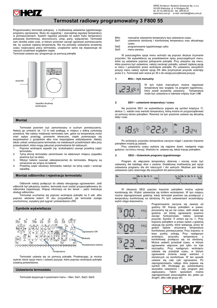 HERZ Armatura i Systemy Grzewcze Sp. z o.o. 32-020 Wieliczka, ul. A Grottgera 58 tel. (0-12) 289-02-20, fax. 289-02-21 www.herz.com.pl e-mail: [email protected] Termostat radiowy programowalny 3 F800 55 Programowalny termostat pokojowy z możliwością ustawienia tygodniowego programu ogrzewania. Służy do wygodnej i oszczędnej regulacji temperatury w pomieszczeniach. System regulacji pozwala na wybór trybu temperatury pokojowej (komfortowy, ekonomiczny, urlop, party, wyłączenie). Termostat sam określa sobie czas, w którym powinien zacząć ogrzewać pomieszczenie tak, by uzyskać żądaną temperaturę. Nie ma potrzeby ustawiania wcześniej czasu rozpoczęcia pracy termostatu, urządzenie samo się dopasowuje do naszych oczekiwań względem ciepła. Termostat ustawia się i programuje za pomocą pokrętła. termostat MAn Set1 Set2 Set3 W poszczególne opcje menu wchodzi się poprzez dłuższe trzymanie przycisku. Na wyświetlaczu są przedstawione opisy poszczególnych menu, które są ustawiane poprzez pokręcanie pokrętła. Przy ukazaniu się menu, które powinno być ustawione, należy nacisnąć pokrętło, ustawić żądaną opcję w menu I potwierdzić przez wciśnięcie pokrętła. Po ustawieniu wszystkich pozycji menu należy wybrać opcję OK albo przytrzymać przycisk wciśnięty przez 2 s. Termostat sam wraca po 30 s do swojej początkowej pozycji. 1. przycisk manualne ustawienie temperatury bez ustawiania czasu ustawienie obniżonej i komfortowej temperatury oraz aktualnego czasu programowanie tygodniowego cyklu menu serwisu MAn – tryb manualny W tym trybie manualnym można regulować temperaturę bez względu na program tygodniowy, który został wcześniej ustawiony. Temperatura może być ustawiana w zakresie między t Lo i t Hi. 2. zapadka obudowy zamknięcie SEt1 – ustawianie temperatury i czasu Na poziomie SEt1 na wyświetlaczu pojawia się symbol księżyca , słońca ☼, walizki oraz wartość temperatury, którą można im przyporządkować za pomocą obrotu pokrętłem. Również na tym poziomie ustawia się aktualną datę i czas. Montaż Termostat powinien być zamontowany w suchym pomieszczeniu. Należy go umieścić ok. 1,5 m nad podłogą, w miejscu z dobrą cyrkulacją powietrza. Nie należy instalować termostatu tam, gdzie na temperaturę może mieć wpływ przeciąg, promienie słoneczne, ciepło przenoszące się bezpośrednio z grzejników albo inne niepożądane oddziaływanie. Należy także unikać umieszczania termostatu na metalowych przedmiotach albo przy przeszkodach, które mogą zaburzać przechodzenie fal radiowych. 1. Poprzez wciśnięcie zapadki (np. śrubokrętem) usunąć przednią część termostatu. 2. Tylną stronę termostatu zamontować na właściwym miejscu (zapadka powinna być na dole). 3. Włożyć baterie (usunąć zabezpieczenie) do termostatu. Bieguny są oznaczone we wnęce na baterie. 4. Przednią część obudowy termostatu nałożyć na tylną część i wcisnąć zapadkę. Po wciśnięciu przycisku temperatura zaczyna migać i poprzez kręcenie pokrętłem można ją ustawić. Przy ustawianiu czasu wybiera się najpierw dzień, następnie miga godzina i na końcu minuty. Wartości te ustawia się, także kręcąc pokrętłem. 3. SEt2 – Ustawianie programu tygodniowego Program do włączania temperatury dziennej i nocnej może być ustawiany dla każdego dnia z osobna. Dodatkową możliwością jest opcja ustawienia programu dla dni roboczych i dni wolnych. Możliwe jest także ustawienie cyklu dziennego dla wszystkich dni jednocześnie. Montaż odbiornika i rejestracja termostatu Odbiornik należy podłączyć do układu sterującego ogrzewaniem. Jeśli odbiornik był zakupiony osobno, termostat musi zostać przyporządkowany do odbiornika (rejestracja). Więcej informacji na ten temat – patrz Instrukcja obsługi odbiornika. Termostat uruchamia się poprzez wciśnięcie pokrętła na 5 sek. albo poprzez włożenie baterii. W obu przypadkach, jak termostat zostaje uruchomiony, wysyłany jest sygnał i potwierdzenie LRN. Symbole wyświetlacza Ogrzewanie ON Blokada Rozładowana bateria Temperatura Termostat ustawia się za pomocą pokrętła. Przekręcając, je można wybrać różne opcje menu i ustawić pozycje, które poprzez wciśnięcie pokrętła zostaną potwierdzone. Ustawienia termostatu Termostat dysponuje 4 poziomami menu – Man, Set1, Set2 i Set3: W obszarze SEt2 poprzez kręcenie pokrętłem można wybrać kombinację dni. Wybór zatwierdza się krótkim wciśnięciem. W tym miejscu można zaprogramować godzinę, kiedy termostat powinien się przełączyć z temperatury komfortowej na obniżoną. Po tych ustawieniach wcześniejszy wybór ulega skasowaniu. Programowanie zaczyna się zawsze od godziny 00. Kręcąc pokrętłem w prawo, poruszamy się po osi czasu. Jeśli ukaże się godzina, od której ogrzewanie powinno zacząć funkcjonować, należy wcisnąć przycisk. Symbol zmieni się na ☼. Przy kręceniu pokrętłem w prawo razem z godziną ukazują się punkty, które wskazują, przez ile godzin będzie utrzymana temperatura komfortowa pomieszczenia. Przy kręceniu w lewo punkty znikają. Przy następnym wciśnięciu przycisku temperatura z komfortowej przełącza się na obniżoną. Można ustawić przedział czasu, w którym ogrzewanie włączone jest tylko na tryb oszczędny. Przy następnym wciśnięciu ustawia się przedział czasu, w którym ogrzewanie zmienia swoje wartości z obniżonych na komfortowe. W ten sposób ustawia się cały cykl ogrzewania. Po zaprogramowaniu całego dnia pojawia się symbol OK. Wciskając go, potwierdzamy wszystkie ustawienia i cały program jest zapisywany. Takim sposobem można zaprogramować poszczególne dni, jeden po drugim, albo całe grupy dni. 4. Termostat reguluje wartość do tej temperatury aż w ustawieniach (lub ręcznie). Można również ustawić (na wyświetlaczu symbol walizki) termostat do trybu W trybie termostat wskazuje aktualną